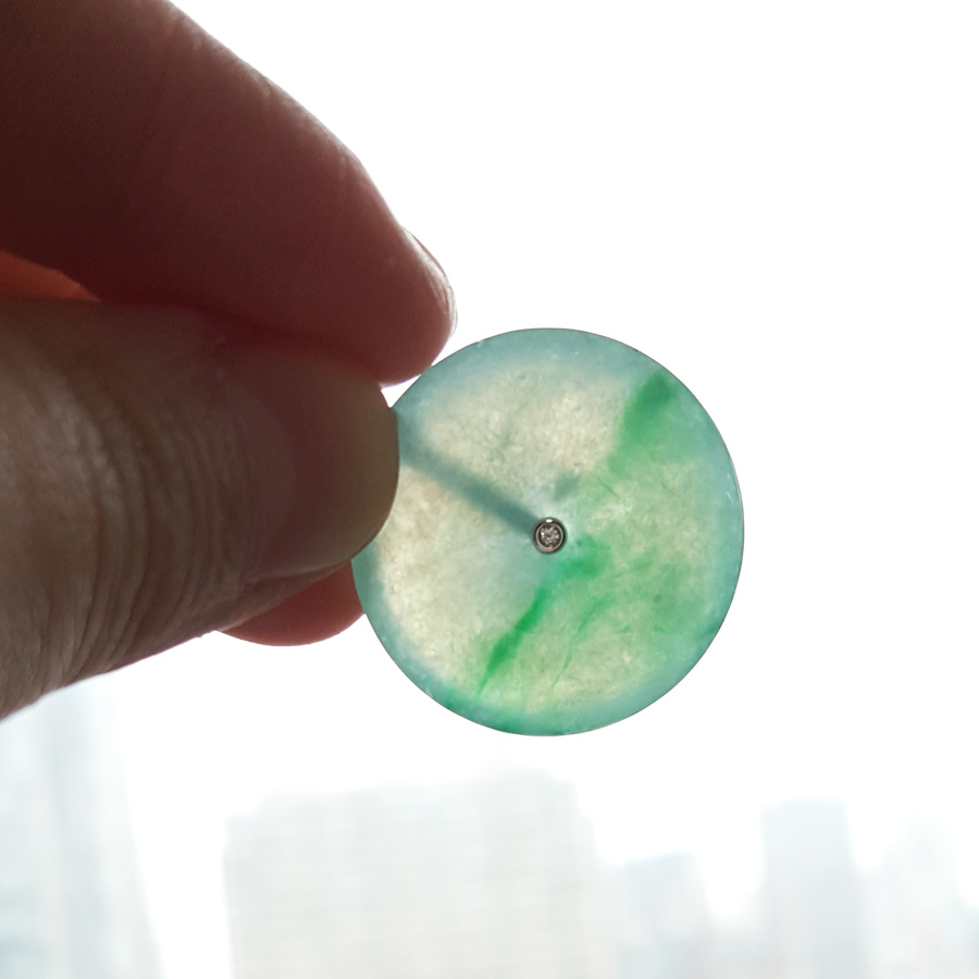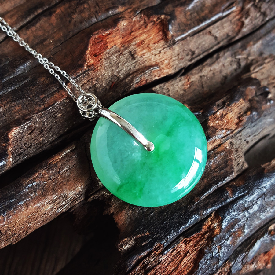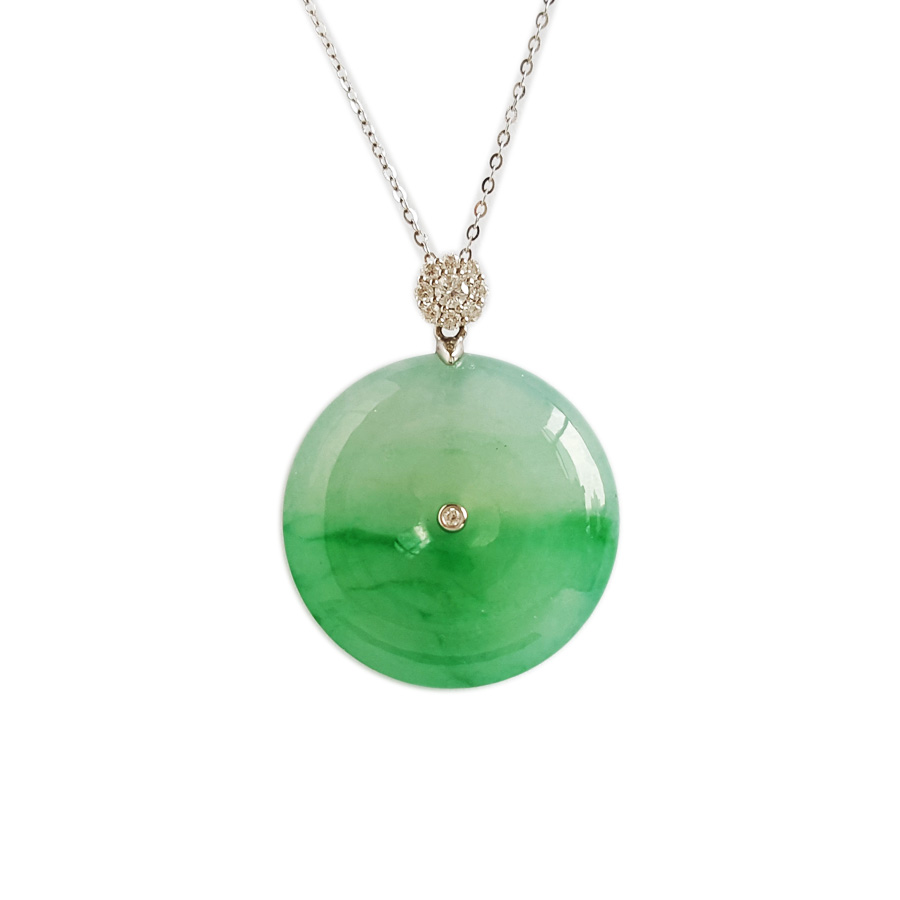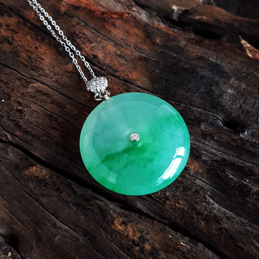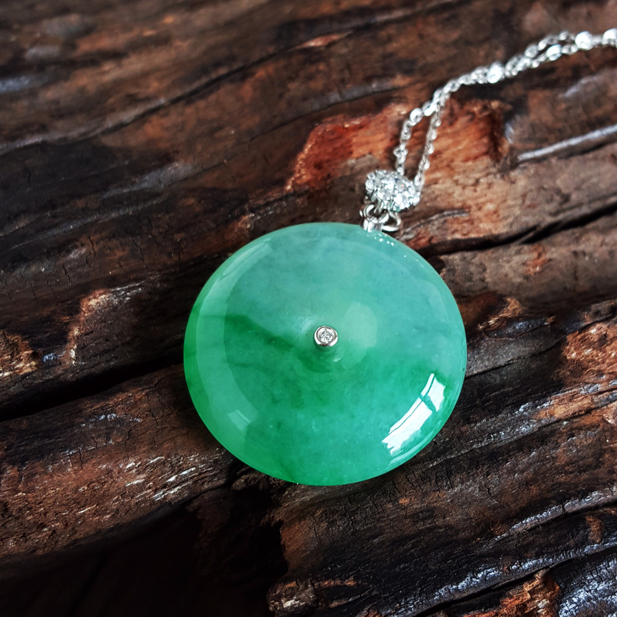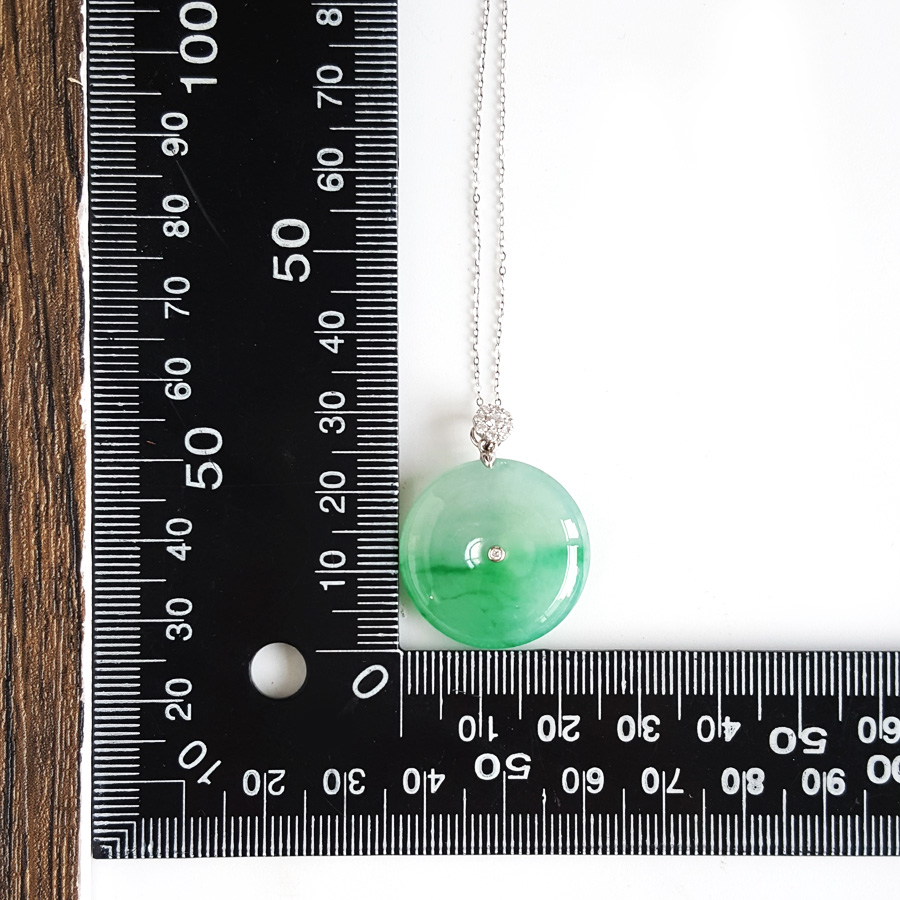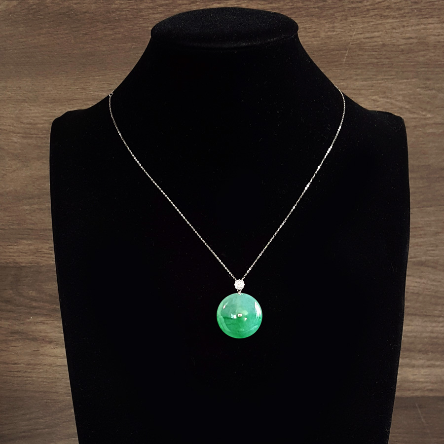 名称 | AU750白金镶钻镶天然细腻飘辣阳绿冰种平安扣翡翠吊坠项链 |