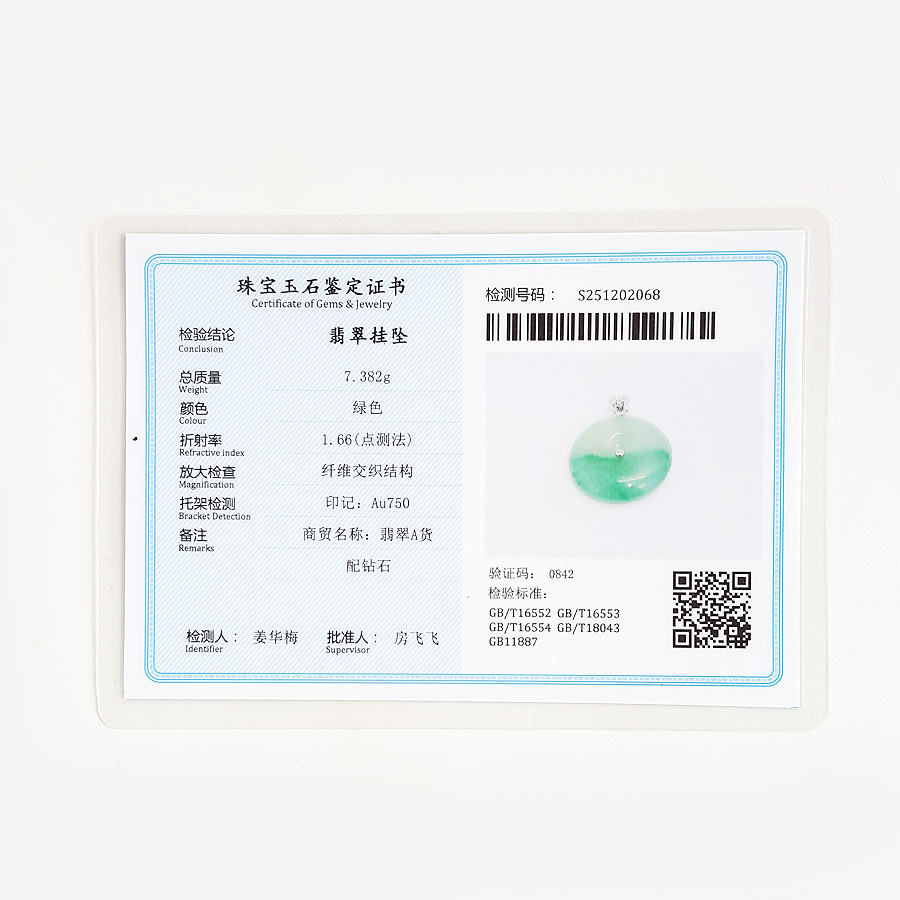 【天然正品】A货翡翠AU750白金镶钻镶天然细腻飘辣阳绿冰种平安扣翡翠吊坠项链链长:45CM(长度可调节)301225NJM19