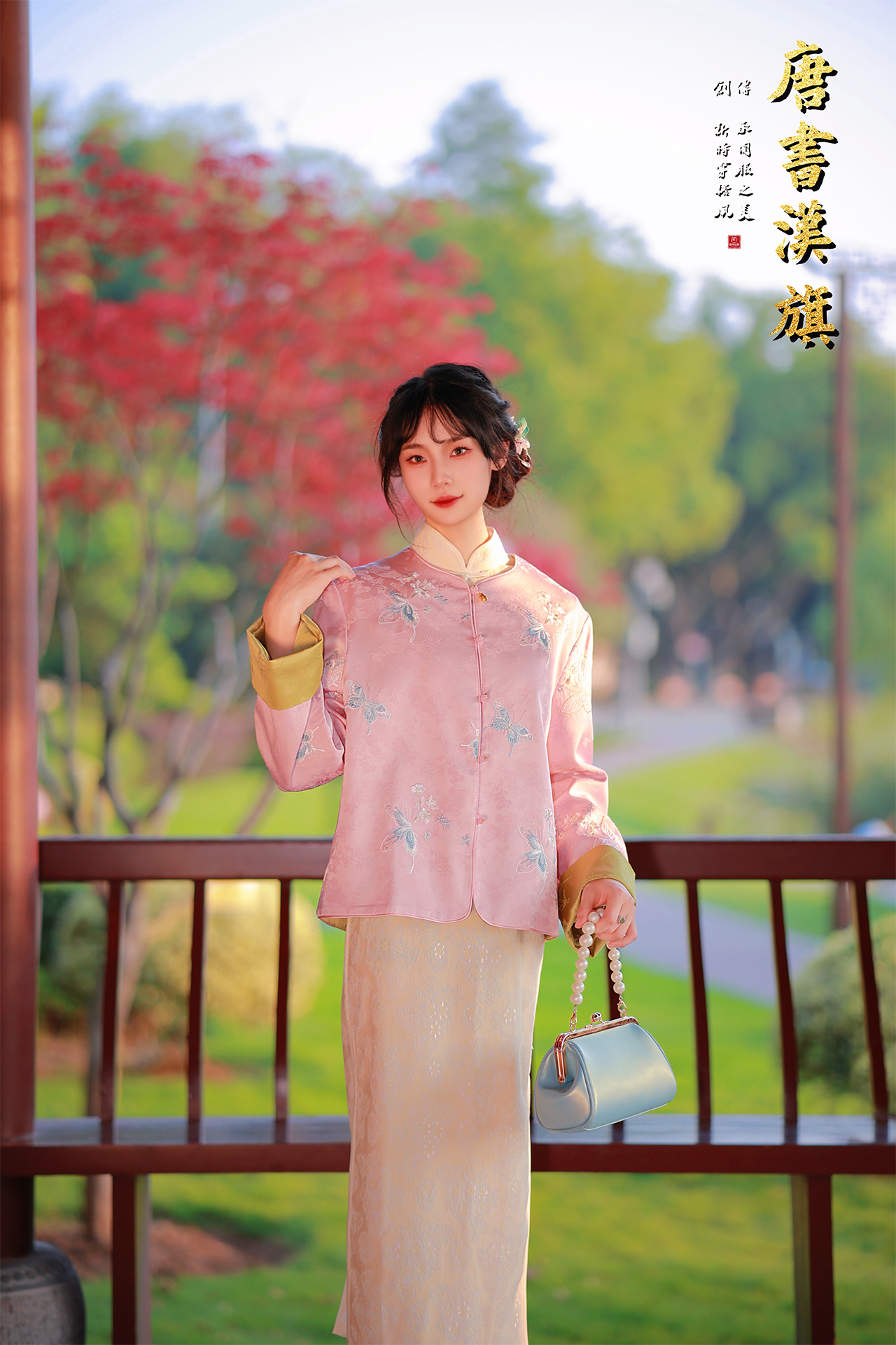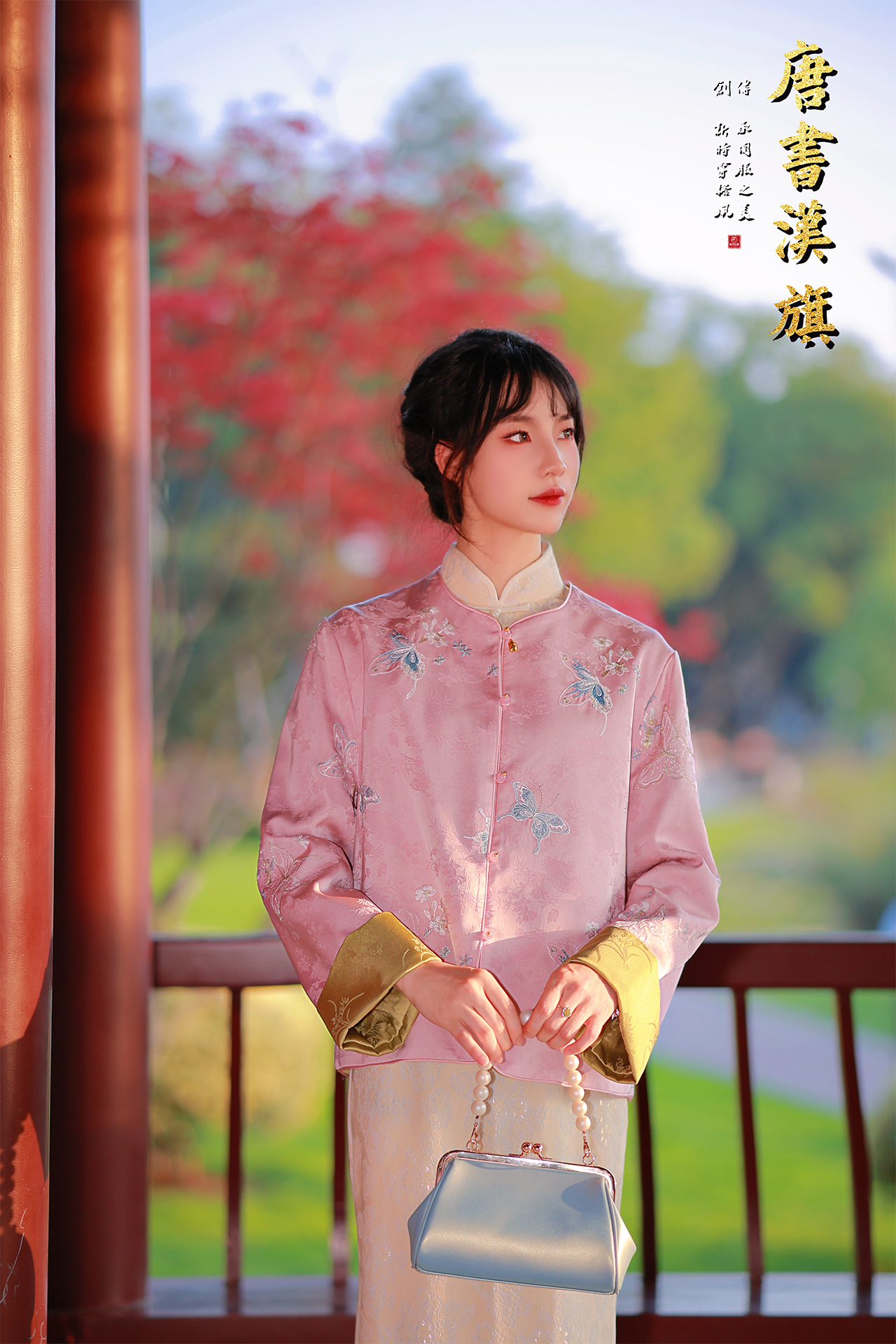 【蝶语双生】桃粉刺绣中式短衫,撷取江南春韵,织就国风雅致。 衣身以柔润桃粉为底,满幅绣制清透蓝蝶纹样,灵动翩跹;领口衬米黄立领,袖口翻折暖金缎面