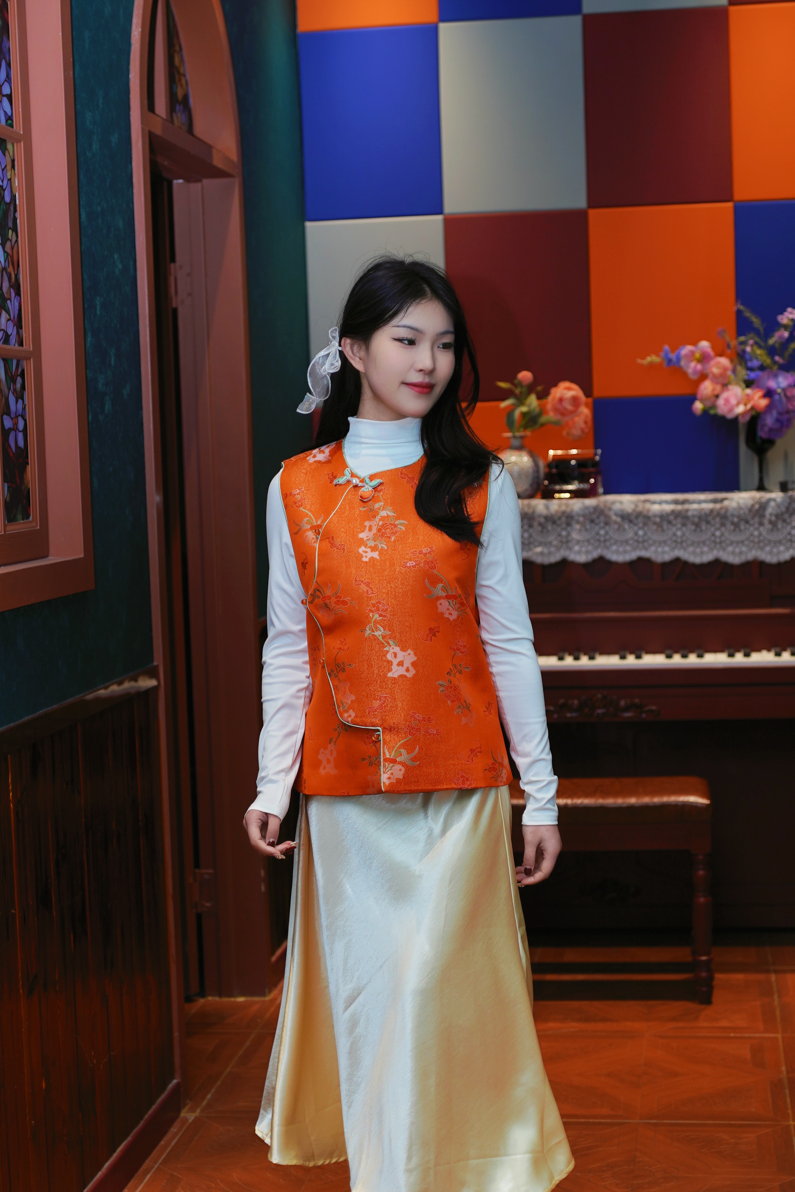 【木蔓秋诗】林深见鹿橙色拼接设计织锦冬款保暖旗袍