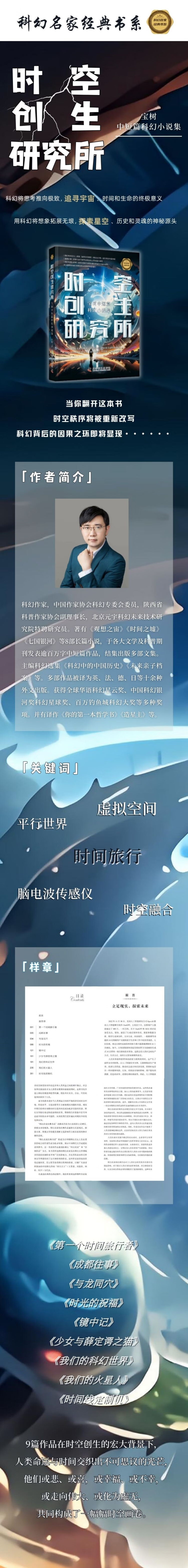 《时空创生研究所》精选了科幻作家宝树的中短篇作品。本书将把时间和空间贯穿始终,所选中短篇之间前后相续,内容和逻辑上相呼应。篇目包括《第一个时间旅行者》《成都往事》《与龙同穴》《时光的祝福》《少女与薛定谔之猫》《我们的科幻世界》《我们的火星人》《时间线定制机》。《第一个时间旅行者》讲述了一个被困于1分钟时空内男子的奇遇故事。《成都往事》曾获第30届中国科幻“银河奖”最佳短篇小说奖,它讲述了站在成都的历史脉络上的两个人的相逢和追逐的故事。上下三千年的历史是该小说的华丽背景。时间穿越与逆向相逢、命中注定和后知后觉构成了文章巧妙的设计。《我们的科幻世界》是以谢宝舒为主角的自传回忆体科幻小说,想象了作者与《科幻世界》杂志前世今生的故事。谢宝舒意外地在星光书店获得店主沈星光的帮助,进入梦之箱,看到了自己美梦成真的未来,但是沈星光却间接地因此死亡。沈星光的女儿想重新救回父亲,然而“我”却渐渐明白了沈星光的用意,科幻世界就是我们的世界,包含无限未知的可能。