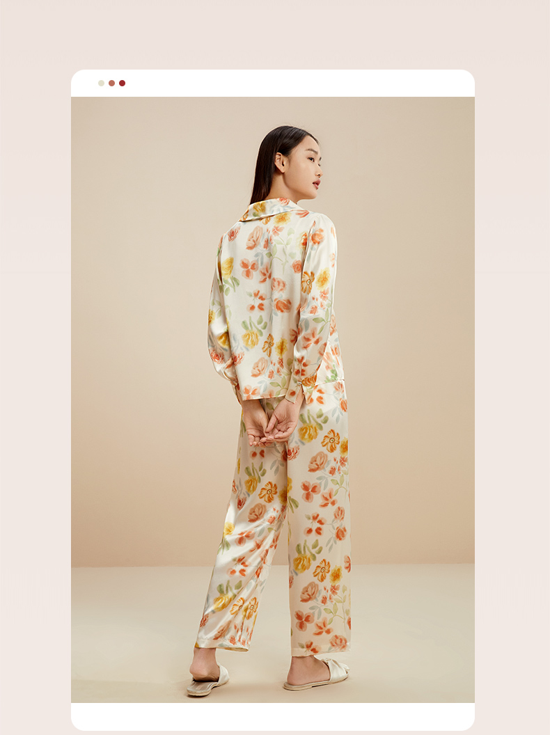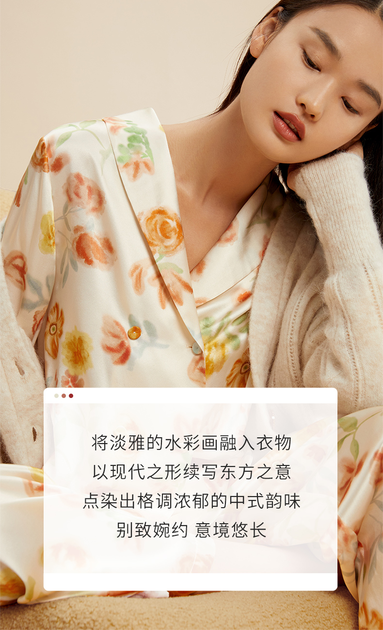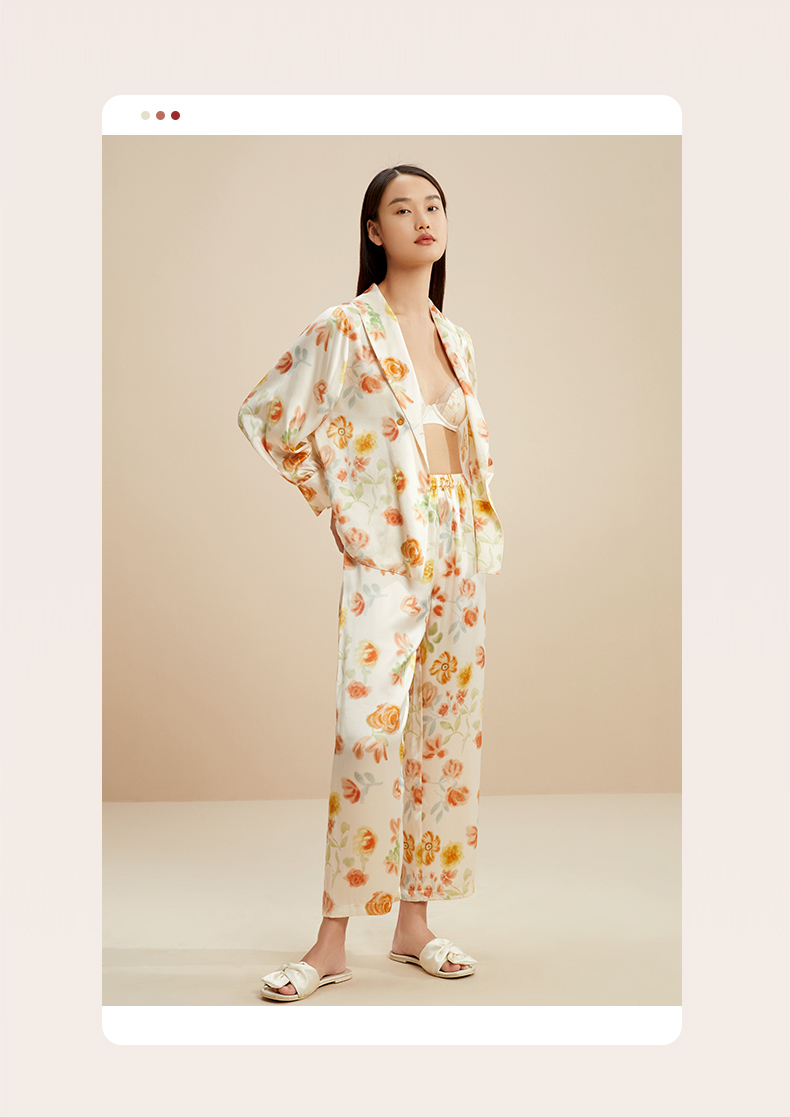 金三塔100%桑蚕丝女士真丝睡衣印花拼刺绣蕾丝双排扣时尚家居服 YSFCC202