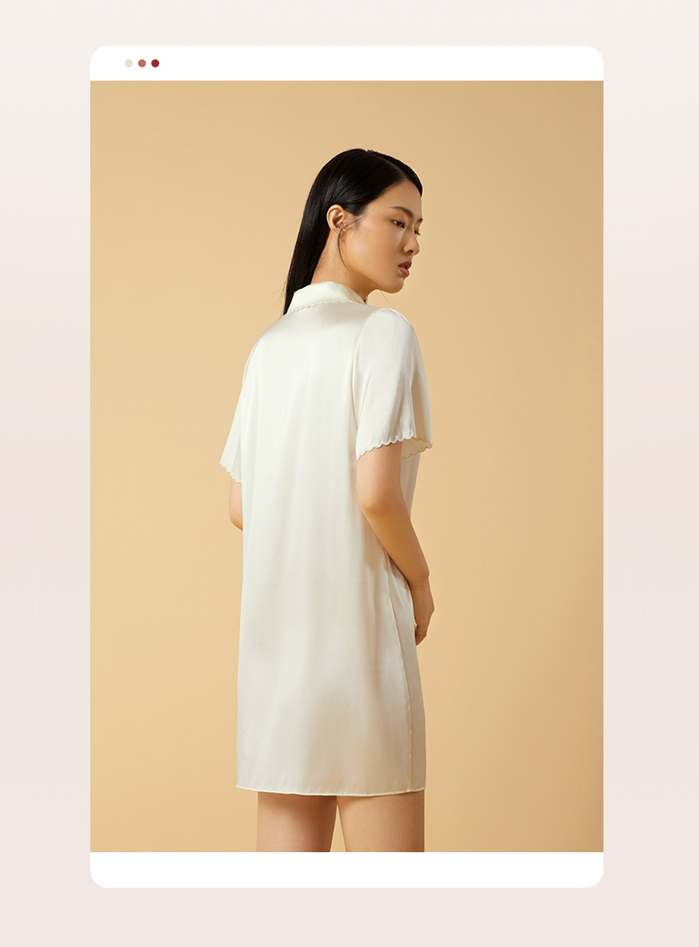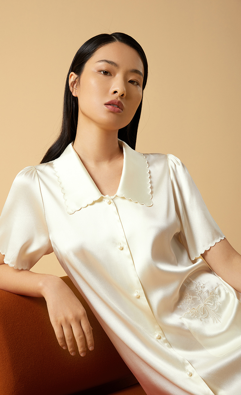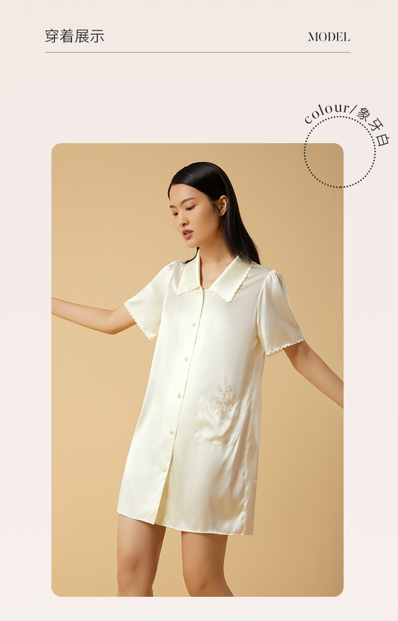金三塔100%桑蚕丝重磅真丝花瓣绣包边纯欲风法式复古白色衬衫裙 YSFCB305