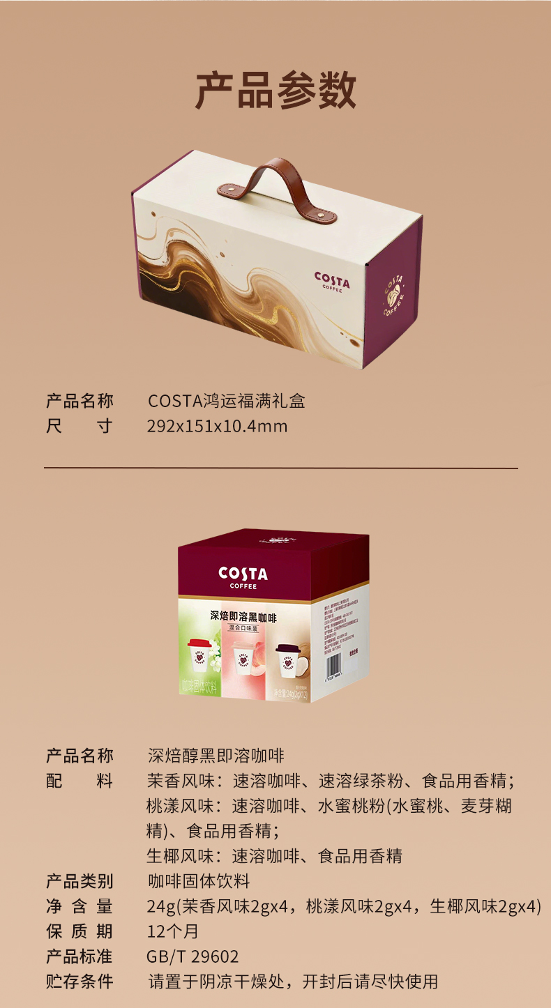 【品名】COSTA咖世家 鸿运福满咖啡组合 【规格】茉香风味2g*4+桃漾风味2g*4+生椰风味2g*4(赠咖啡杯1个+红包5个) 【产地】国内 【保质期】12个月 【发货包装】独立包装 【发货地】苏州 【发货快递】中通 【不发货区域】新疆、西藏、内蒙、甘肃、宁夏、青海、港澳台 【发货时效】48-72小时,周末节假日顺延 |
