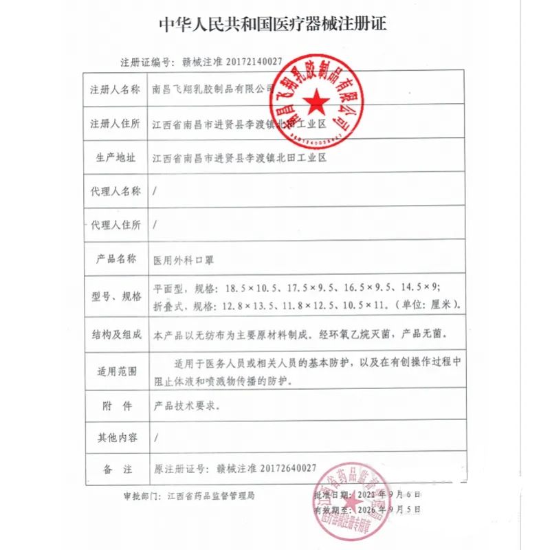 •撕开包装,取出本产品,将耳带挂至耳背固定,轻压鼻夹使口罩体与