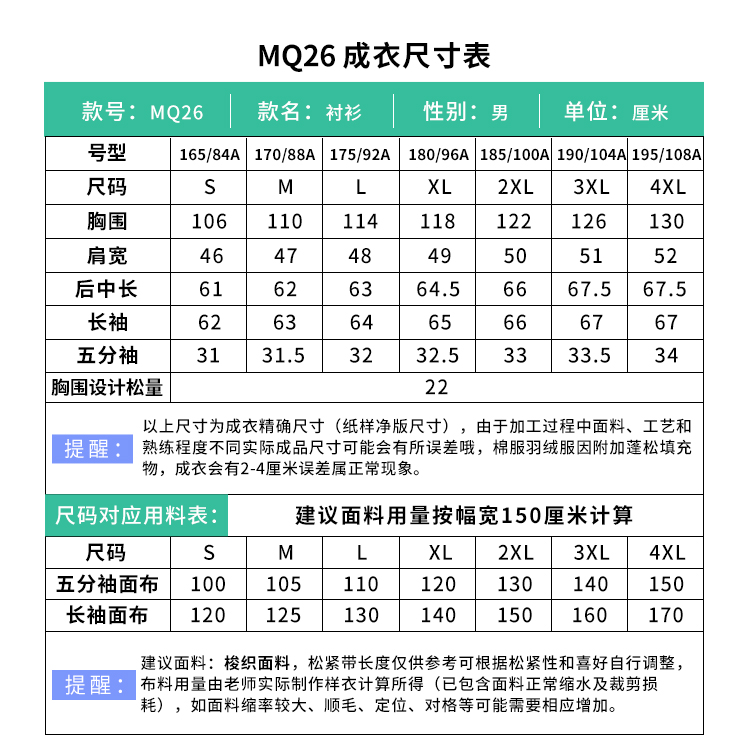 裁缝学苑MQ26男士休闲衬衫纸样长袖五分袖款男装衬衣打版裁剪样板