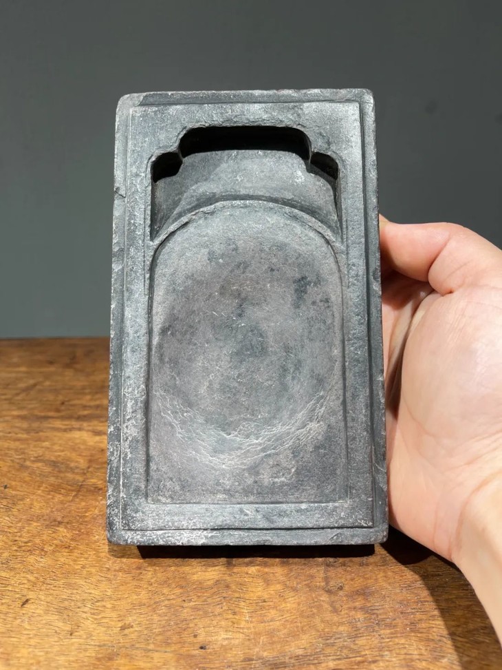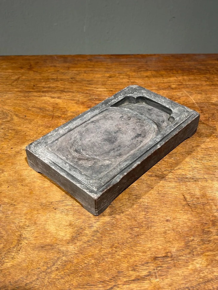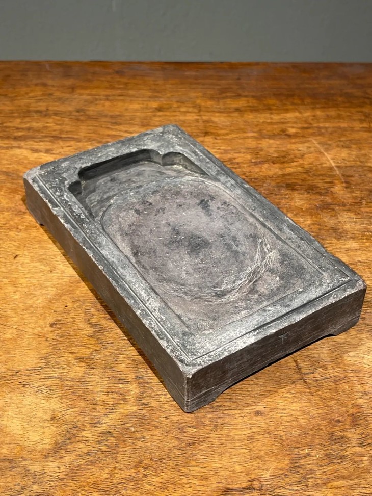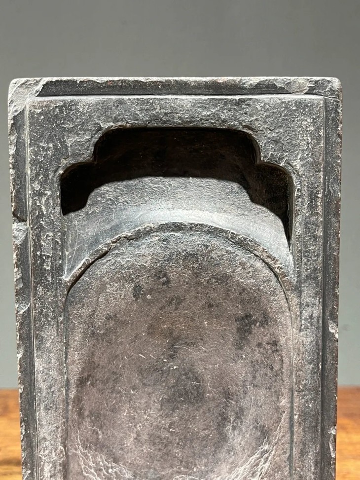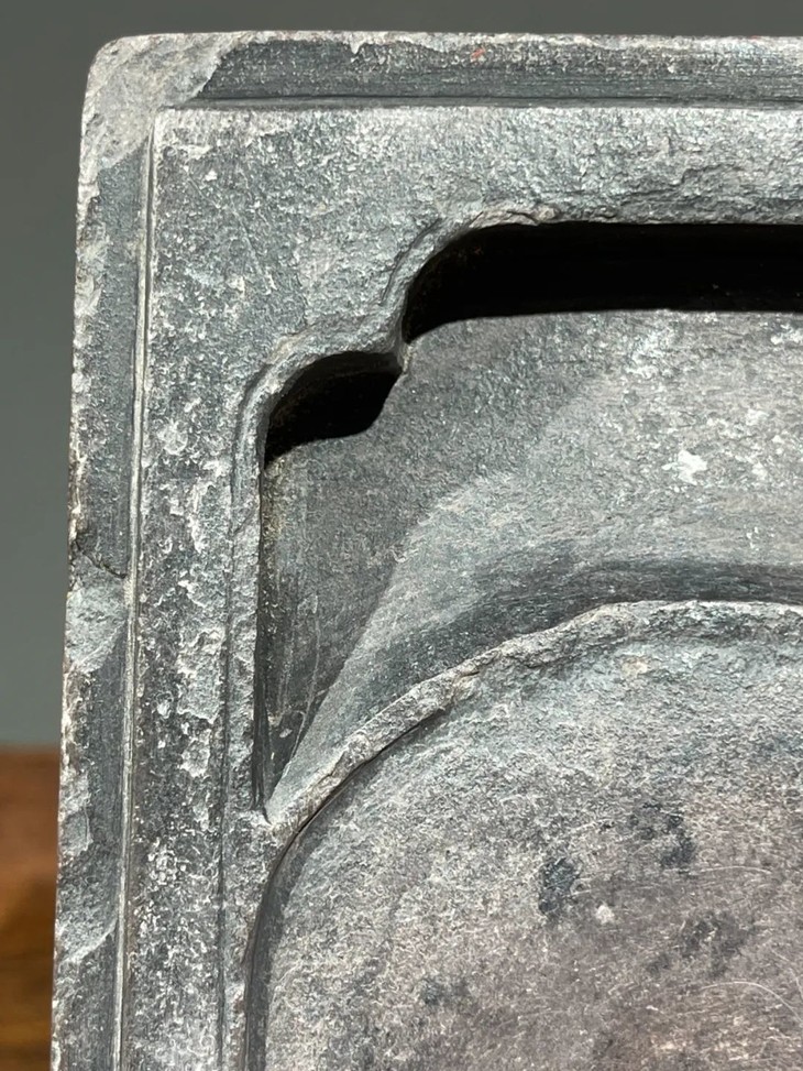 此天然端石刻四足长方砚台,如图所示,除边沿具轻微小磕伤与正常使用磨损痕外,整体保存完好。