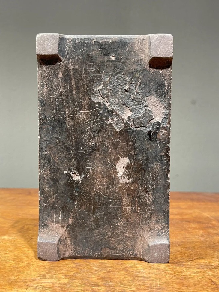 此件端石刻四足长方砚台取材精良端石,天然纹理清晰,造型简约典雅,雕琢细腻,文人气质浓厚,包浆皮壳温润细腻,是难得一见的老端砚。
