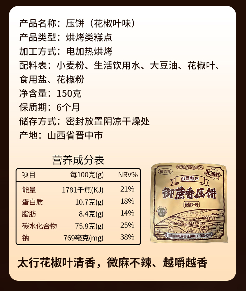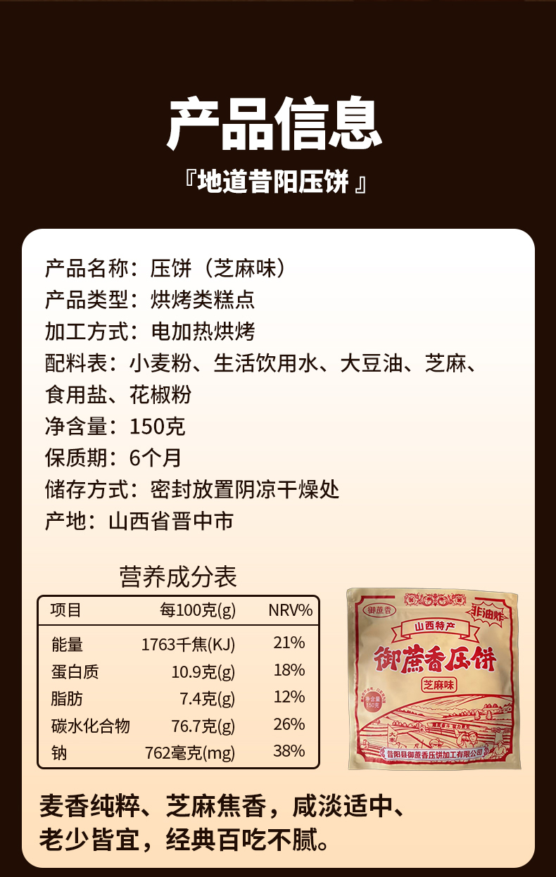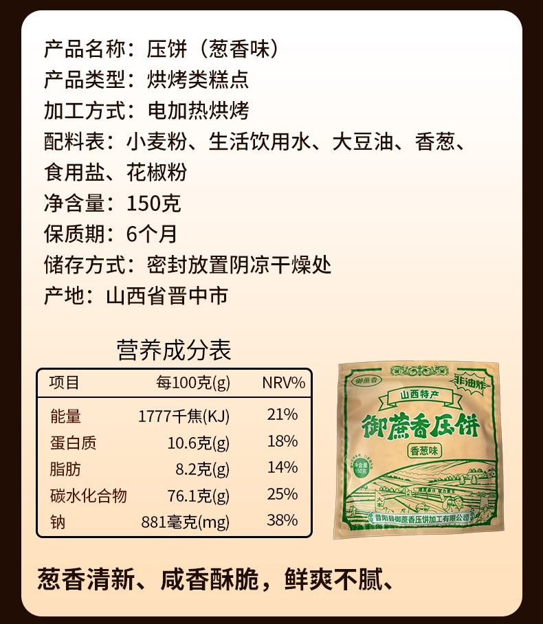 【超值10袋装】御蔗香 昔阳压饼 薄香酥脆 山西特产 老少皆宜 酥脆可口 芝麻味/花椒味/香葱味 150g*10袋
