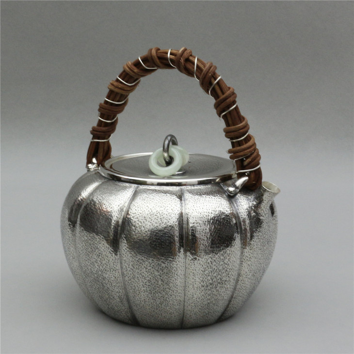 此壶为传统南瓜壶造型,小短流大壶身,双翠环盖钮,以银丝缠藤作提梁,作工精致,形式古朴。持此壶待宾朋有“山中宰相,林下九卿”之慨,南瓜亦有多子多福多寓意。
