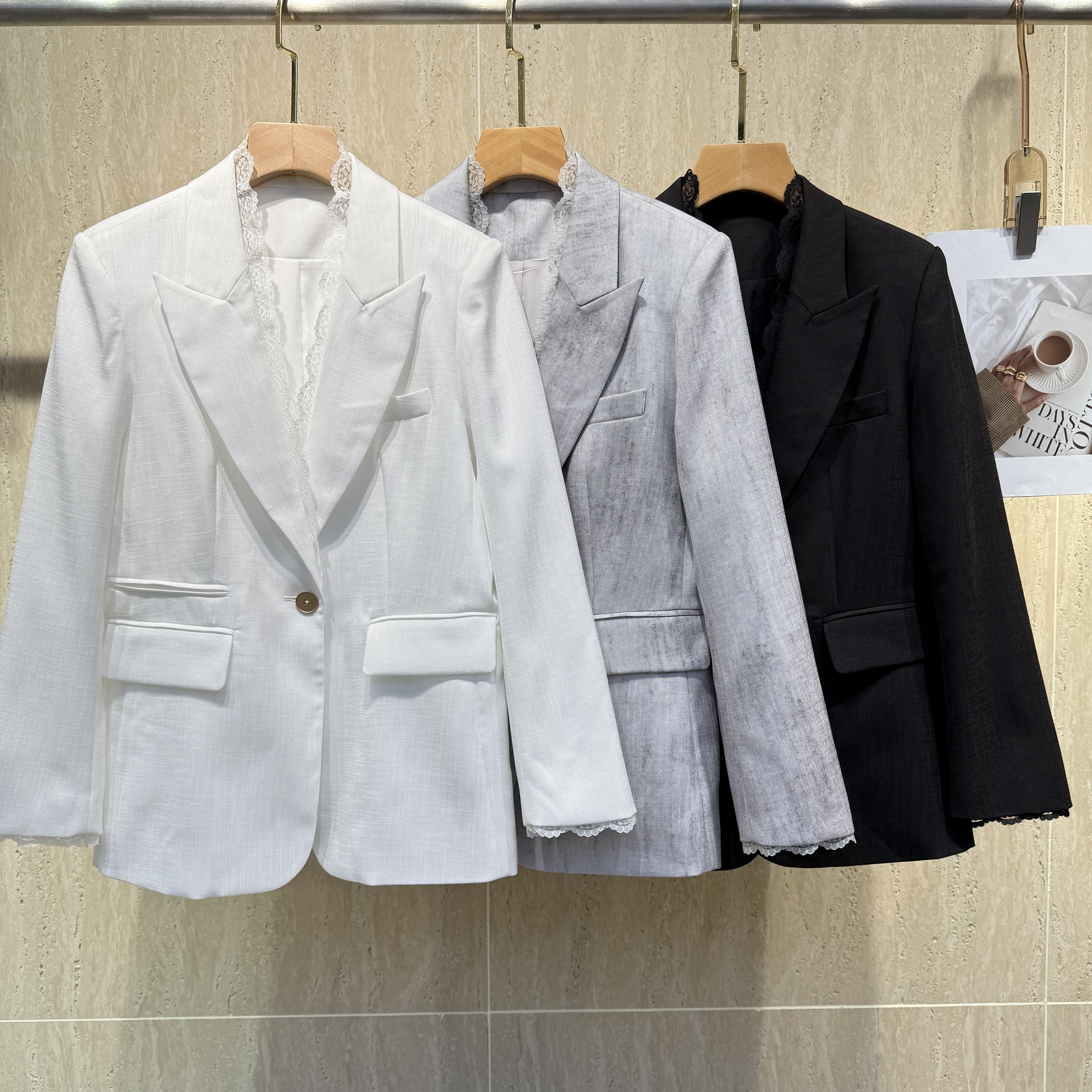 SC1A03_漆黑色/星灰色_上衣外套_春季_蕾丝拼接V领西装_高级女装_BERNIEELEN 伯妮斯茵