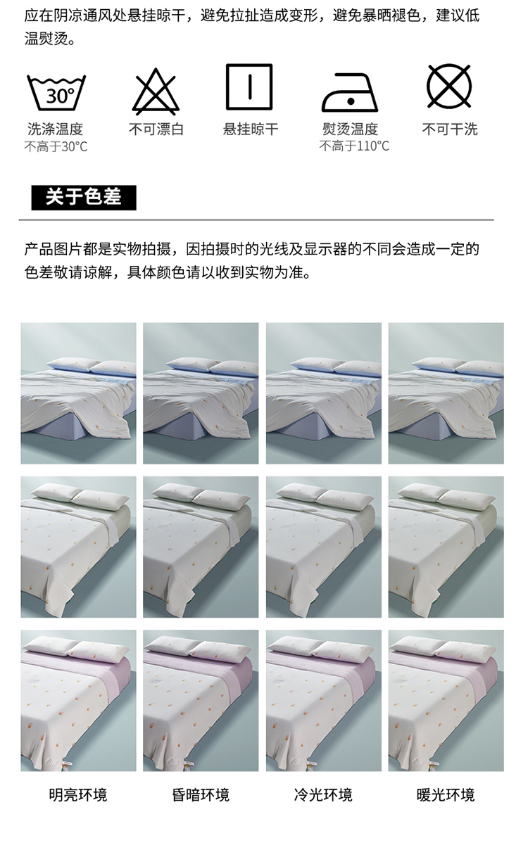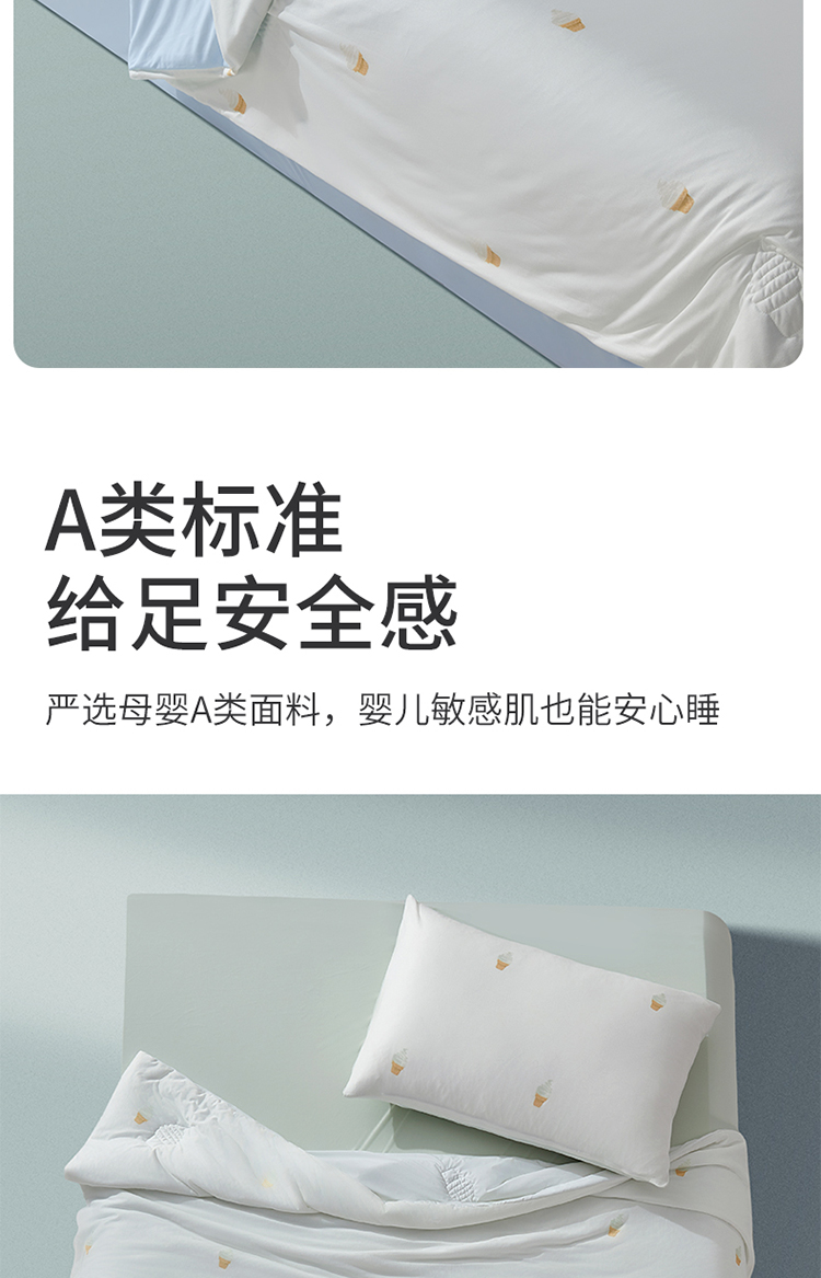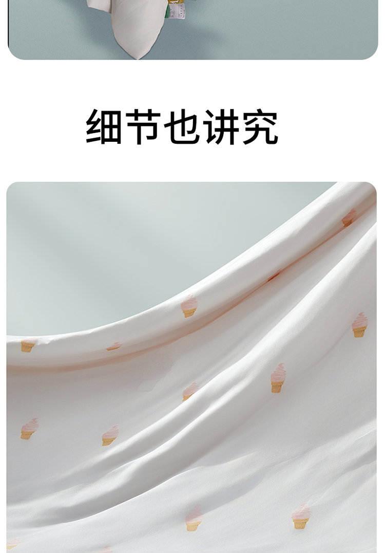 支持水洗机洗,真是懒人福音了,记得机洗的时候用网兜,开启轻柔或者低转速模式,使用中性洗涤剂,不要高温烘干,自然晾晒就可以。在绗缝的设计上,选择了冰淇淋图案绗缝,在炎炎夏夜,营造一种吃冰淇淋般的凉爽愉悦感。藏在被子上的小小心思,冰淇淋凉感配色,青汁薄荷(绿)、冰蓝海盐(蓝)、蜜桃乌龙(粉),每一款都简约高级,为卧室增添清凉感,帮助一夜好眠。