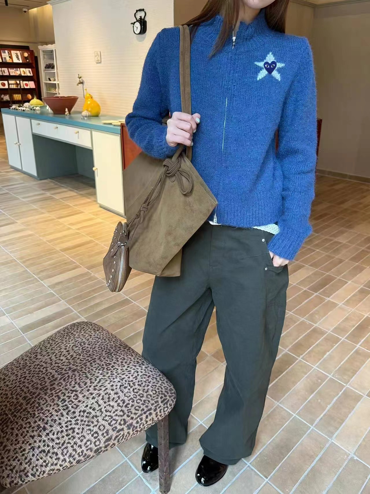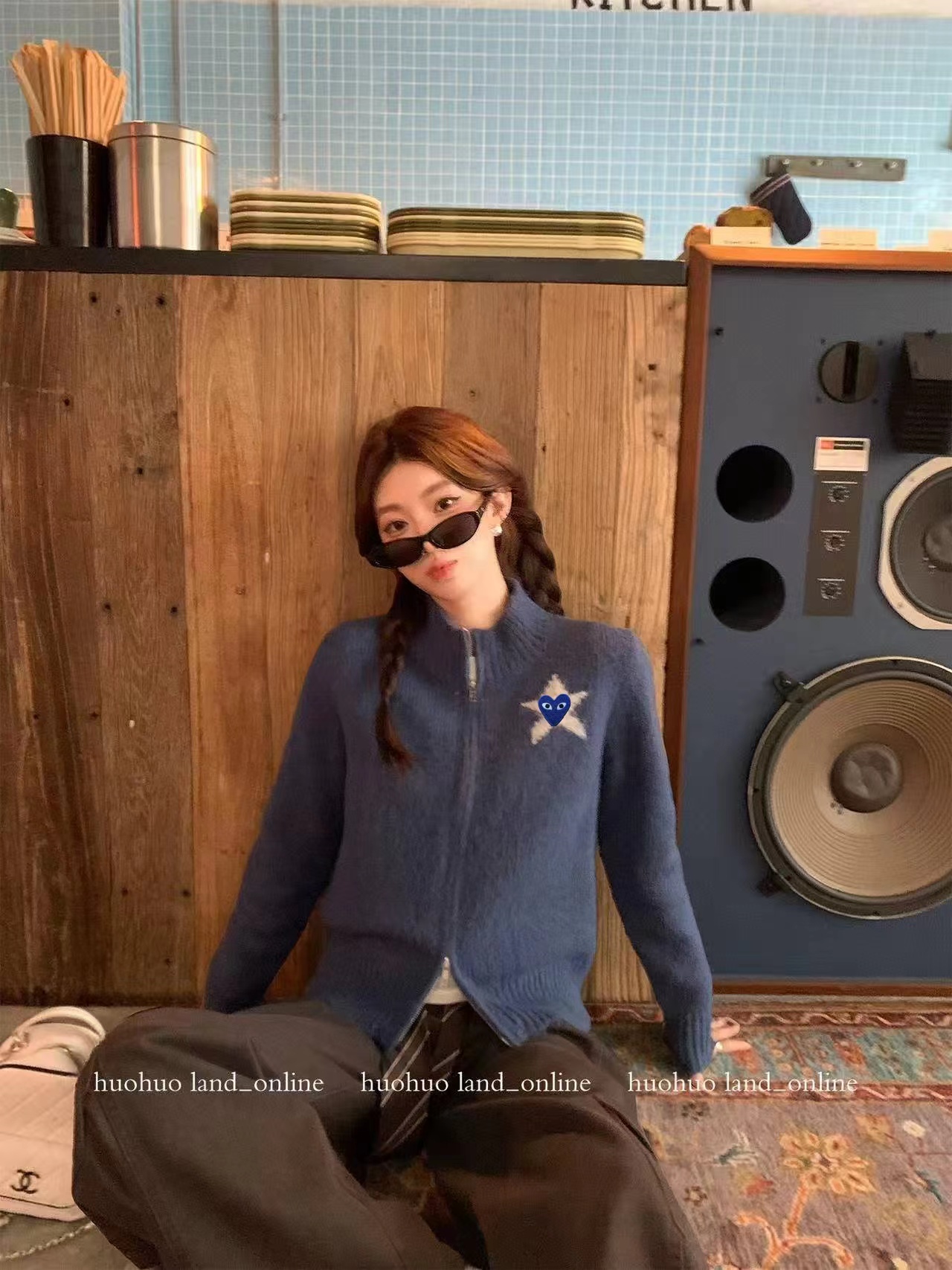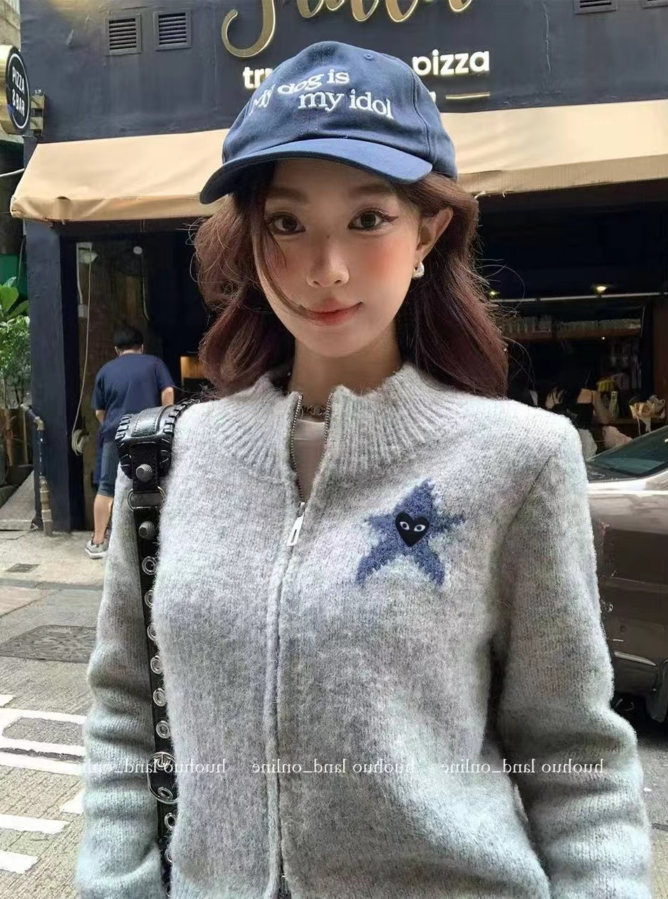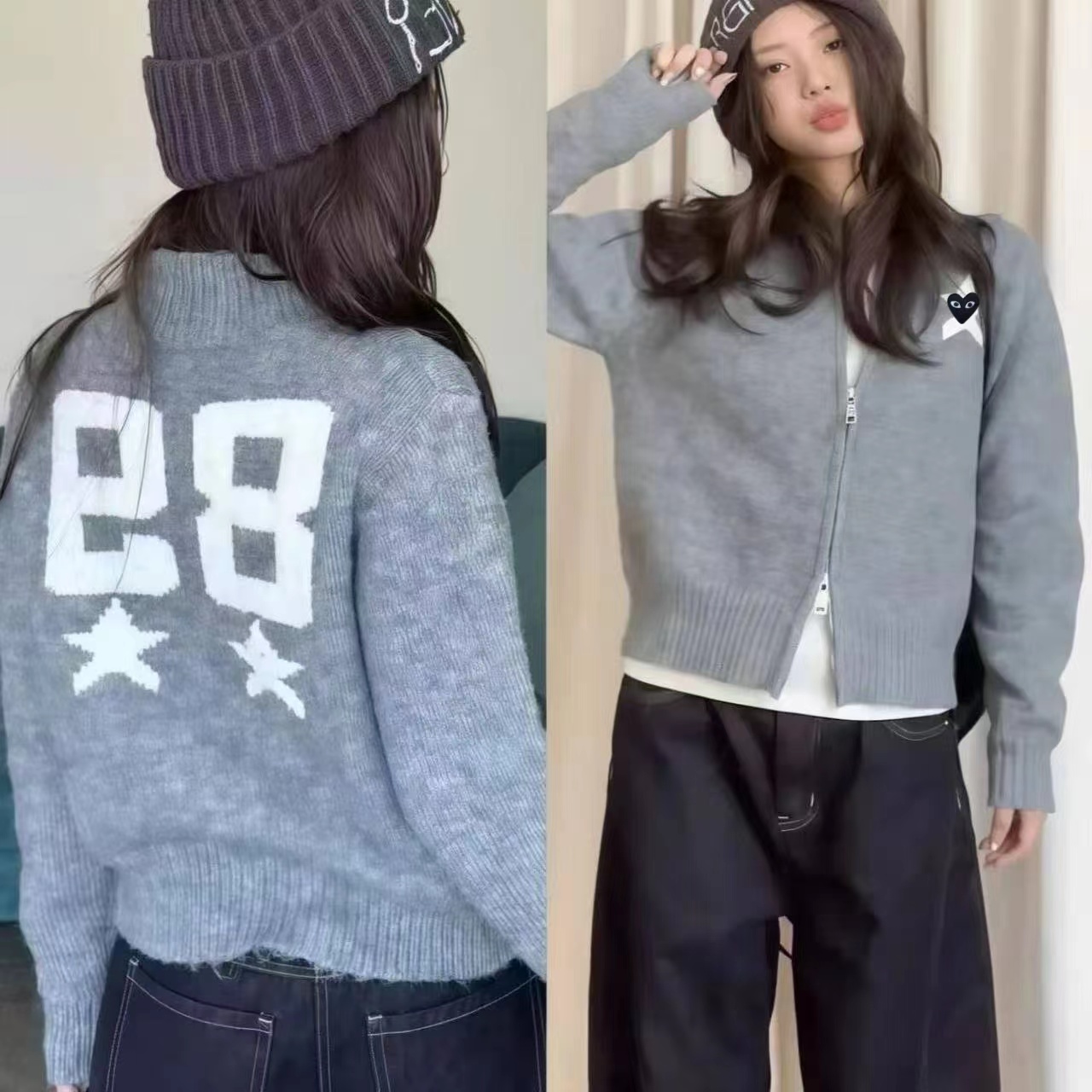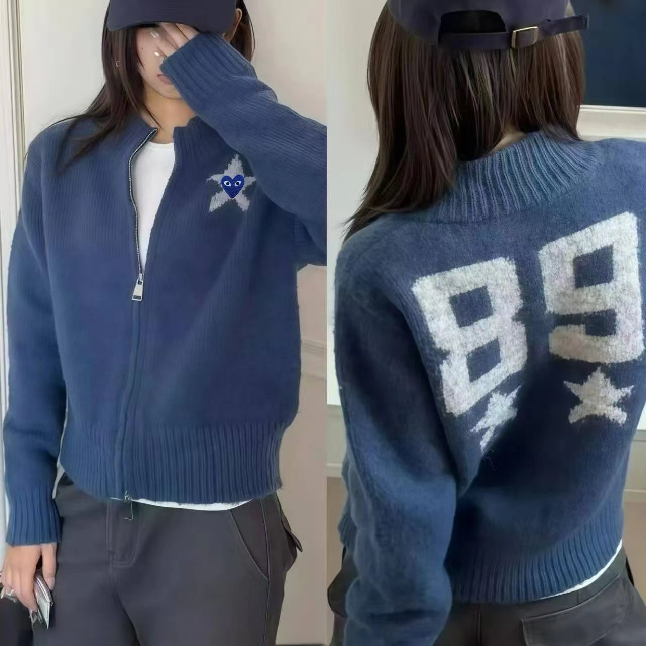 秋冬款的针织拉链开衫,整体风格偏韩系慵懒风,立领半高领设计,搭配全拉链,是短款或常规长度的合身版型,方便日常穿脱。看起来是柔软的羊毛(或羊毛混纺)材质,表面有细腻的针织纹理,保暖又有质感。正面胸口有一个白色立体星星刺绣,星星中间还有一个小的黑色爱心图案,很有设计感。背面印有(或绣有)白色的“89”数字和小星点缀,增加了复古和个性的氛围。