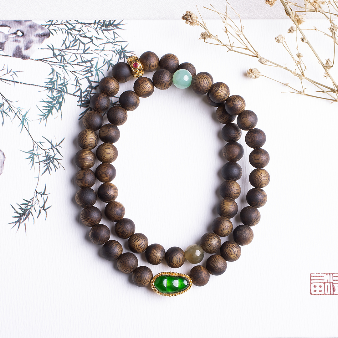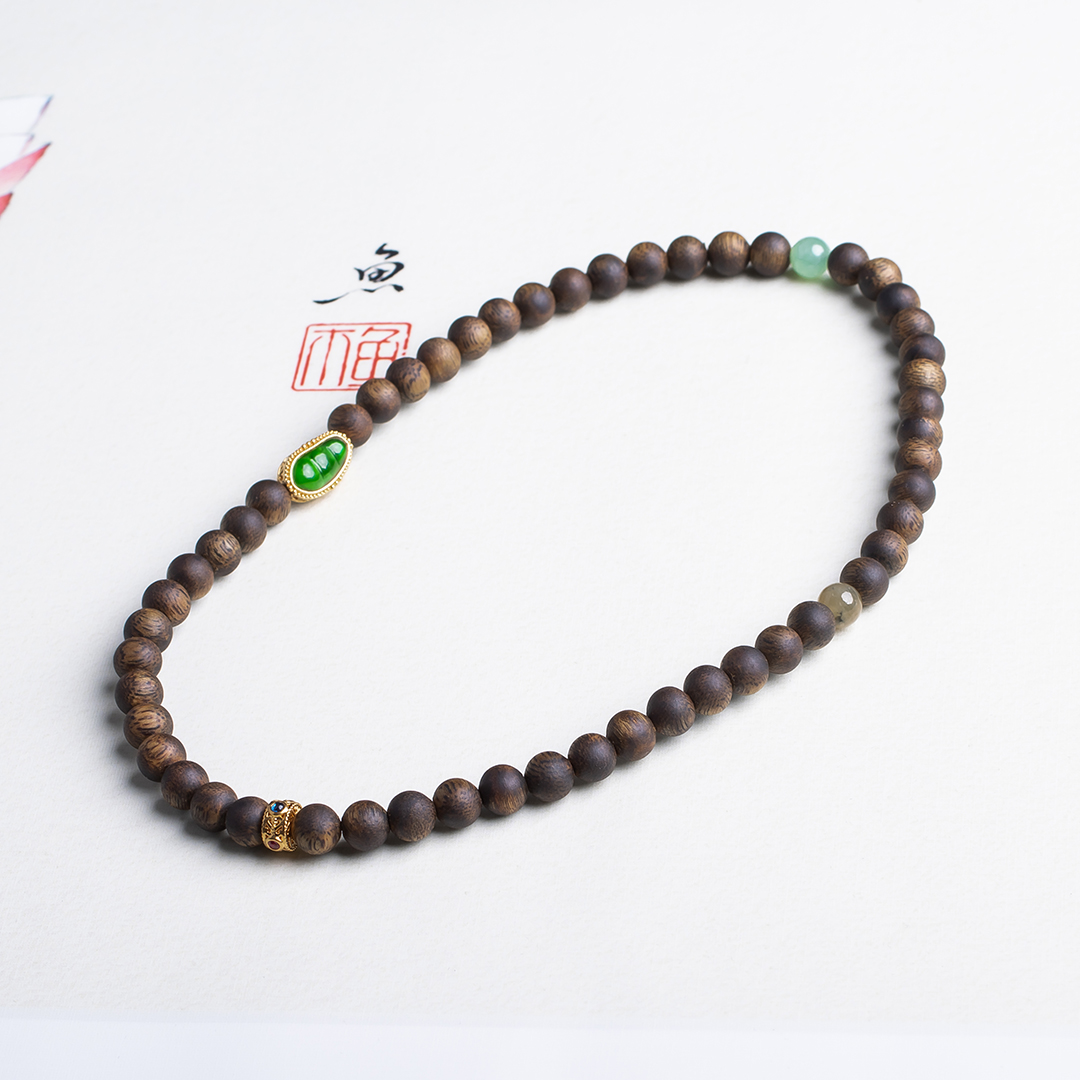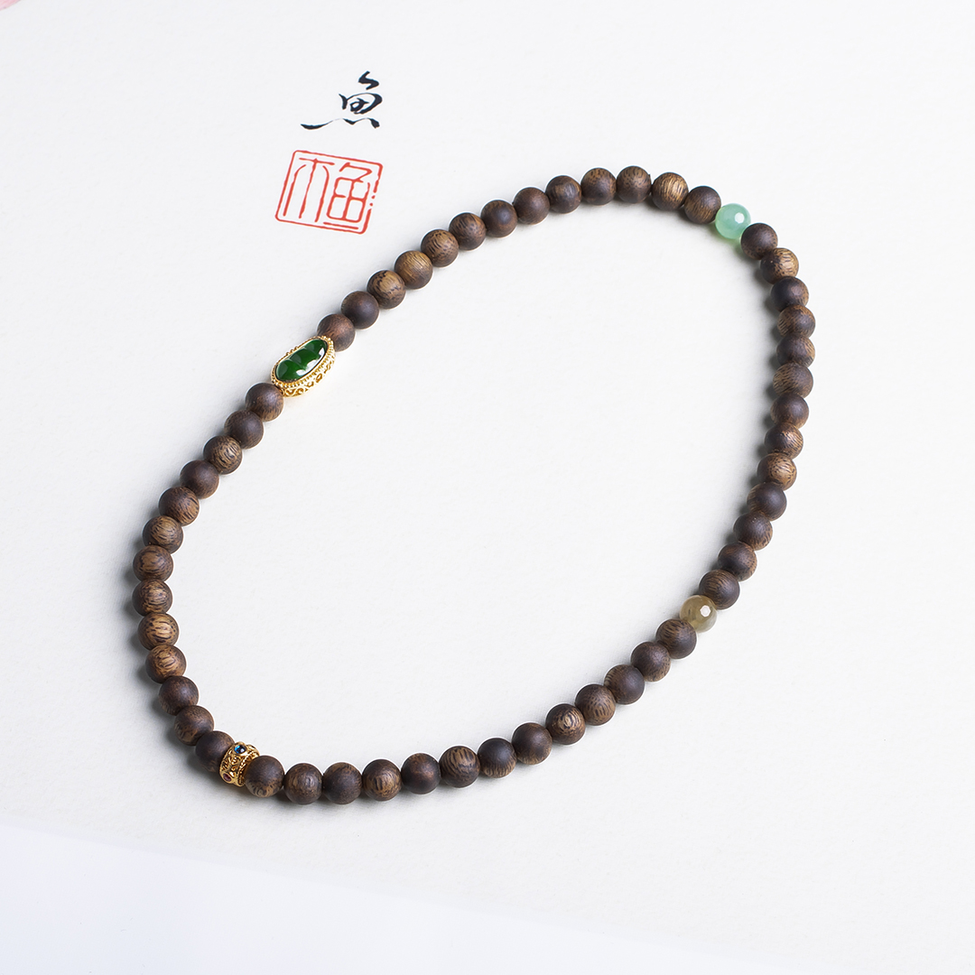 xy0398沉香+翡翠福豆双圈手链项链,天然沉香约7.4mm,原色原味,香味自然清甜,一颗辣绿的翡翠豆子+两颗翡翠圆珠+一颗18K金隔颗,双圈佩戴,双倍福气,清香安神,玉润养身。可做手链,做项链佩戴也非常好看哦。