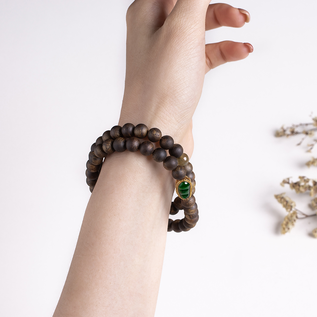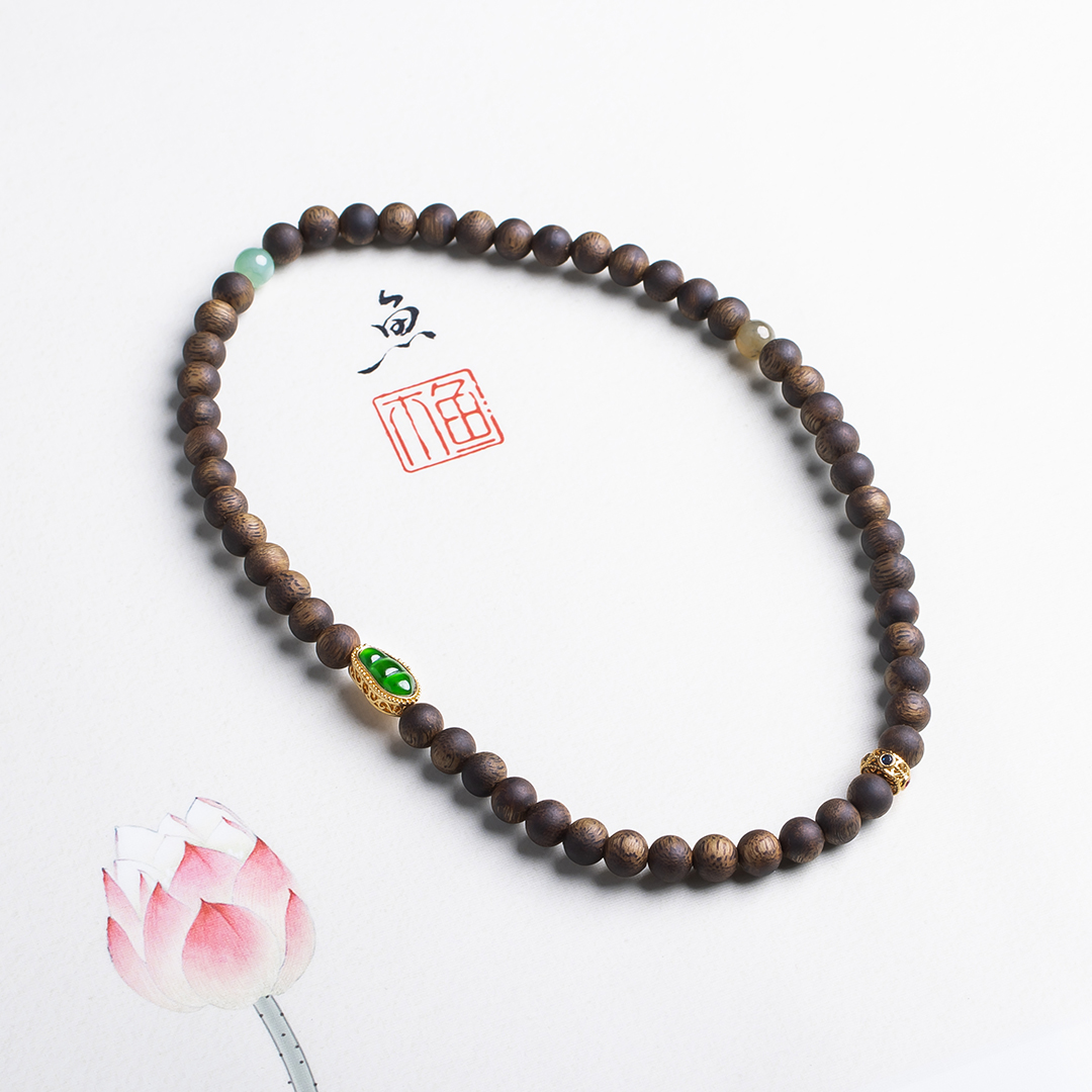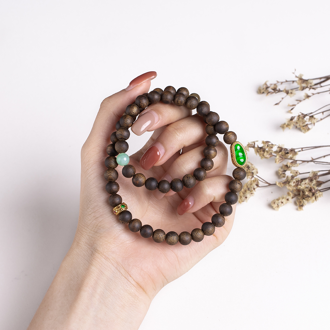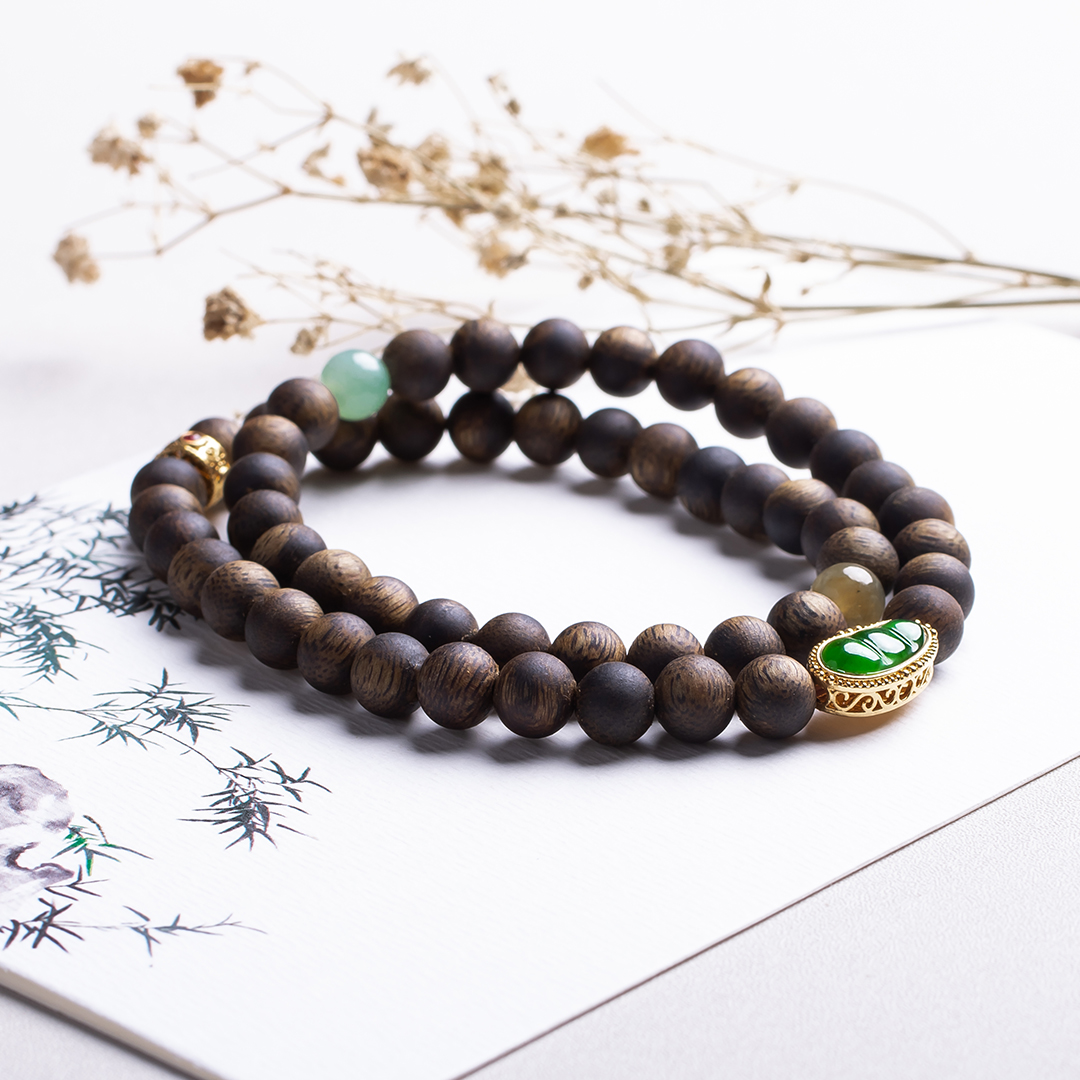 xy0398沉香+翡翠福豆双圈手链项链,天然沉香约7.4mm,原色原味,香味自然清甜,一颗辣绿的翡翠豆子+两颗翡翠圆珠+一颗18K金隔颗,双圈佩戴,双倍福气,清香安神,玉润养身。可做手链,做项链佩戴也非常好看哦。