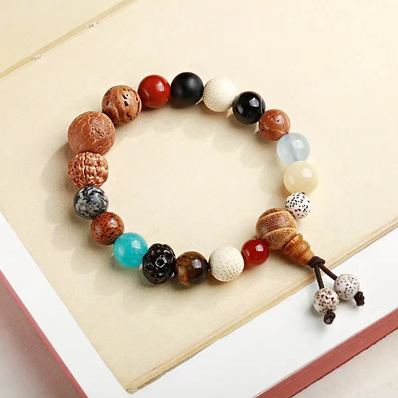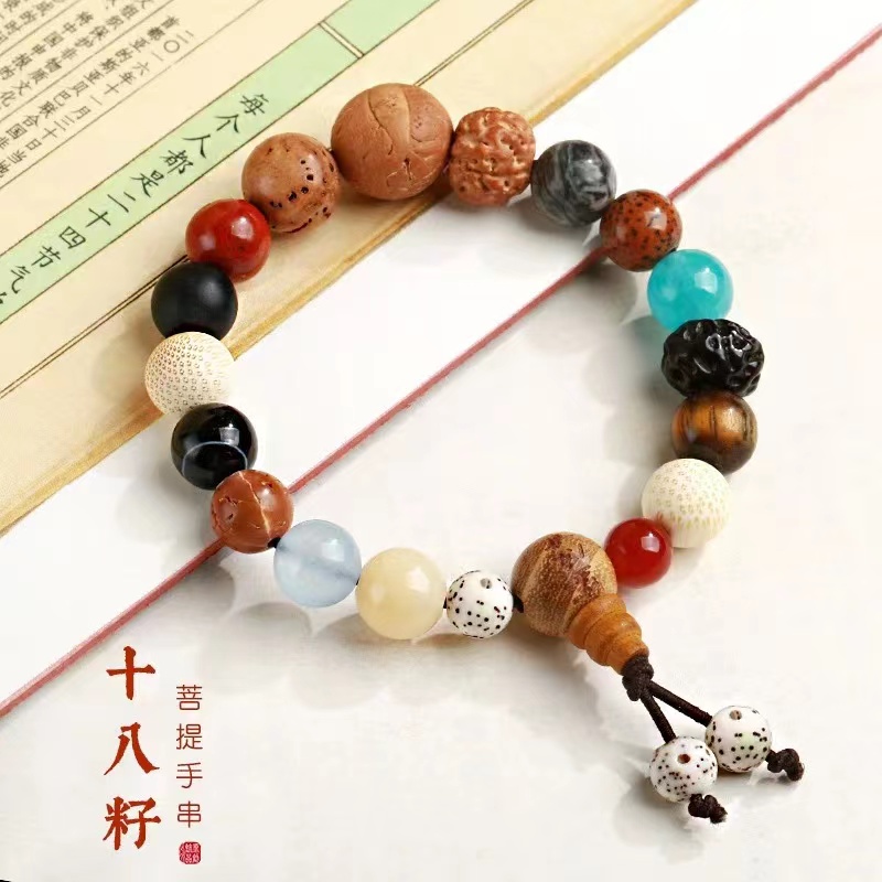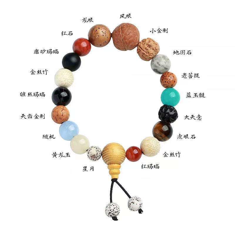 材质:9种天然石(红玛瑙,虎眼石,蓝玉髓,地图石,红石,磨砂黑玛瑙,缠丝玛瑙,海蓝玉髓(随机),黄龙玉)9种天然菩提子(金丝竹,大天意,老菩提,小金刚,凤眼菩提,龙眼菩提,金丝竹,无齿金刚,星月菩提)