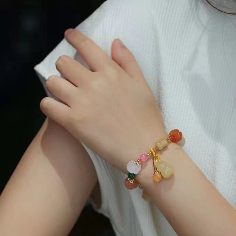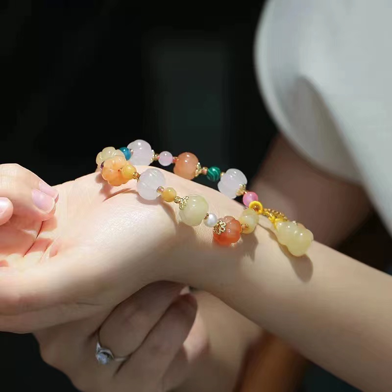 注意:玉南瓜和玉葫芦的颜色固定,小珠子颜色随机配。天然宝石内有冰纹、裂痕、棉絮、矿缺等属于正常现象,不以此作为退换的理由。