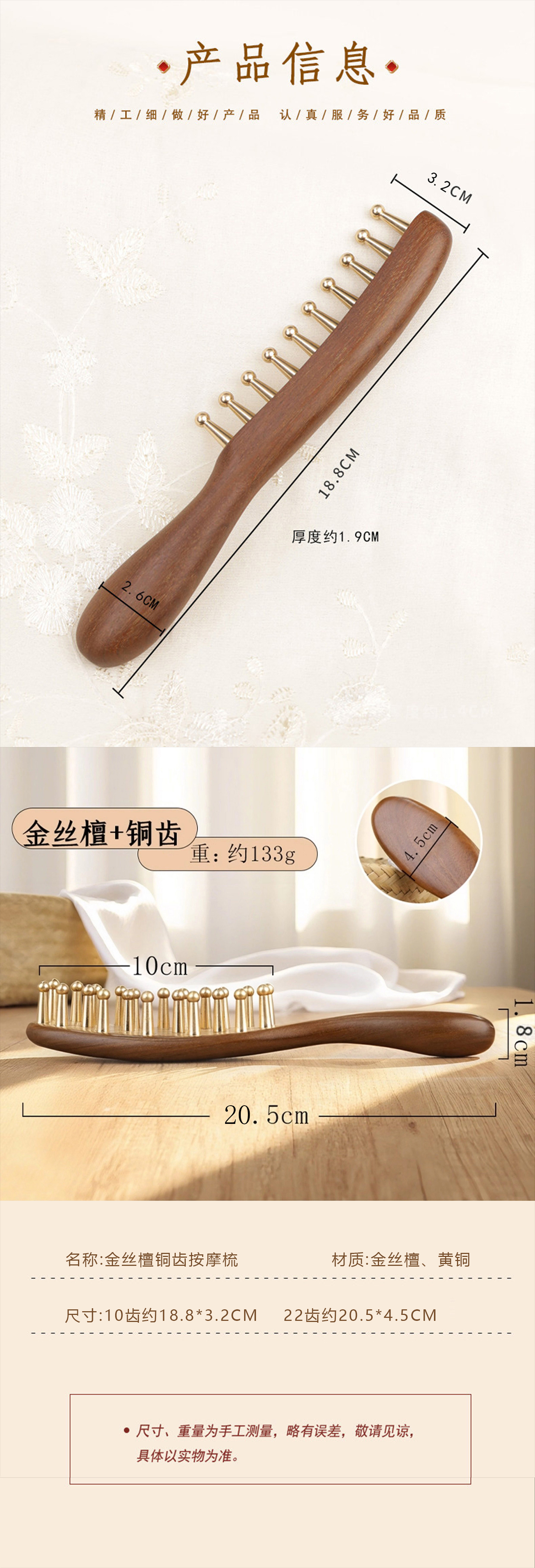 【品名】兰序金丝檀黄铜按摩梳 全身可用 直排梳/叹号梳 送收纳袋 【规格】 10齿直排梳 22齿叹号梳 【产地】国内 【发货包装】独立包装 【发货地】河北 【发货快递】中通、韵达随机发 【不发货区域】新疆、西藏、港澳台 【补邮费地区】内蒙古、宁夏、甘肃、青海、海南+3元 【发货时效】48-72小时,周末节假日顺延 |