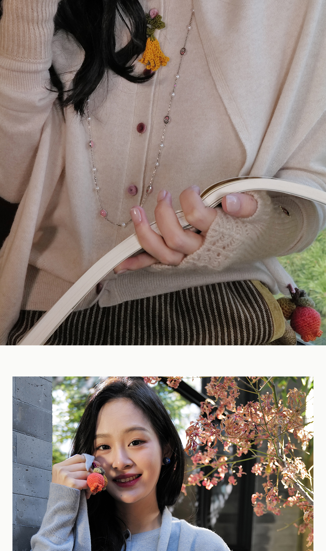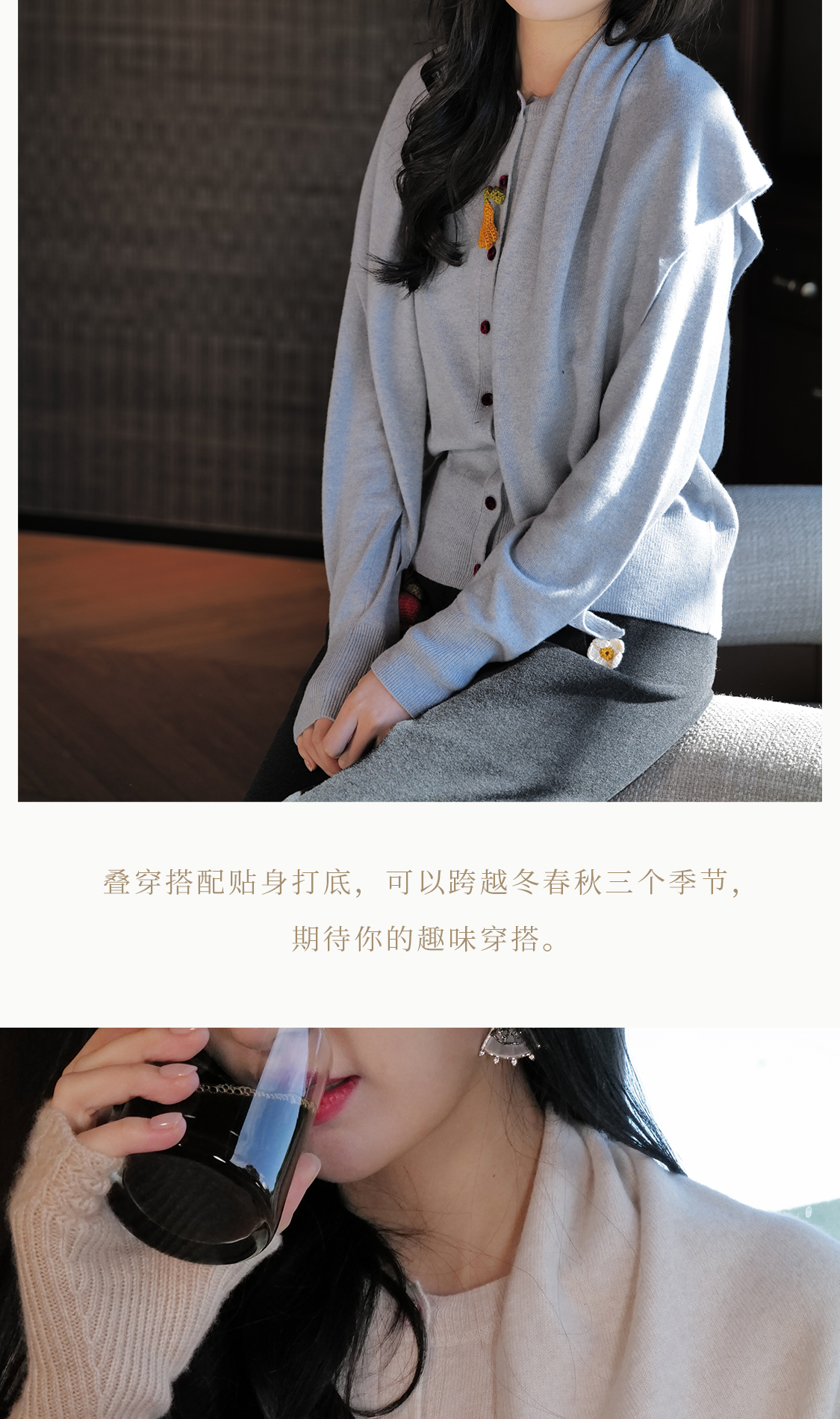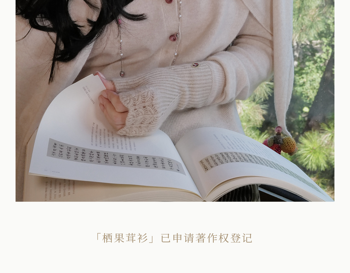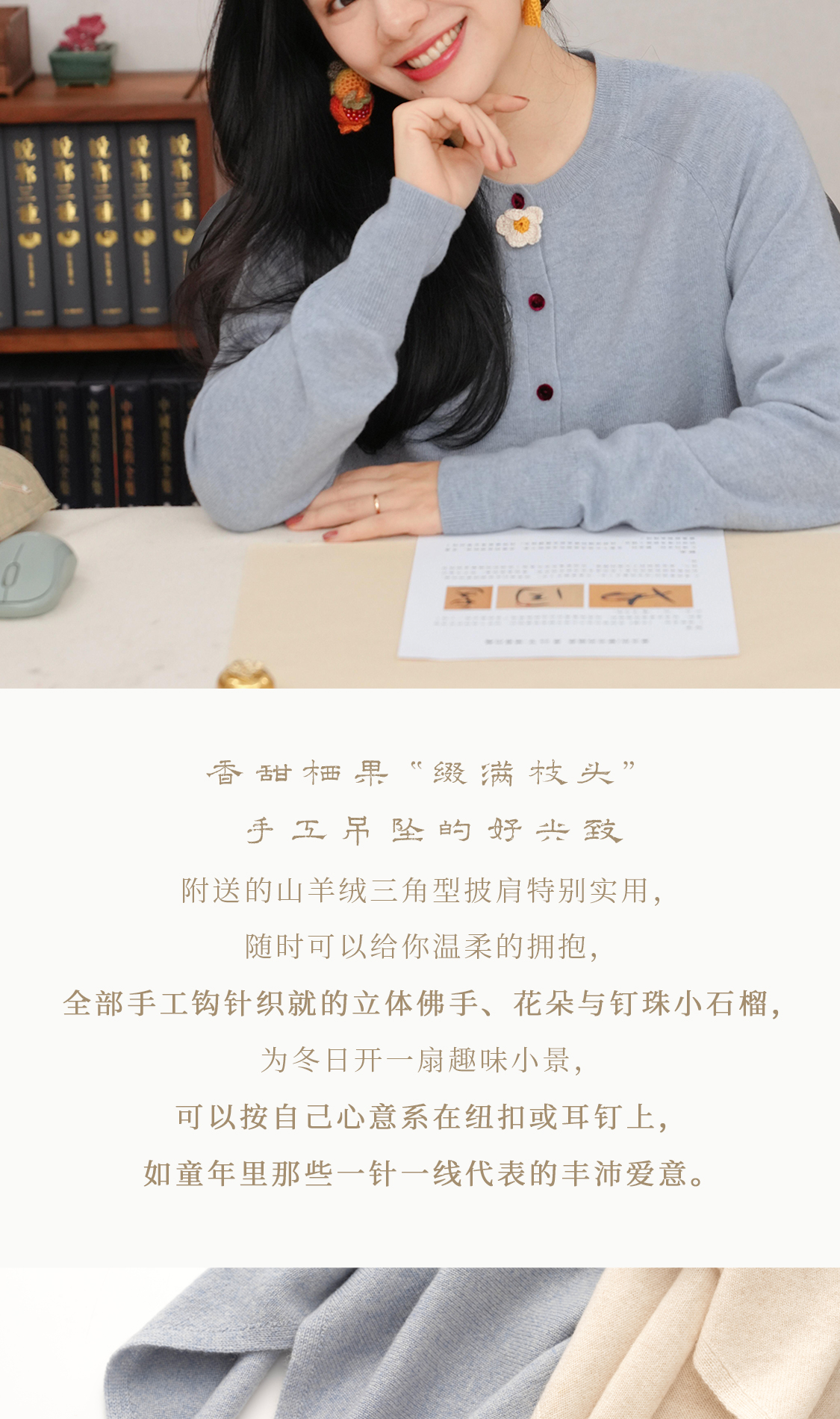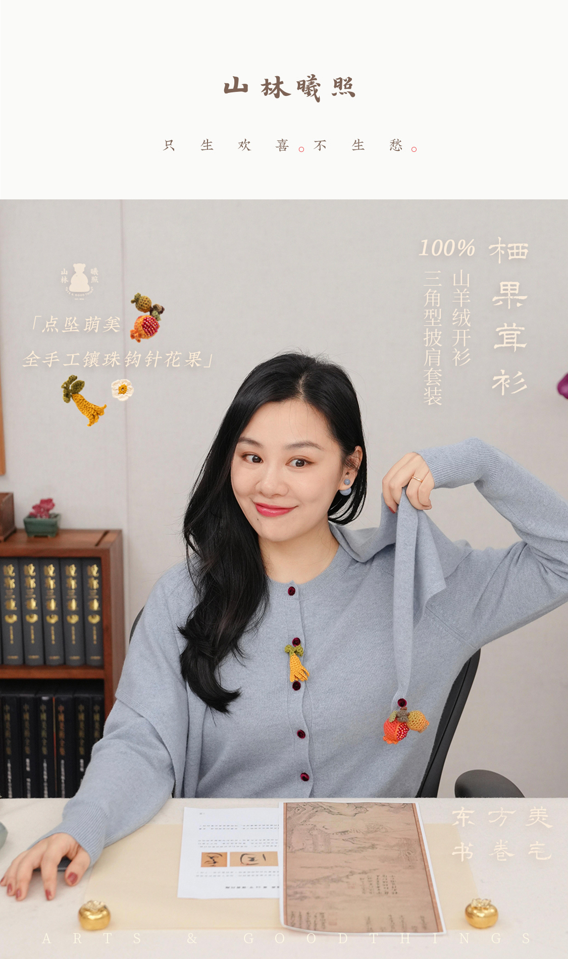 栖果茸衫 100山羊绒开衫 三角型披肩套装 点坠全手工镶珠钩针花果