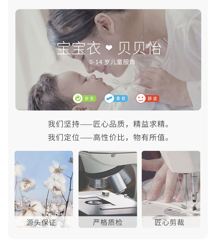 - 贝贝怡专注0-6岁婴幼儿服饰,坚持安全、柔软、舒适的产品理念,为千万中国家庭提供超高品质、安全可靠的婴幼儿服饰产品,妈妈放心,宝宝开心!