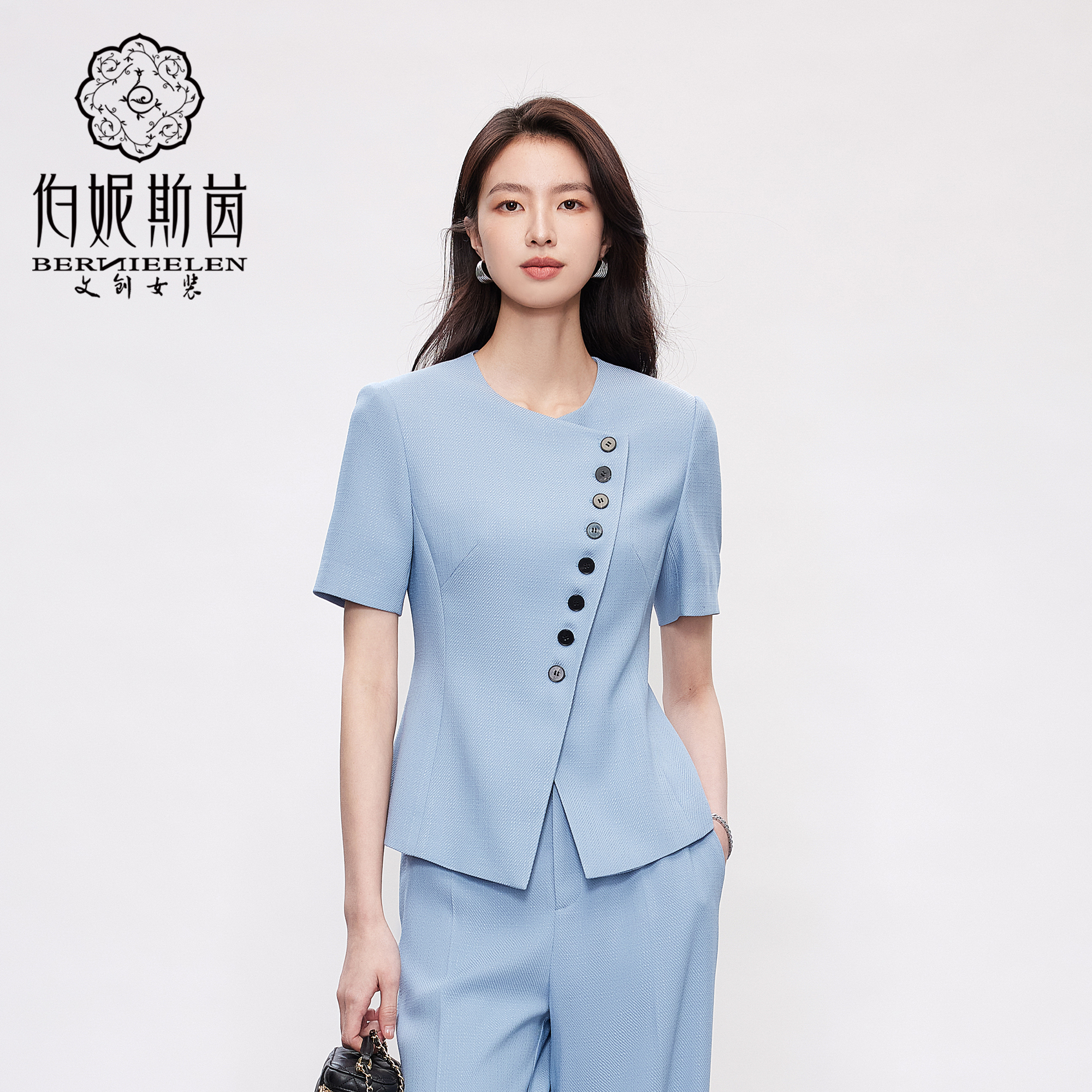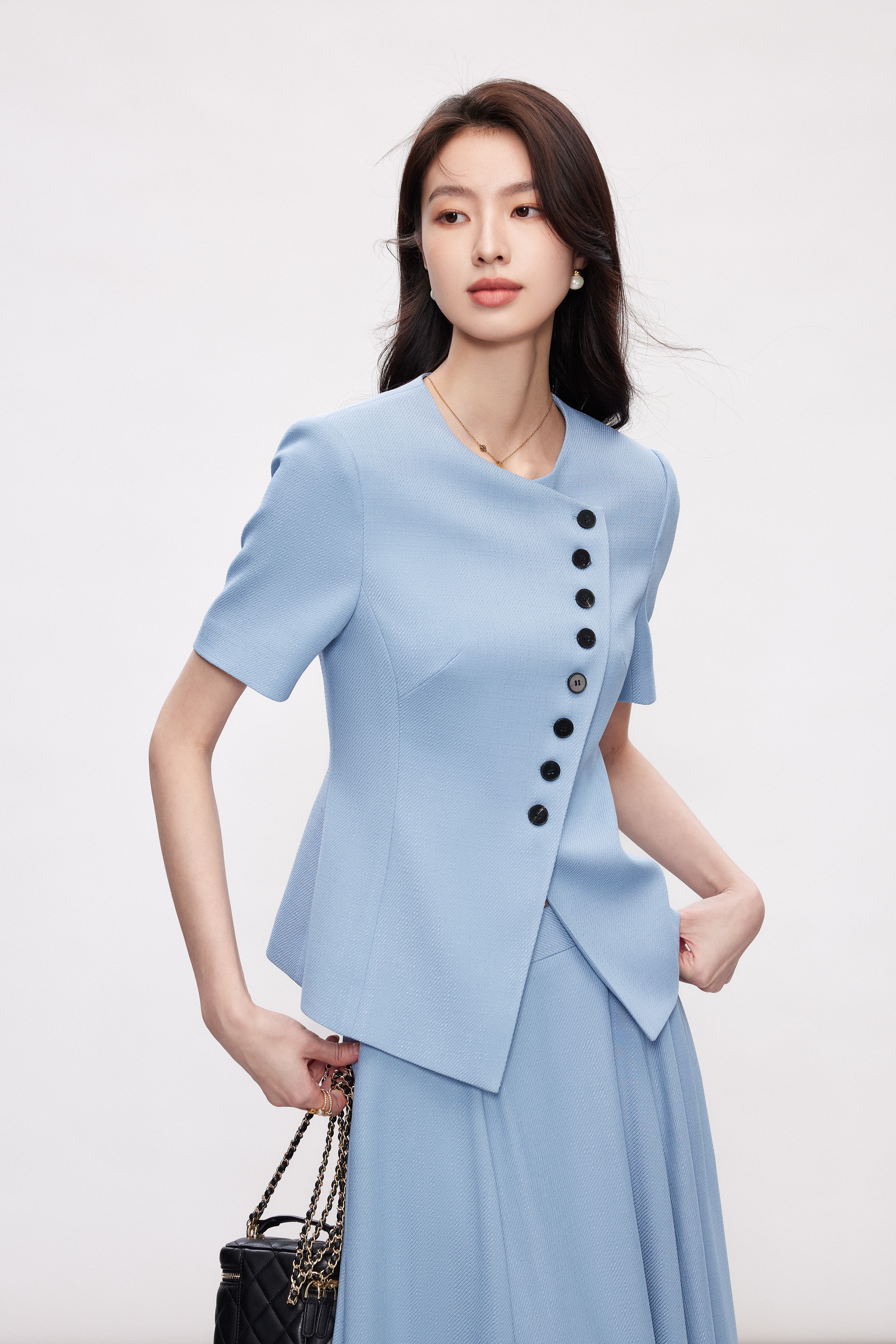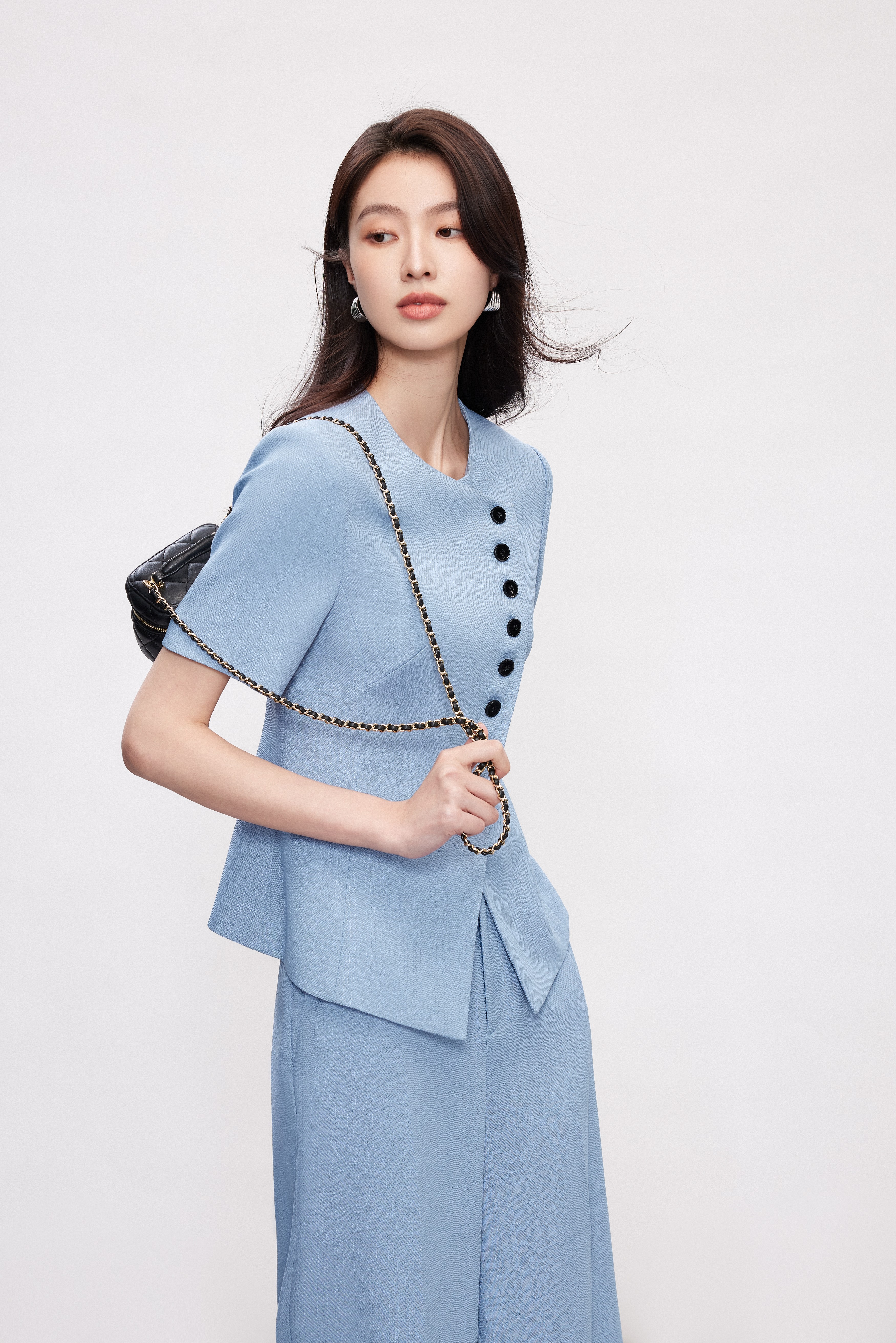HJ2A36_窃蓝色_外套_夏季_简约大方圆领斜襟撞色扣短袖收腰显瘦通勤西装_高级女装_BERNIEELEN 伯妮斯茵