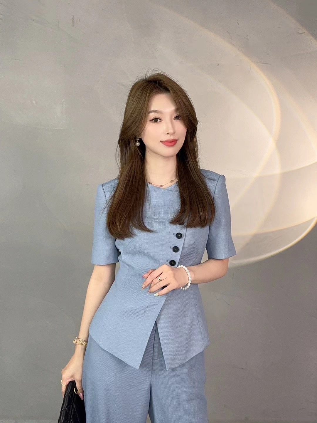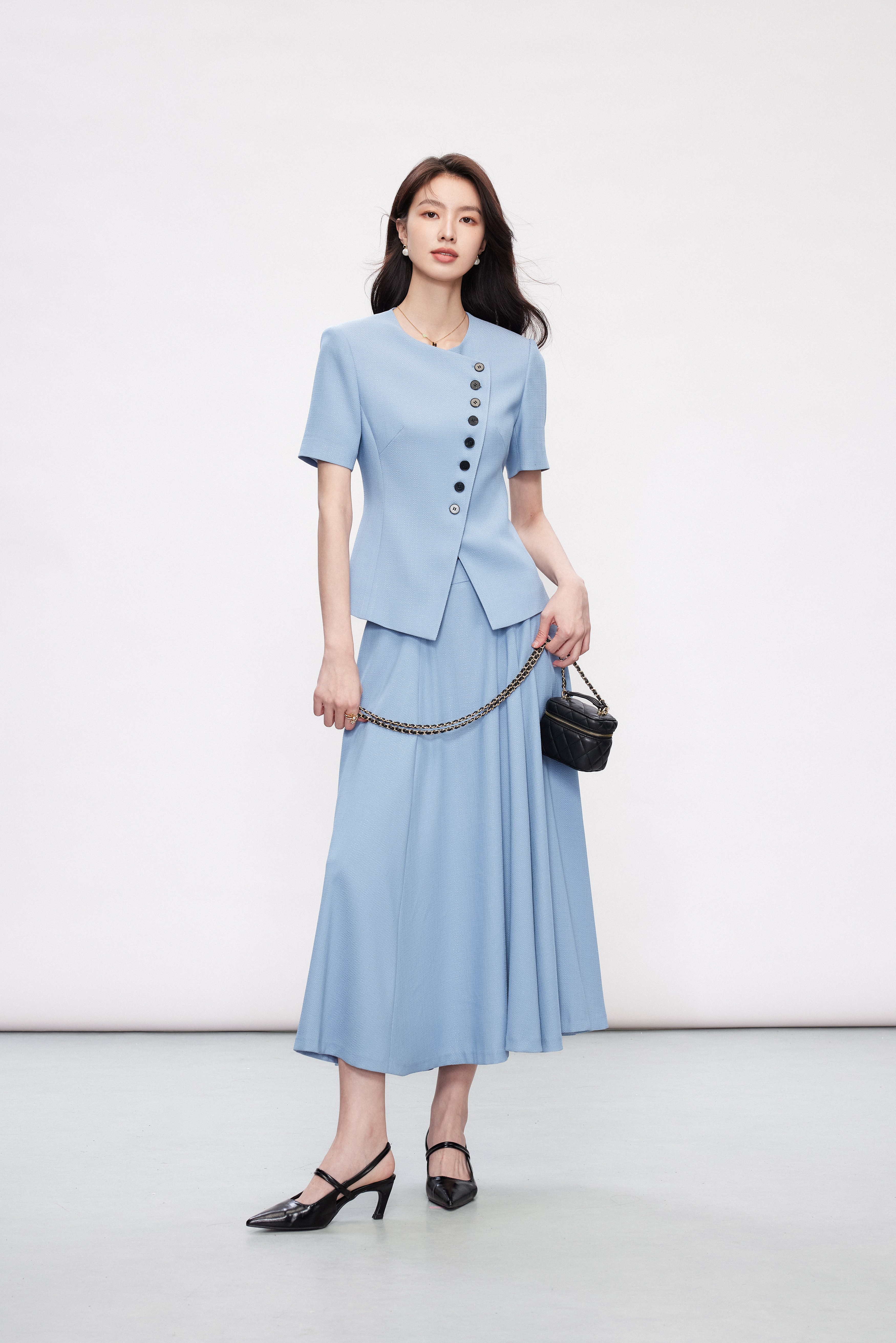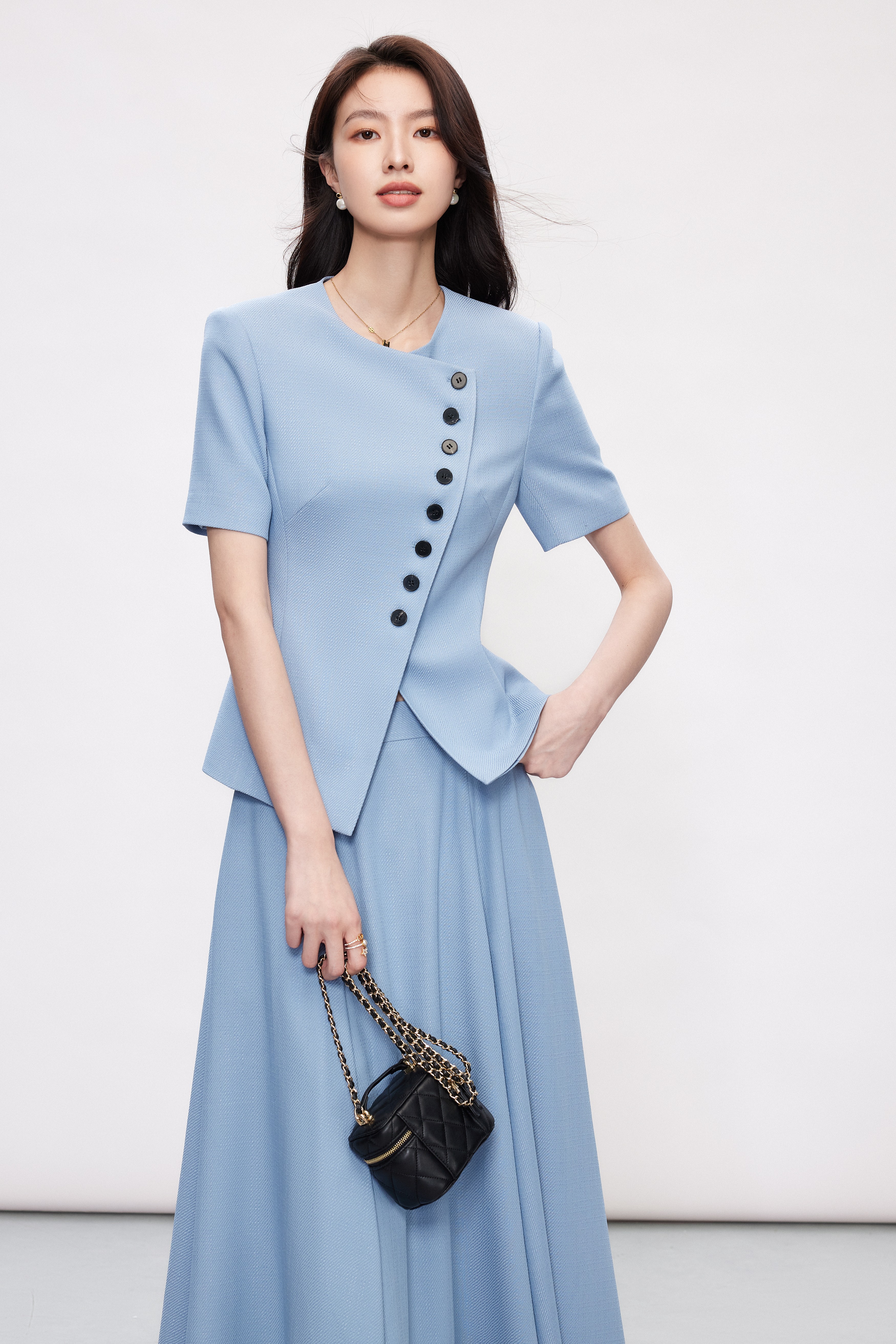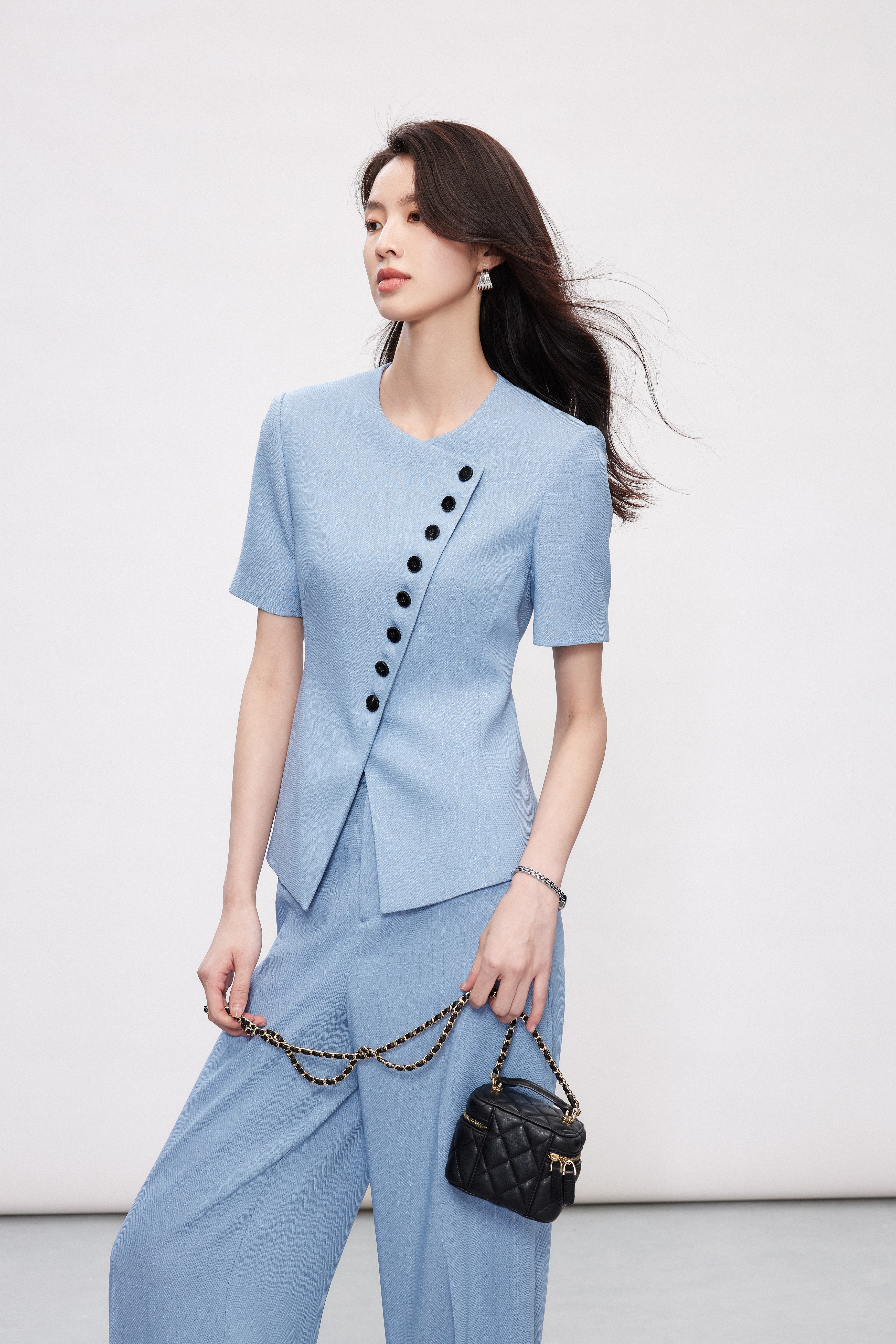HJ2A36_窃蓝色_外套_夏季_简约大方圆领斜襟撞色扣短袖收腰显瘦通勤西装_高级女装_BERNIEELEN 伯妮斯茵