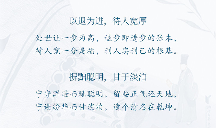 《菜根谭》独有的风格,如一泓清泉流淌于心田。很多人还专门抄写,雕刻心智。