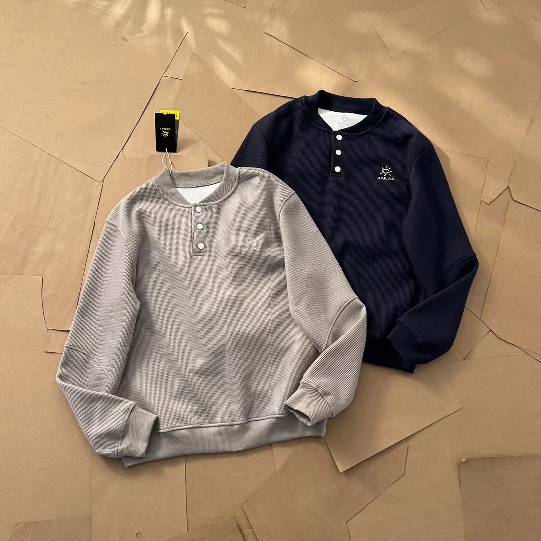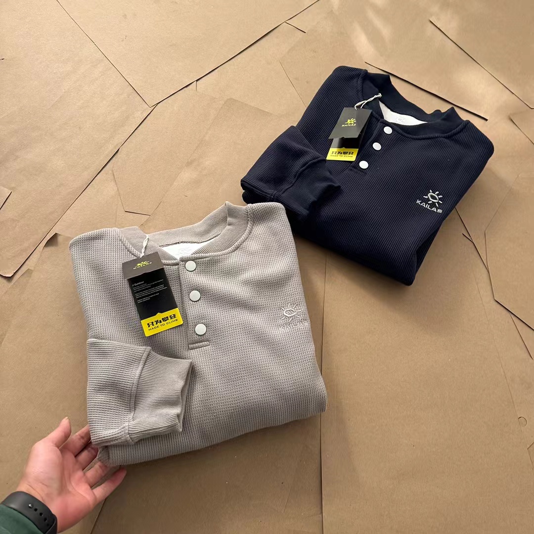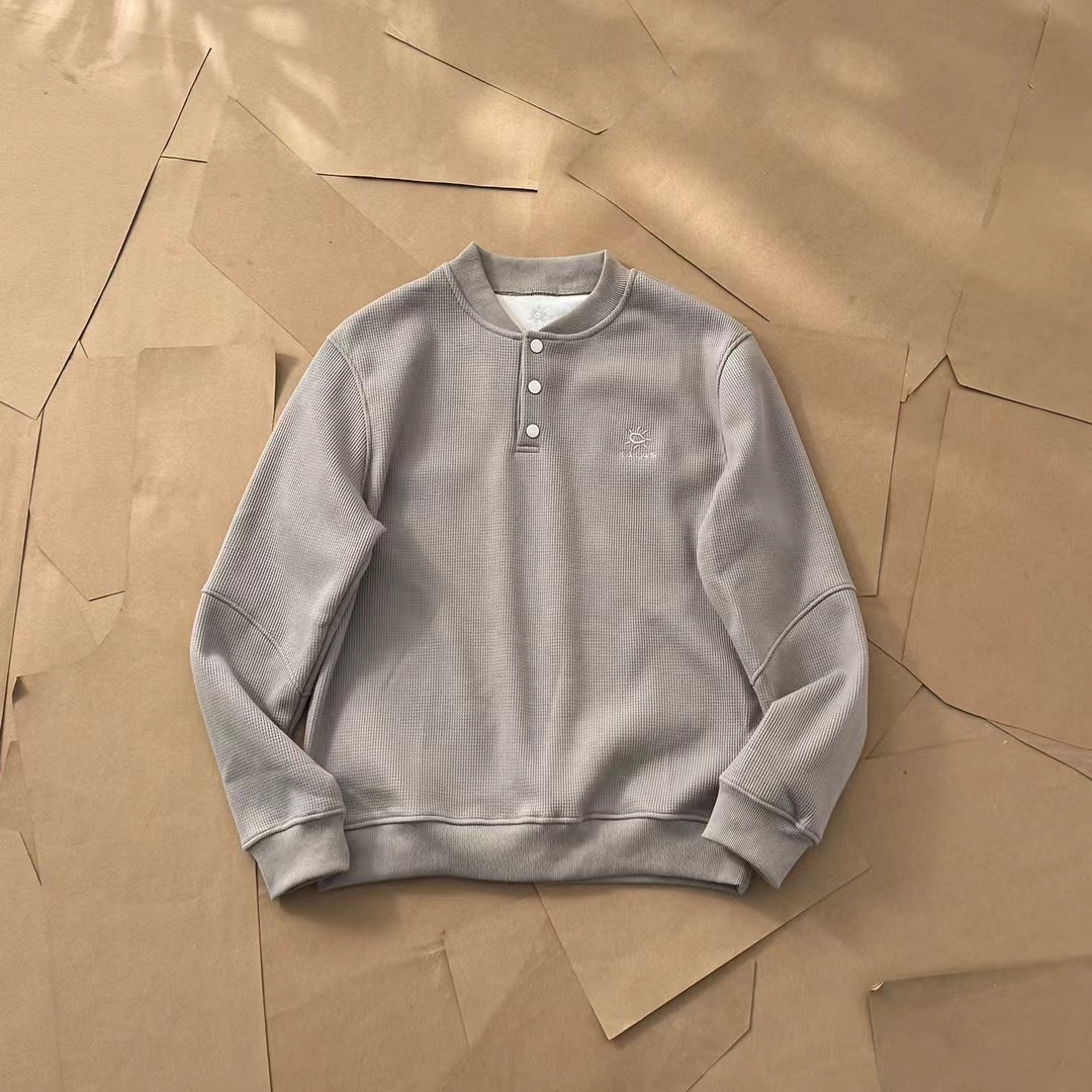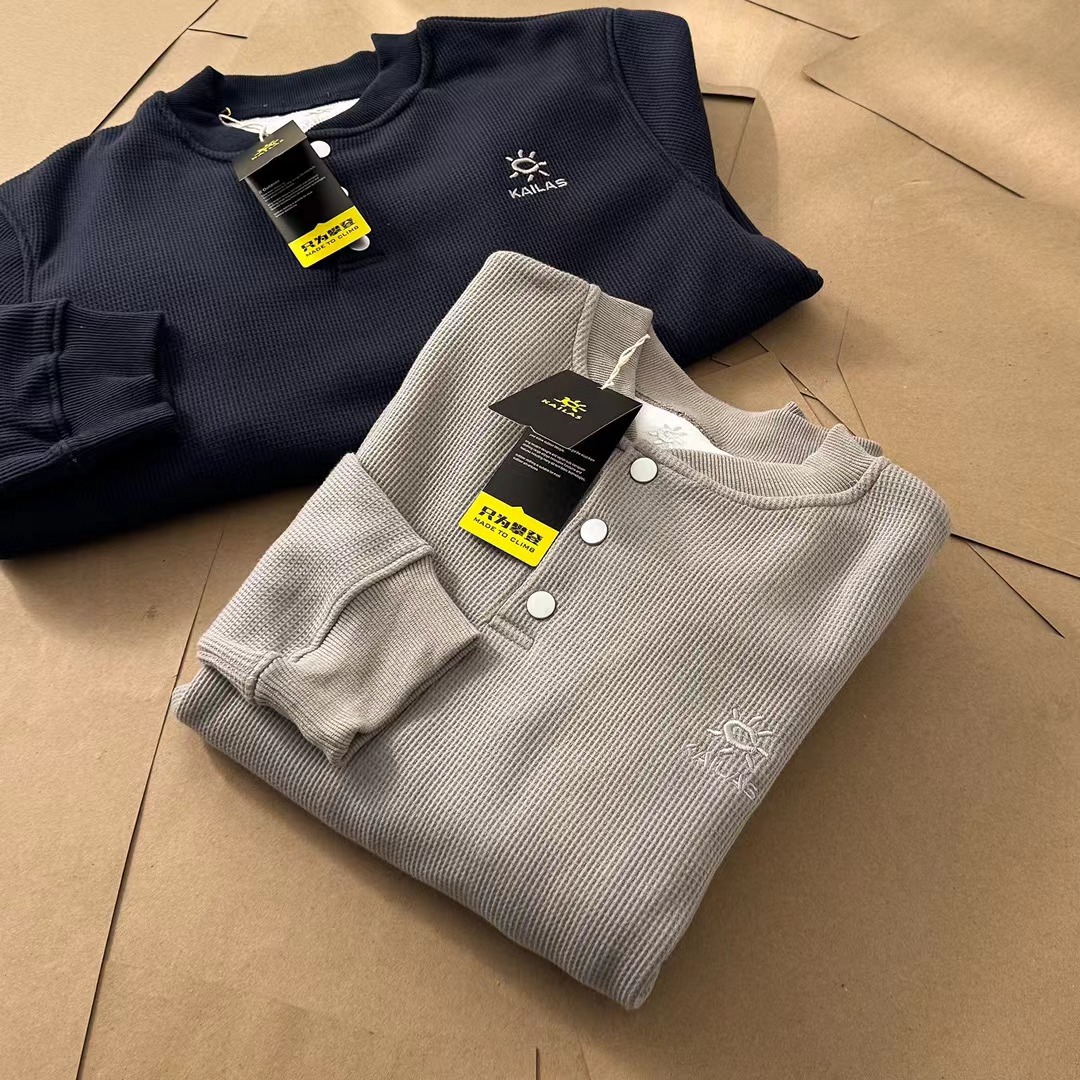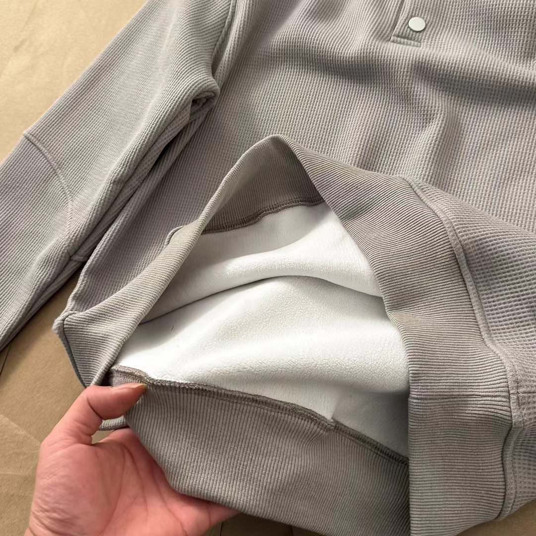 新品小立领半门巾华夫格加绒长袖打底衫卫衣长袖情侣T恤,简约大气。面料采用华夫格针织工艺,透气舒适,手感柔软,做工细腻。防风半门襟纽扣立领轻量保暖抓绒衫,这款运动衫不仅集时尚与功能于一身,更以其卓 越的性能成为户外运动的理想伴侣,高效保暖,黑科技运动户外面料,这种材料不仅具有出色的保暖性能,还兼具极高的柔韧性。其轻质特性使得运动衫在提供温暖的同时,不会给身体带来额外的负担,非常适合长时间户外活动。新款加绒长袖小立领设计,非常有味道!胸前标志性刺绣logo线条饱满摸起来带有层次感,十分精 致!双肩下方做了拼接以及双针压线!高透气性,快干舒适,这种材料的高透气性和快干特性,让这款运动衫在户外环境中表现出色。内部独特的“华夫格”结构设计,不仅增加了隔热性能,还能将汗水迅速吸至材料顶部,加快干燥速度,保持身体干爽舒适。半门襟纽扣,灵活穿脱,使得这款运动衫更容易穿脱,同时也便于在温暖的日子里快速通风,调节体温。立领设计则有效防止冷风侵袭,保护颈部不受寒冷侵适合日常休闲或运动场合,面料柔软舒适,穿着体验极 佳。