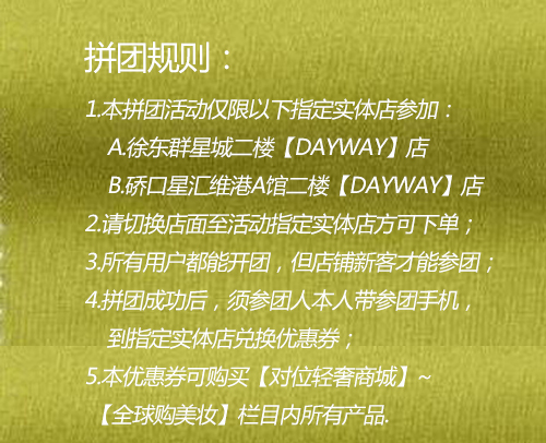 200元大牌美妆拼团兑换码凭兑换码到参加活动实体店兑换:群星城二楼【DAYWAY】店/硚口星汇维港A馆二楼【DAYWAY】店
