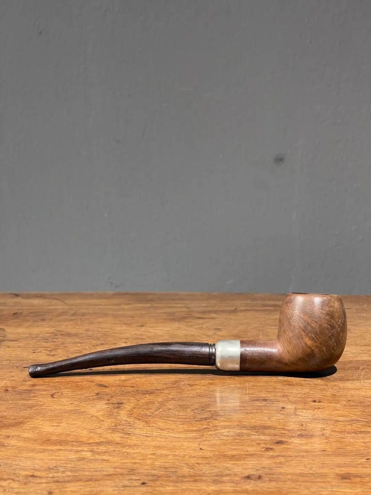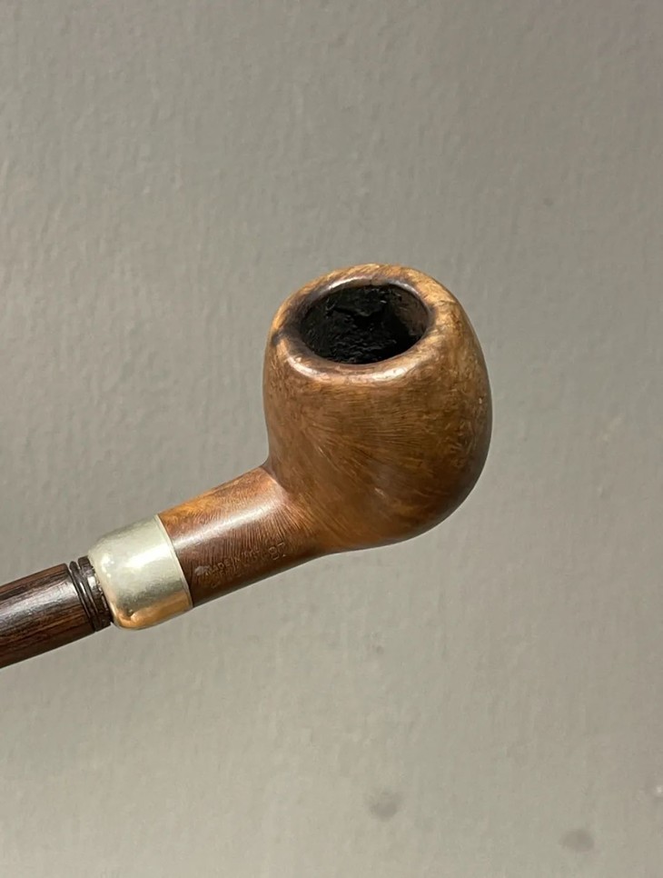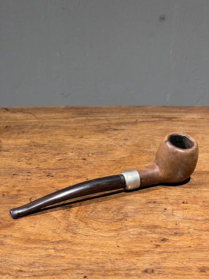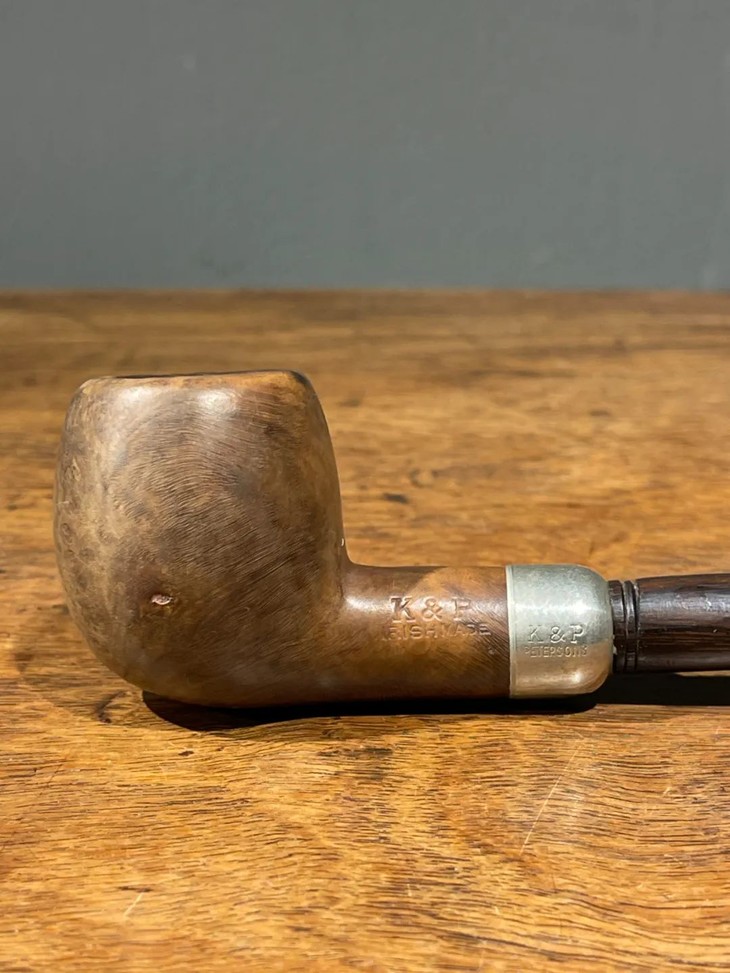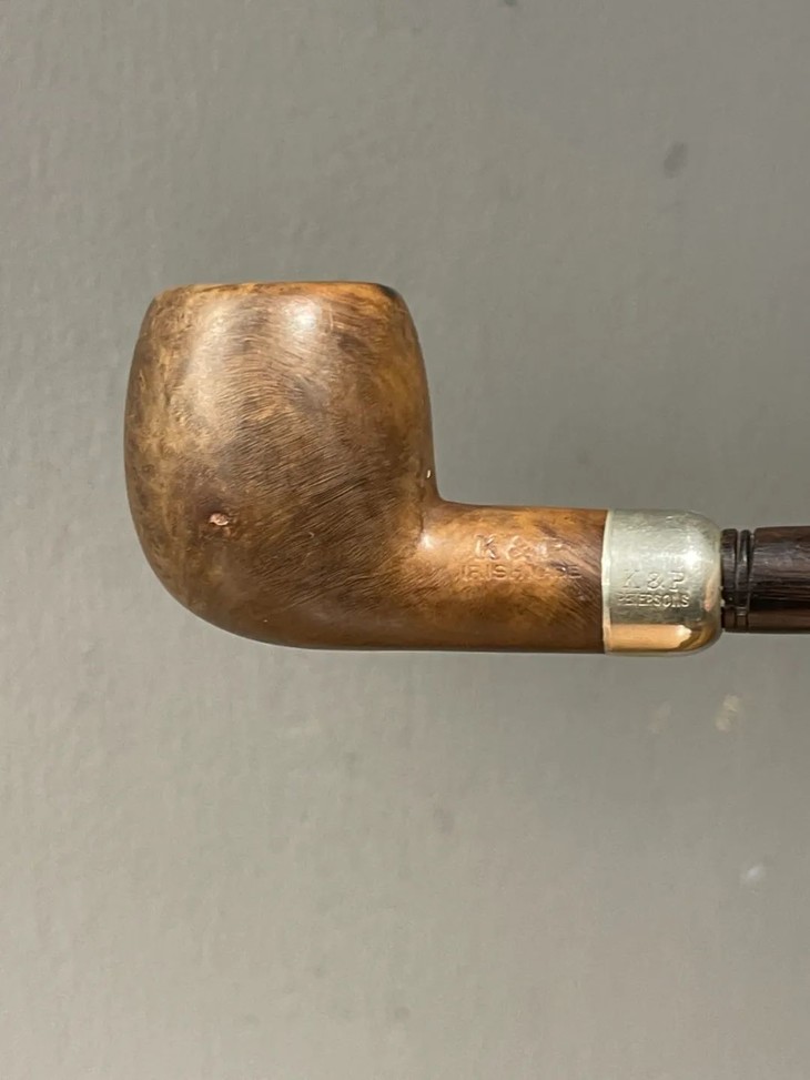 这是一件年代老、取材精良、制作严谨的欧洲知名品牌老烟斗,以紋理清晰、质地坚硬的石楠木正木挖空雕琢成烟斗,镶银合金连结一体成形的乌木烟管/烟嘴,整体造型简约贵气,琢磨细緻,商标錾刻於银环与烟斗侧面“K & P IRISH MADE” 以及 “K & P PETERSON’S”,“MADE IN THE REPUBLIC OF IRLAND 87", 所指的是西元1865 年创立于爱尔兰都柏林,是全球持续运营 年代最久的烟斗公司,此件形式典雅高贵的欧式烟斗应是1980年代的古典烟斗。
