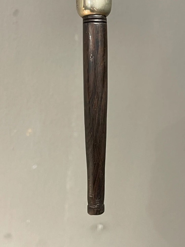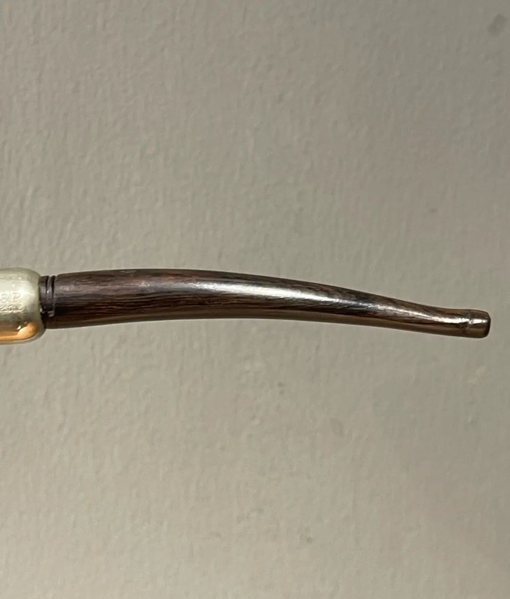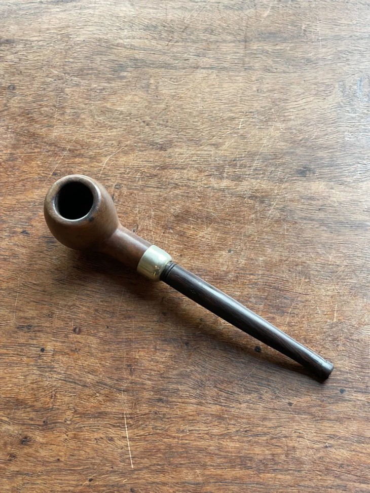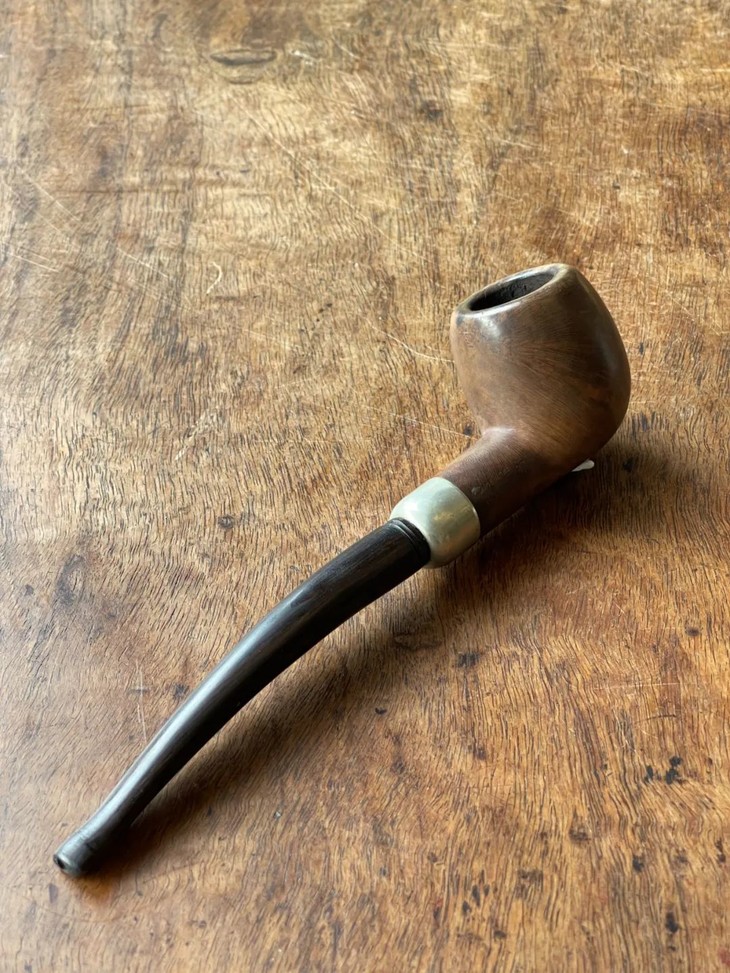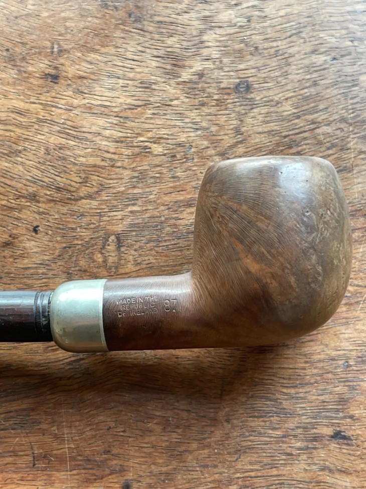 这是一件年代老、取材精良、制作严谨的欧洲知名品牌老烟斗,以紋理清晰、质地坚硬的石楠木正木挖空雕琢成烟斗,镶银合金连结一体成形的乌木烟管/烟嘴,整体造型简约贵气,琢磨细緻,商标錾刻於银环与烟斗侧面“K & P IRISH MADE” 以及 “K & P PETERSON’S”,“MADE IN THE REPUBLIC OF IRLAND 87", 所指的是西元1865 年创立于爱尔兰都柏林,是全球持续运营 年代最久的烟斗公司,此件形式典雅高贵的欧式烟斗应是1980年代的古典烟斗。