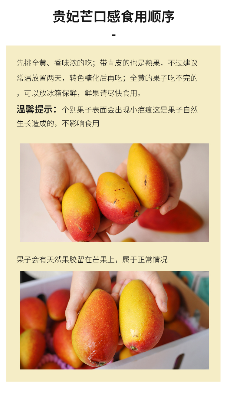 先挑全黄、香味浓的吃;带青皮的也是熟果,不过建议常温放置两天,转色糖化后再吃;全黄的果子吃不完的,可以放冰箱保鲜,鲜果请尽快食用。