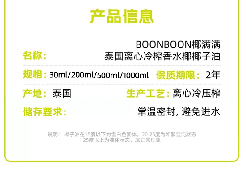 【品名】BOONBOON 椰满满冷榨椰子油 泰国原装进口 椰香浓郁 食护两用 【规格】1000ml、500ml、200ml、30ml 【产地】泰国 【保质期】2年 【发货包装】独立包装 【发货地】浙江 【发货快递】中通 【不发货区域】新疆、西藏、港澳台 【补邮费地区】内蒙古、甘肃、青海、宁夏、海南+5元/单 【发货时效】48-72小时,周末节假日顺延 |
