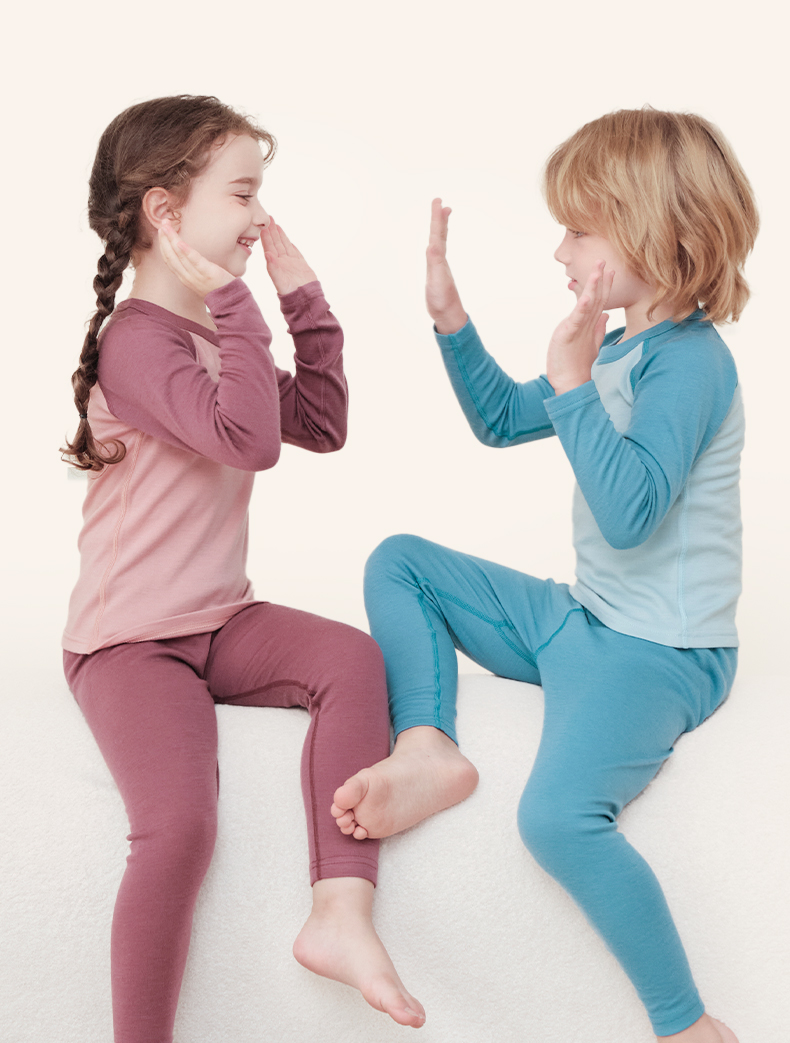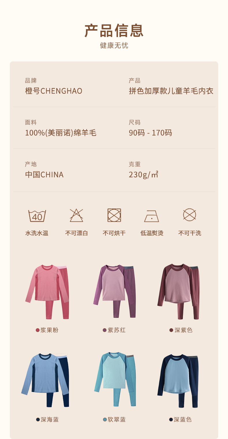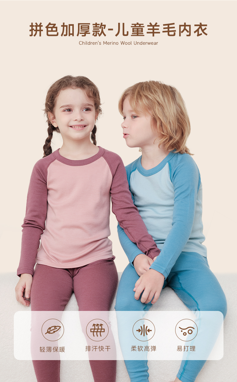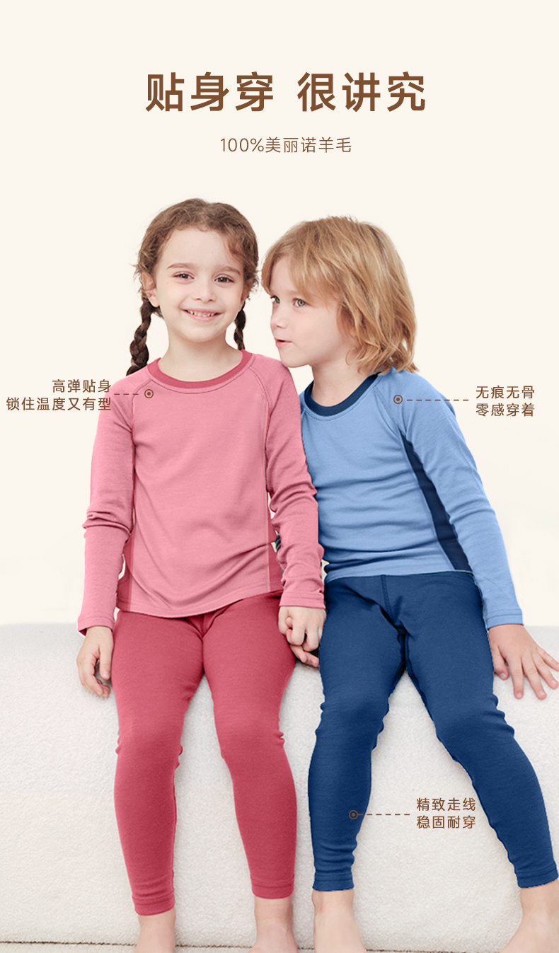 低于双12【90-170码】橙号100%美丽诺羊毛儿童拼色加厚款秋衣秋裤2025年 克重230g/㎡