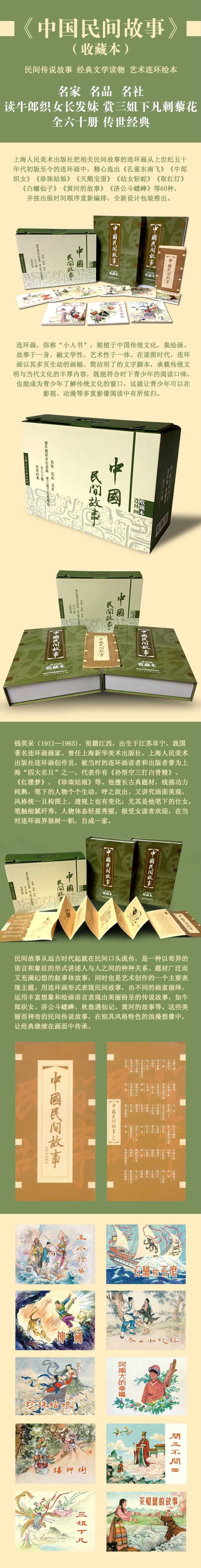 上海人民美术出版社把相关民间故事的连环画从上世纪五十年代初版至今的连环画中,精心选出《孔雀东南飞》《牛郎织女》《珍珠姑娘》《天鹅宝蛋》《幼女斩蛇》《取红灯》《白螺仙子》《黄河的故事》《济公斗蟋蟀》等60种,并按出版时间顺序重新编排,全新设计包装推出。