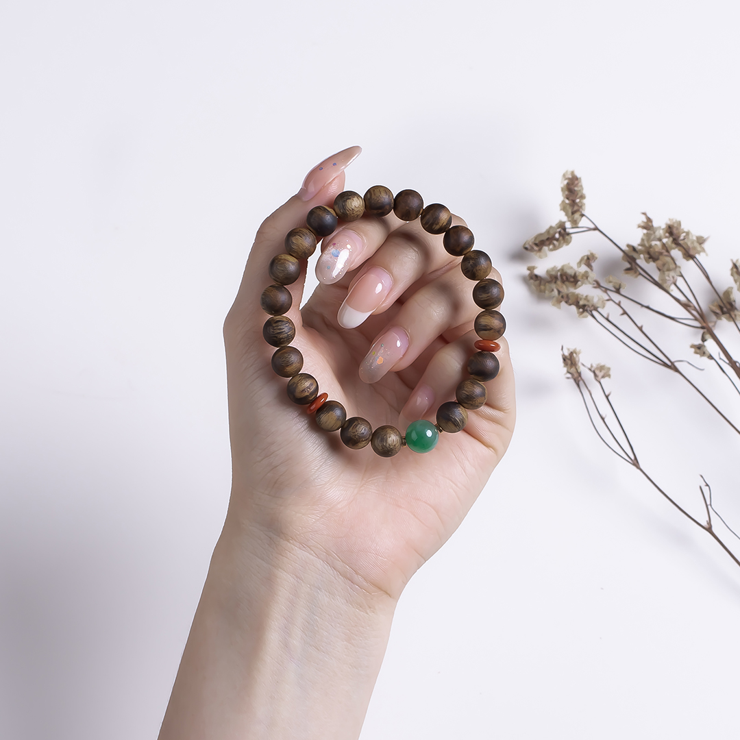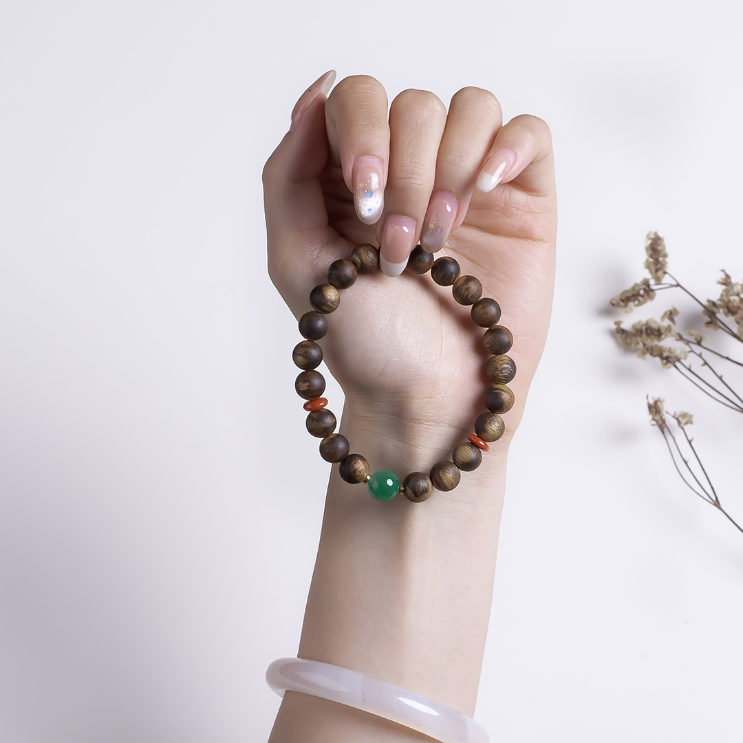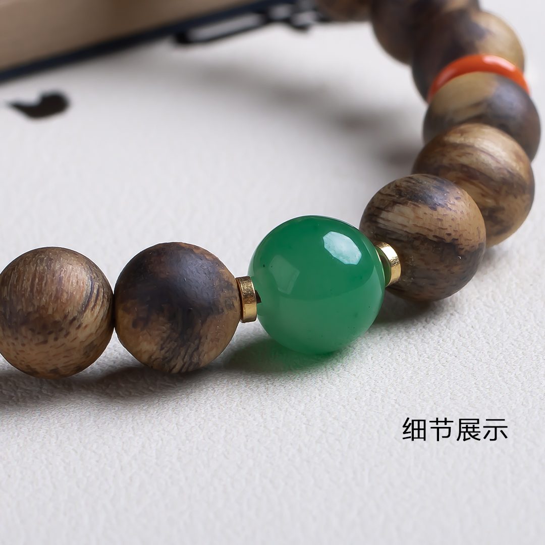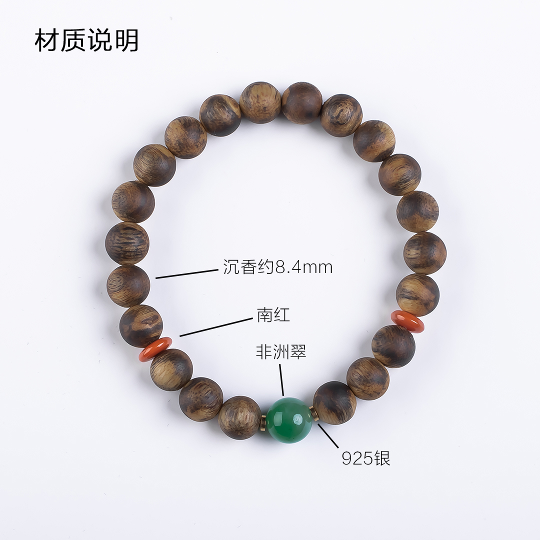 xy0529虎斑纹沉香+非洲翠南红手串.银,天然沉香约8.4mm,特色虎斑纹料子,原色原味,香味自然清甜,款式简约大方,上手优雅百搭。