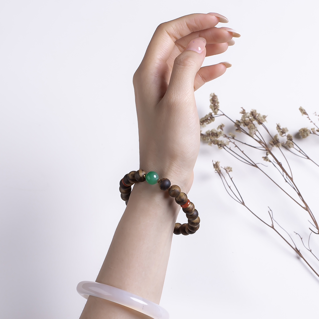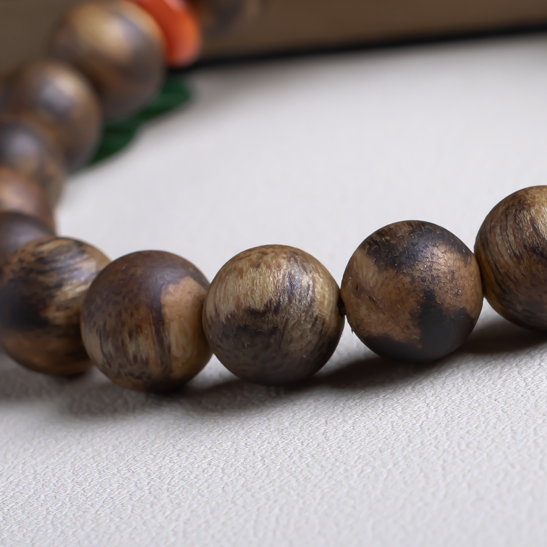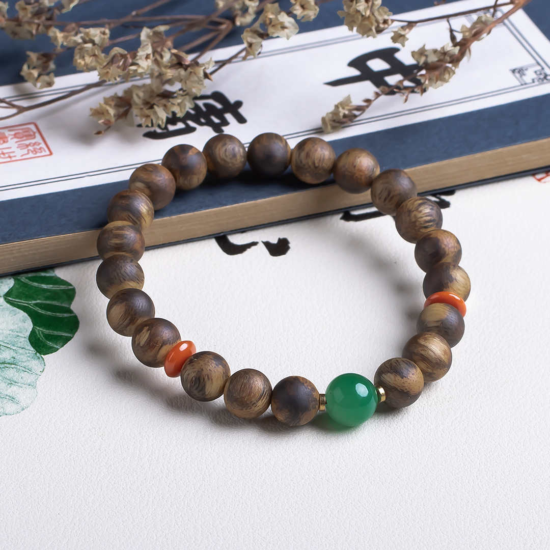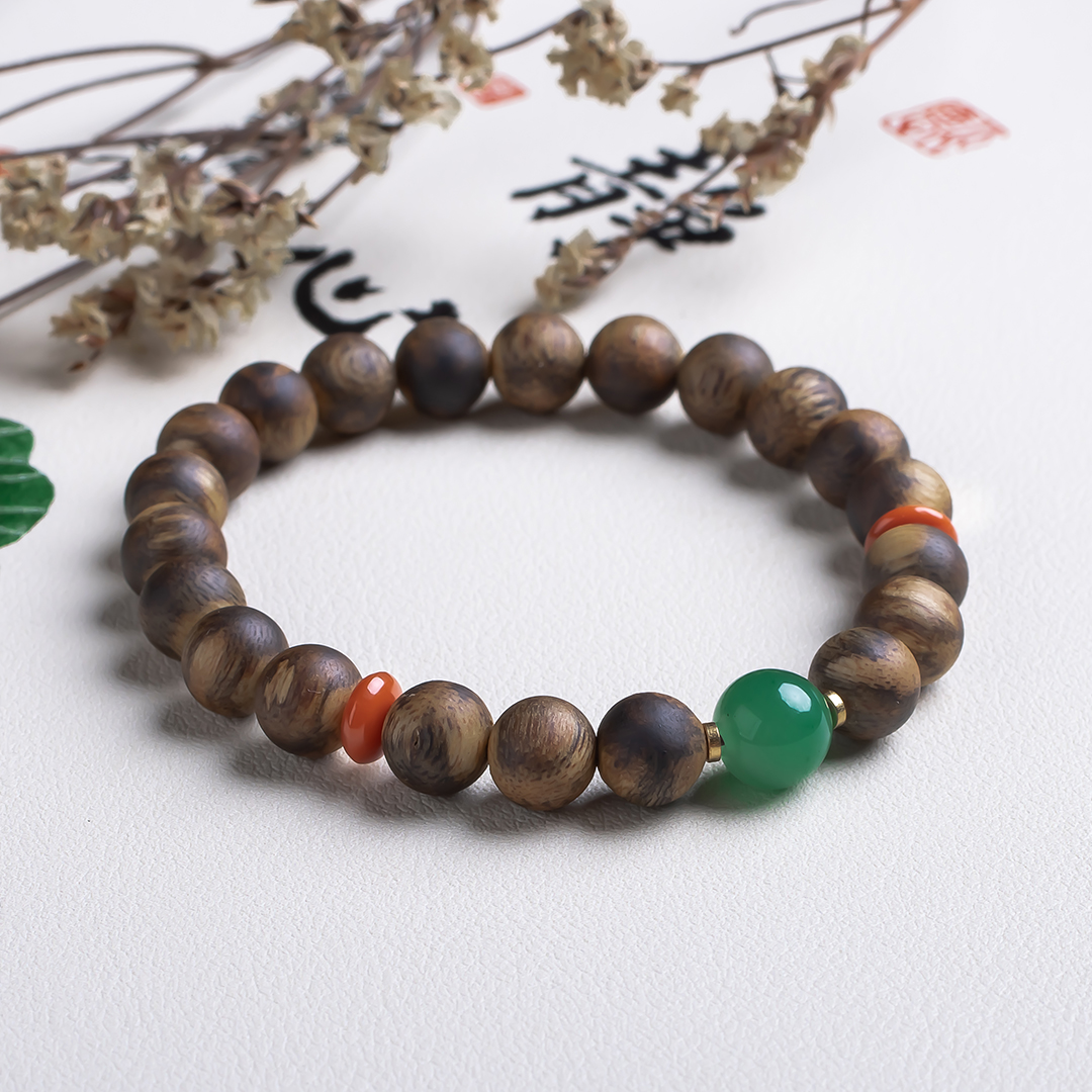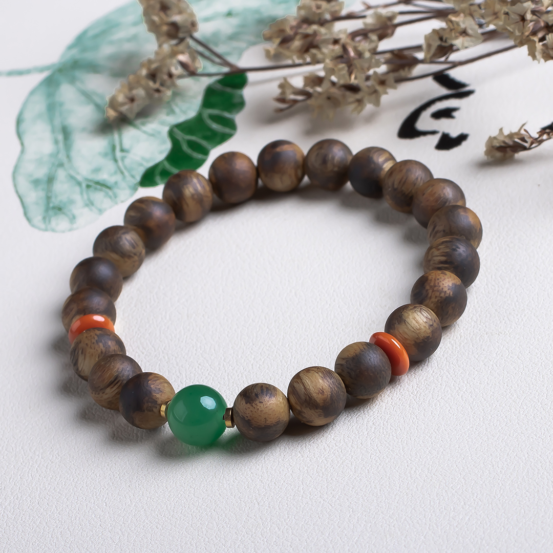 xy0529虎斑纹沉香+非洲翠南红手串.银,天然沉香约8.4mm,特色虎斑纹料子,原色原味,香味自然清甜,款式简约大方,上手优雅百搭。