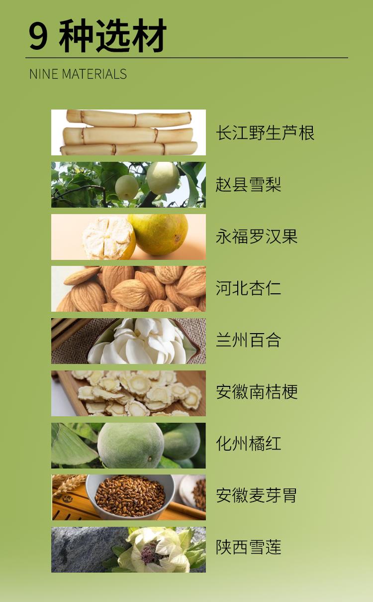【配料表】水、雪梨、鲜芦根、罗汉果、百合、桔梗、杏仁、桔红、麦芽、雪莲培养物、低聚异麦芽糖、约氏乳杆菌