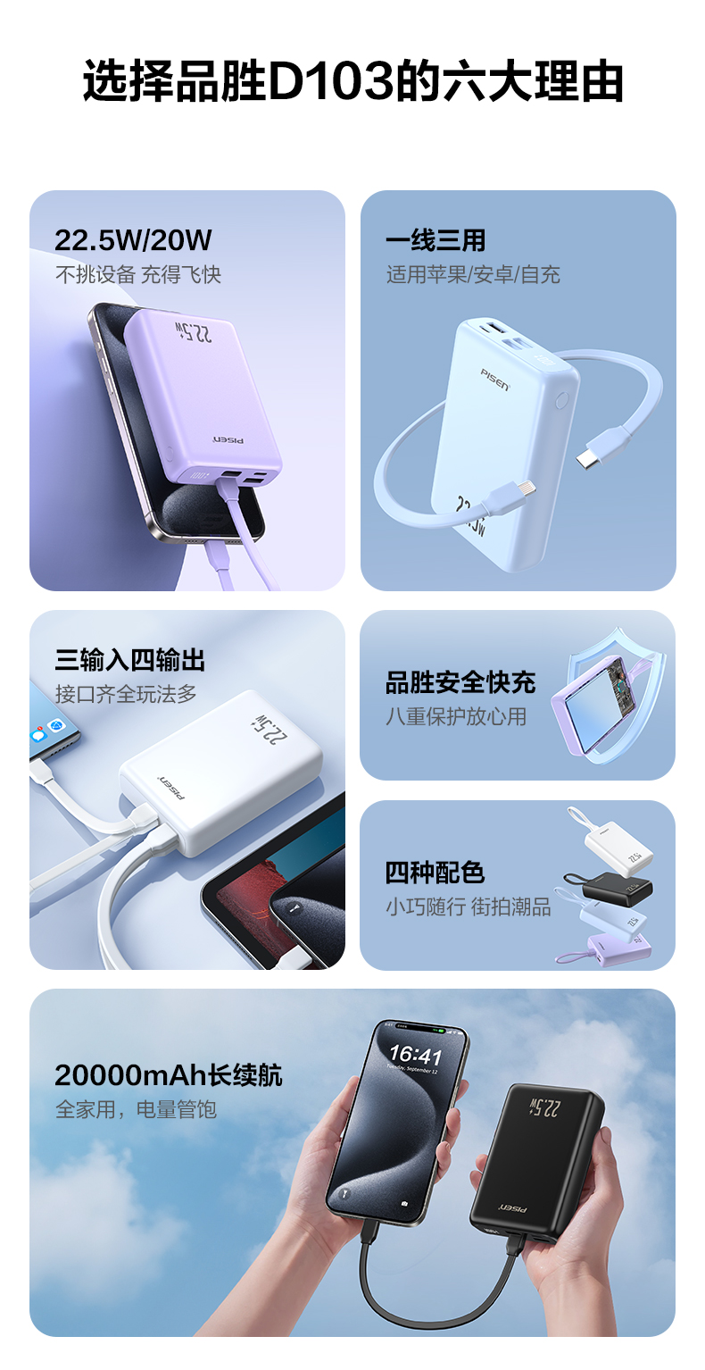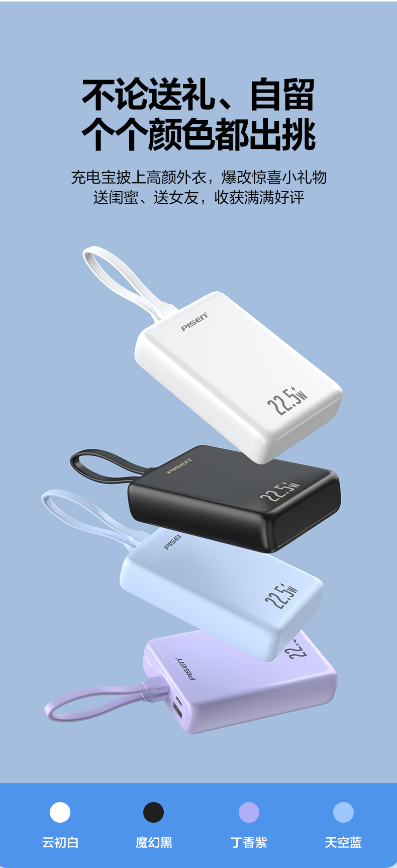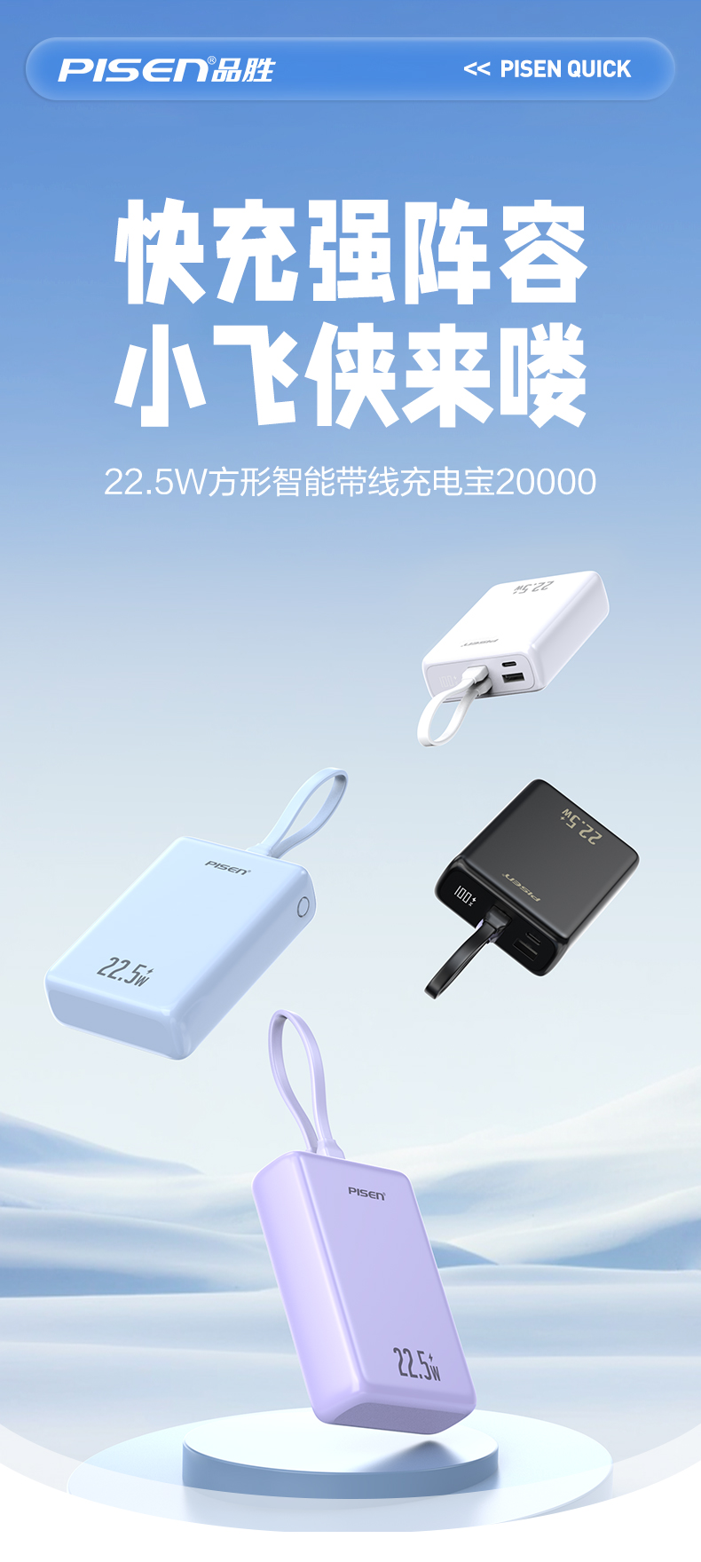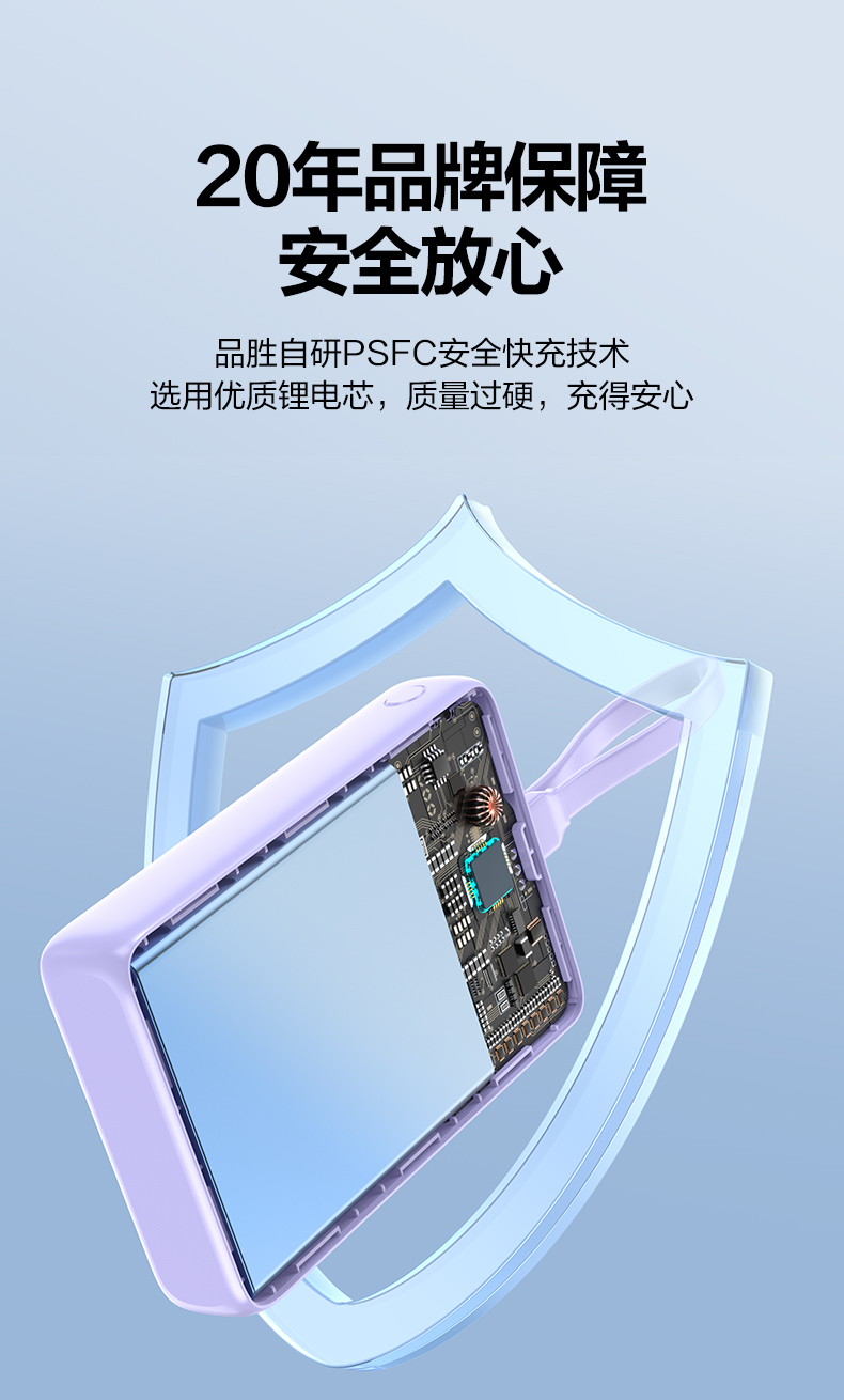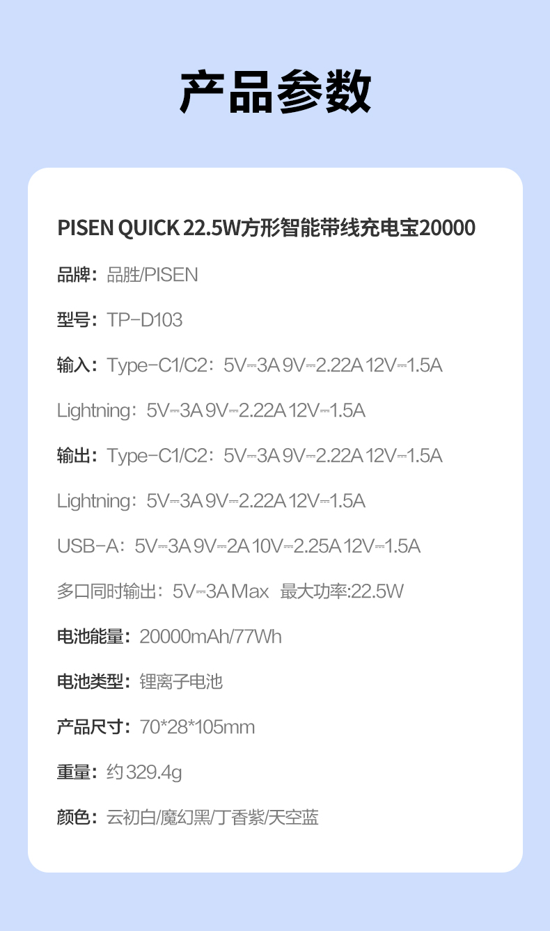 品胜 22.5W方形智能带线充电宝20000毫安 自带线苹果/C口数据线 快充移动电源