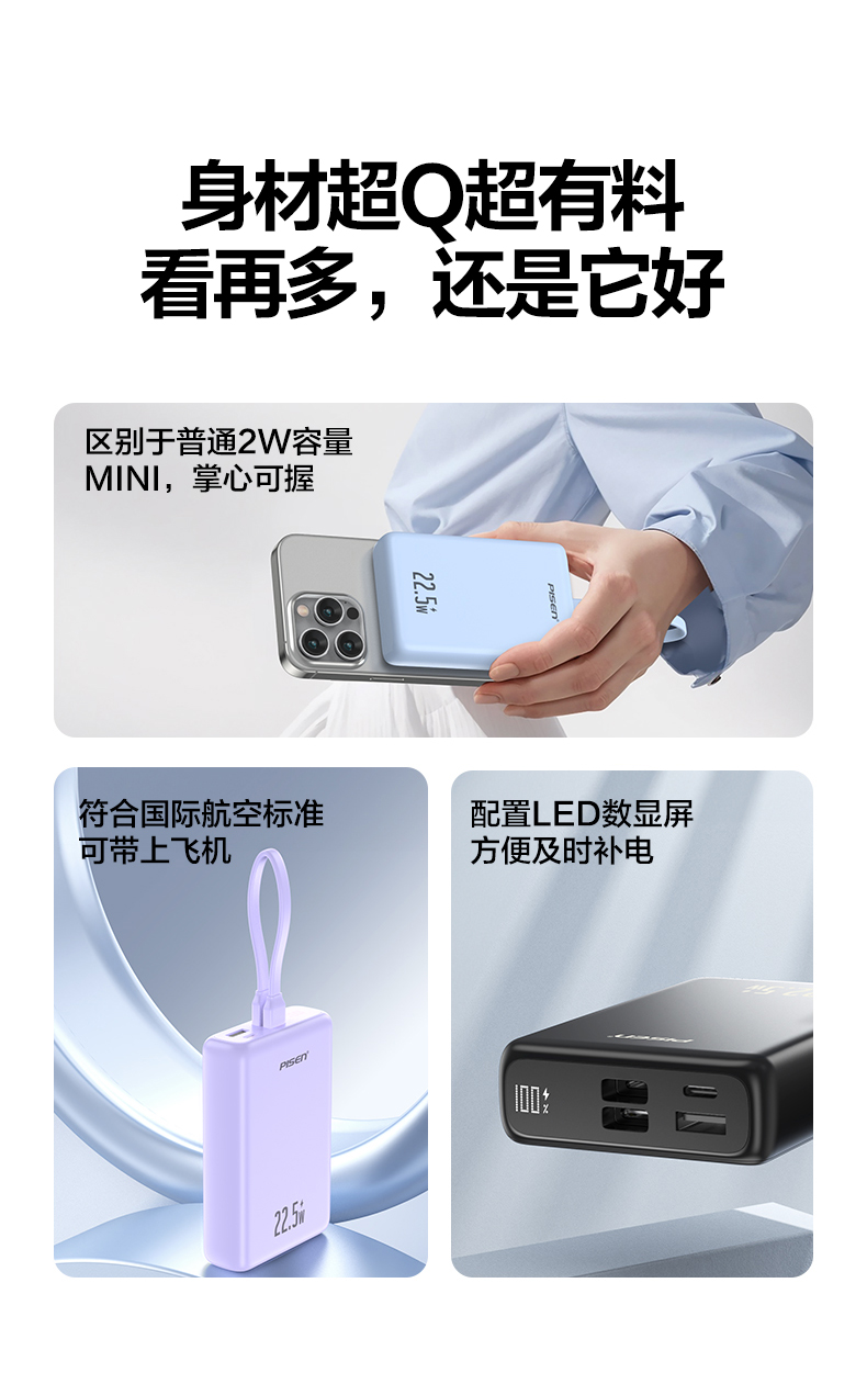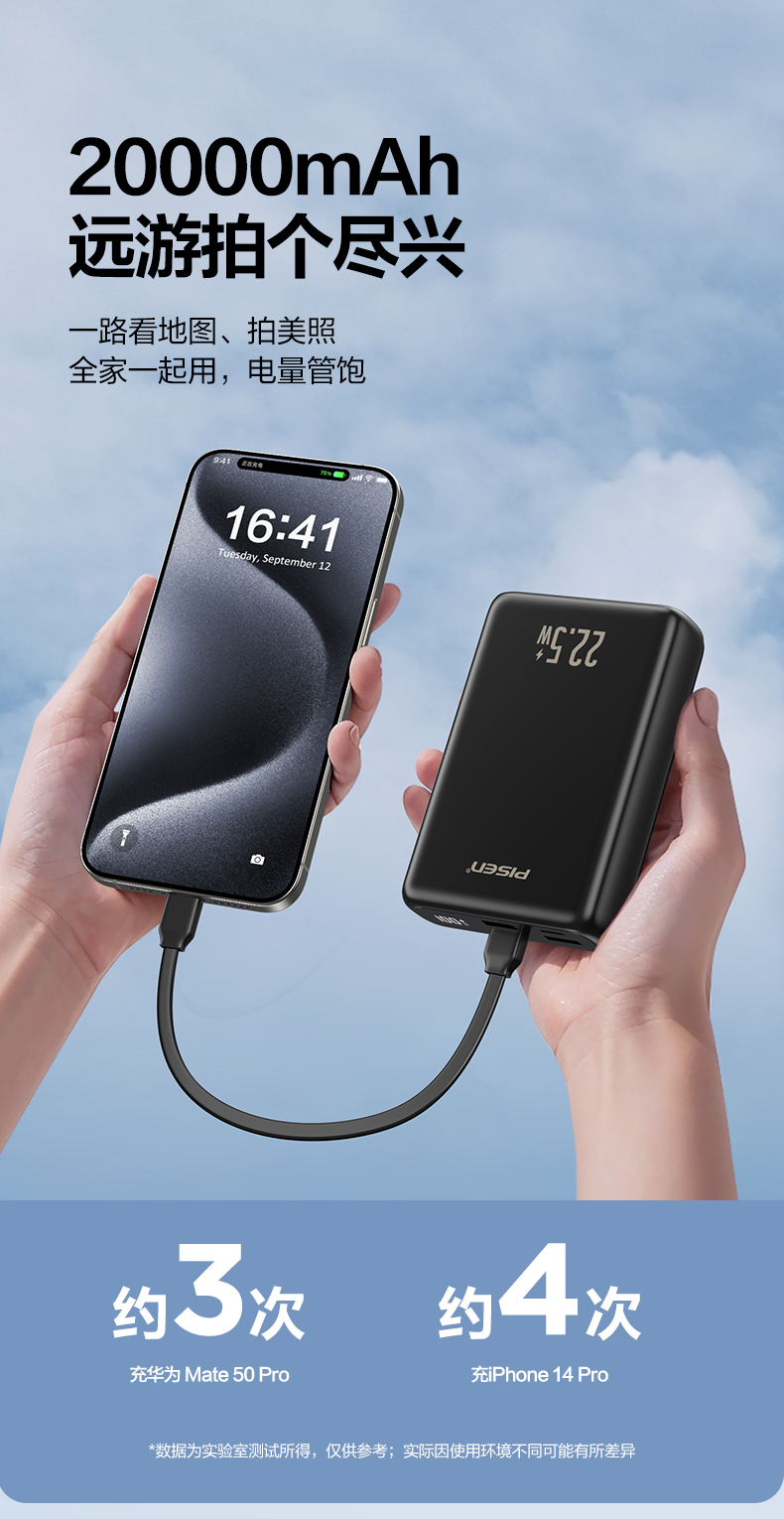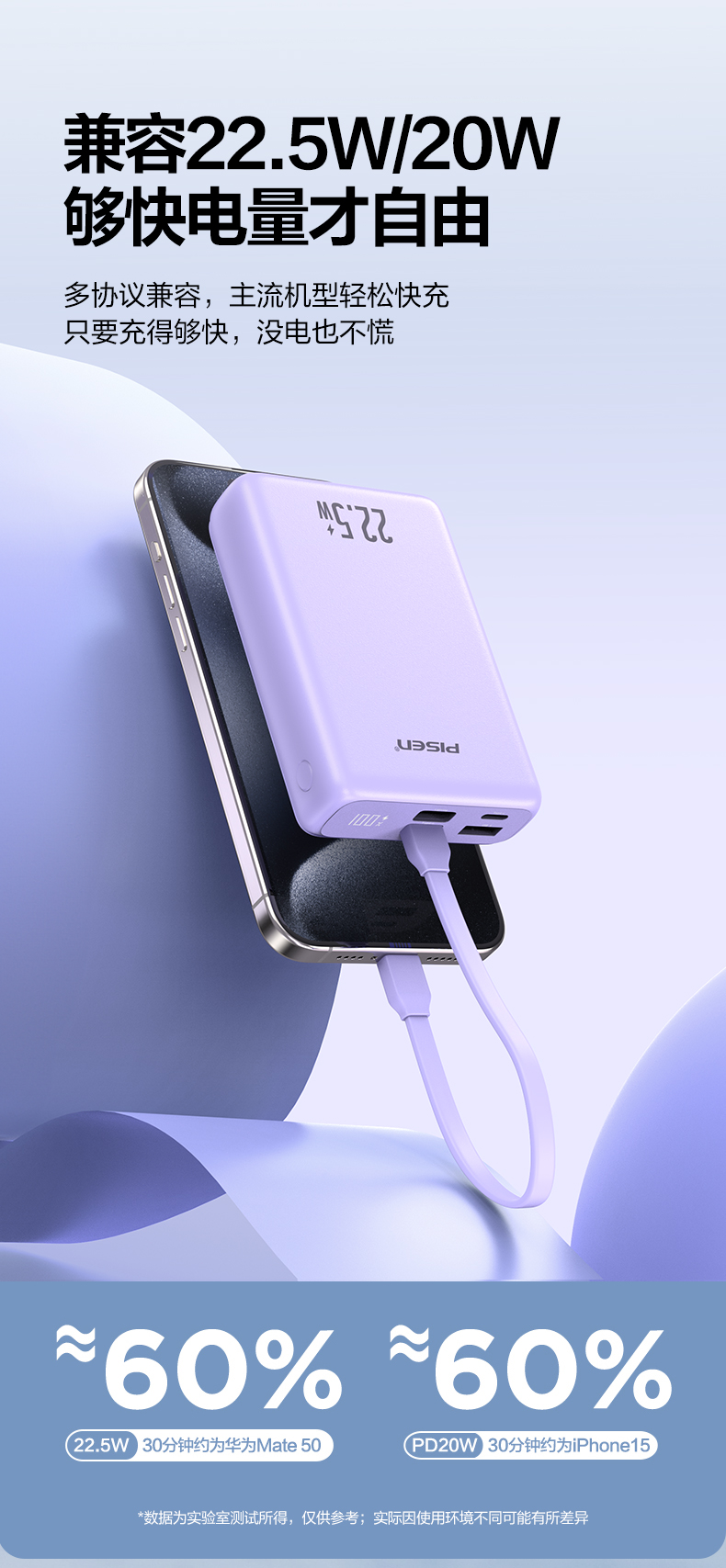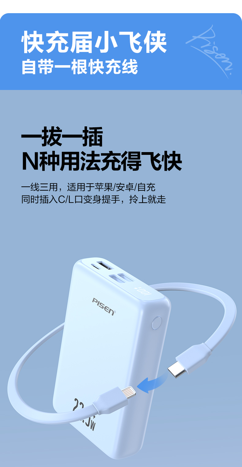 品胜 22.5W方形智能带线充电宝20000毫安 自带线苹果/C口数据线 快充移动电源