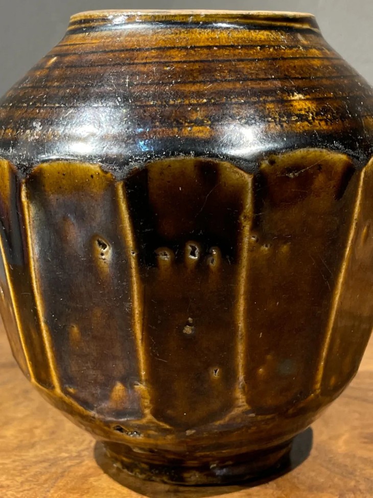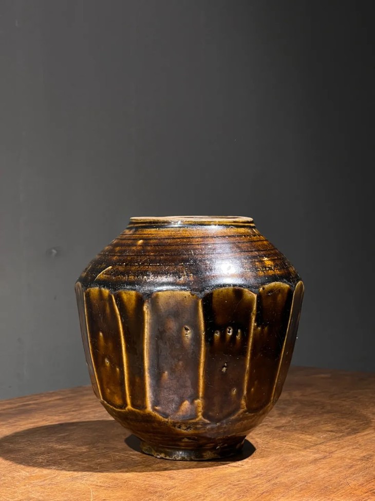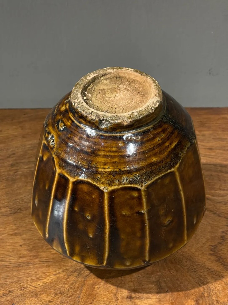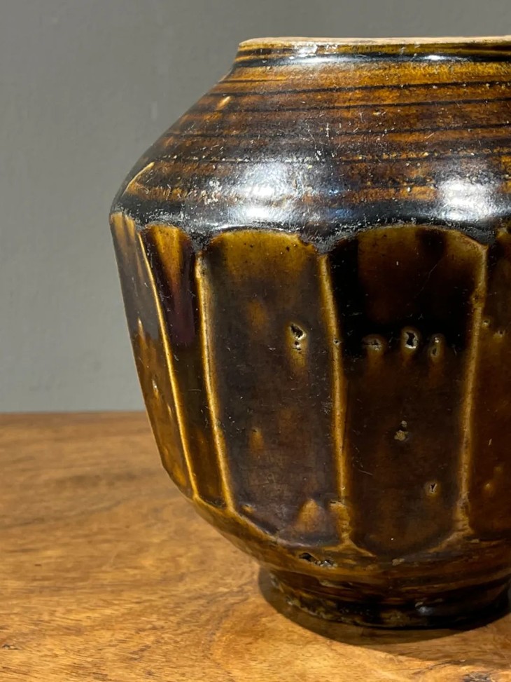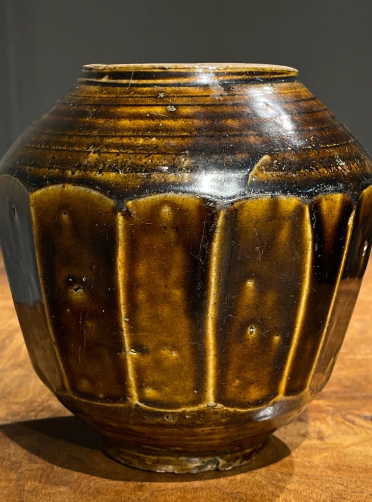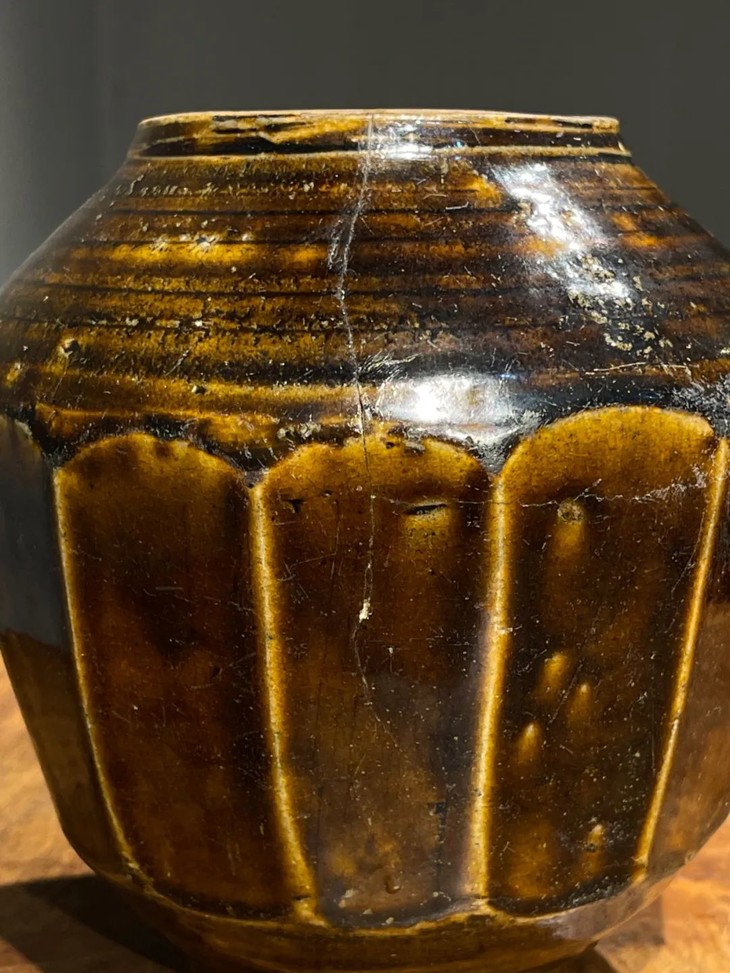 此磁州窑褐饴釉十四面片取罐,如图所示,口沿有三道明显裂痕,表面使用磨痕外,基本保存完好无损。