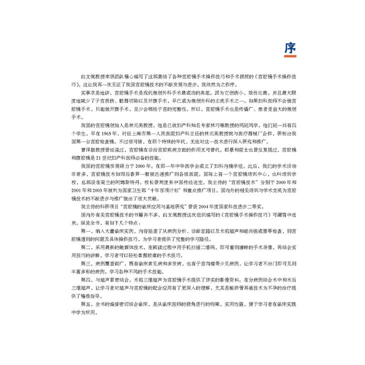 本书从宫腔镜历史渊源开篇,第二章和第三章介绍了宫腔镜手术的适应证、禁忌证以及宫腔镜器械,详细介绍了术前准备和术前检查,提示充分的准备是手术成功的前提,并详细介绍了针对宫腔镜技术的医患沟通要点和技巧。第四章“宫腔镜检查术”和第五章“宫腔镜手术技巧”是本书的重点,在介绍宫腔镜检查的基础上,重点介绍了针对各种疾病的宫腔镜手术技巧。本书还设立了宫腔镜手术相关的麻醉、医护配合以及术后管理的章节,使读者能够全流程掌握宫腔镜技术的实施要点;设立了日间病房的章节,呈现更高效的宫腔镜医疗服务流程;还设有超声影像学与宫腔镜所见的对照阅读,帮助读者提升对妇科超声图像的理解,助力医疗决策。本书配有大量视频。