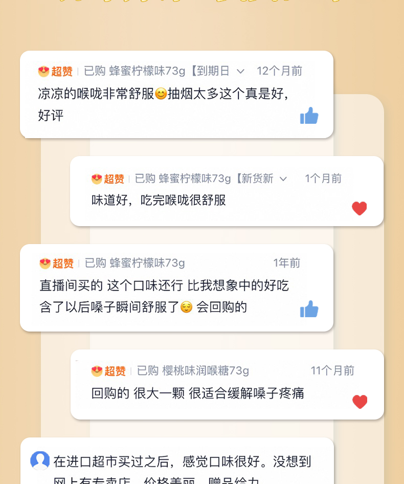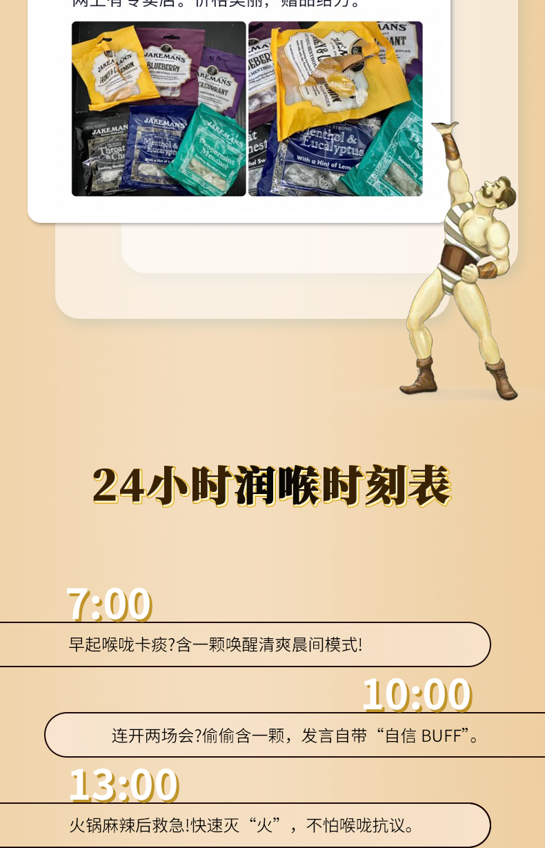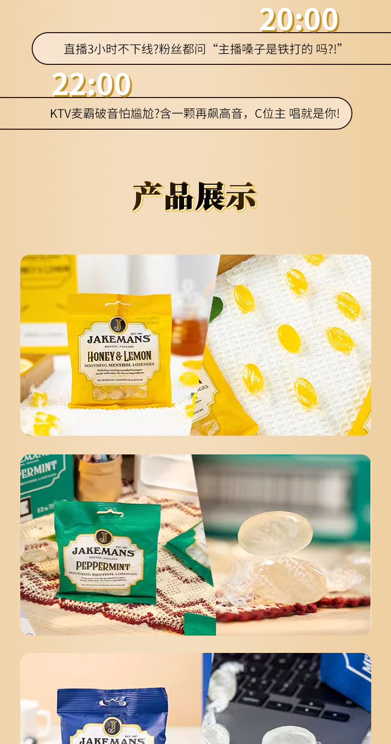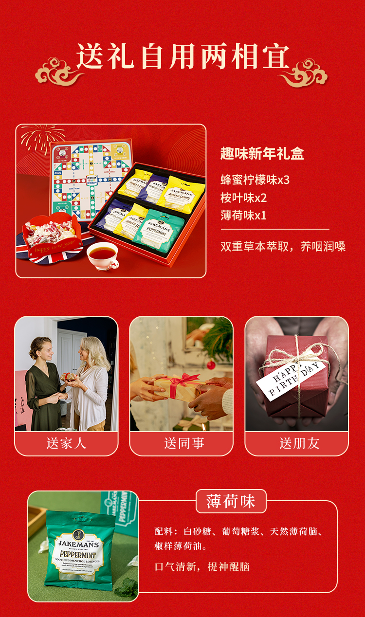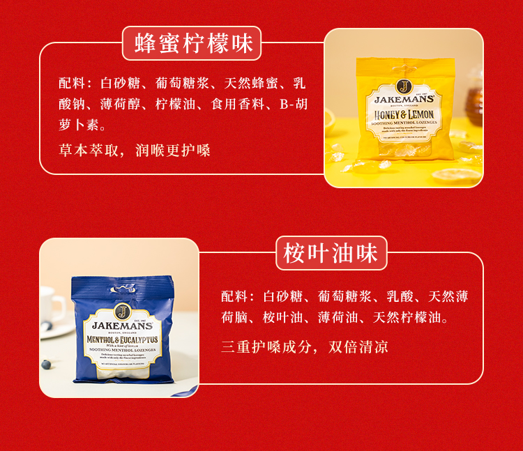 【品名】Jakemans/即口妙 润喉糖 英国百年品牌 咽炎人士救星 温和润喉糖 舒缓咽喉不适 73g/袋 【规格】 蜂蜜73g*1袋+薄荷73g*1袋+樱桃73g*1袋(随机赠2袋 到手5袋) 趣玩飞行棋礼盒(蜂蜜*3袋+桉叶*2袋+薄荷*1袋 赠英伦经典毛毡糖果盘) 【产地】英国 【保质期】2年 【发货包装】独立包装 【发货地】苏州 【发货快递】圆通、中通、韵达随机发 【不发货区域】新疆、西藏、港澳台 【发货时效】48-72小时,周末节假日顺延 |