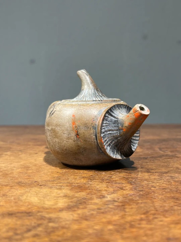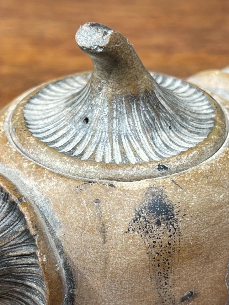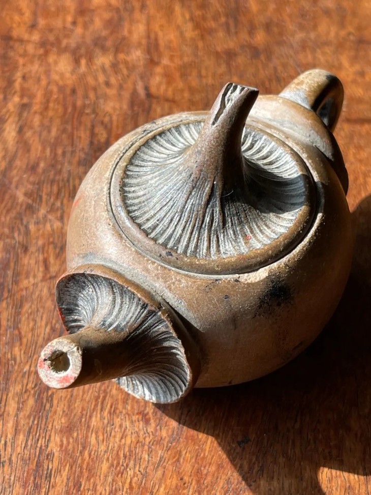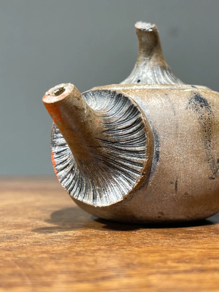 这是一件陶艺家创作的低温陶蘑菇型茶壶,低温灰陶塑型与刻划为蘑菇形把壶,器型独特创新,仿生蘑菇刻划细腻,表面纹理清晰唯妙唯肖,是独一无二的陶艺家创新茶壶。