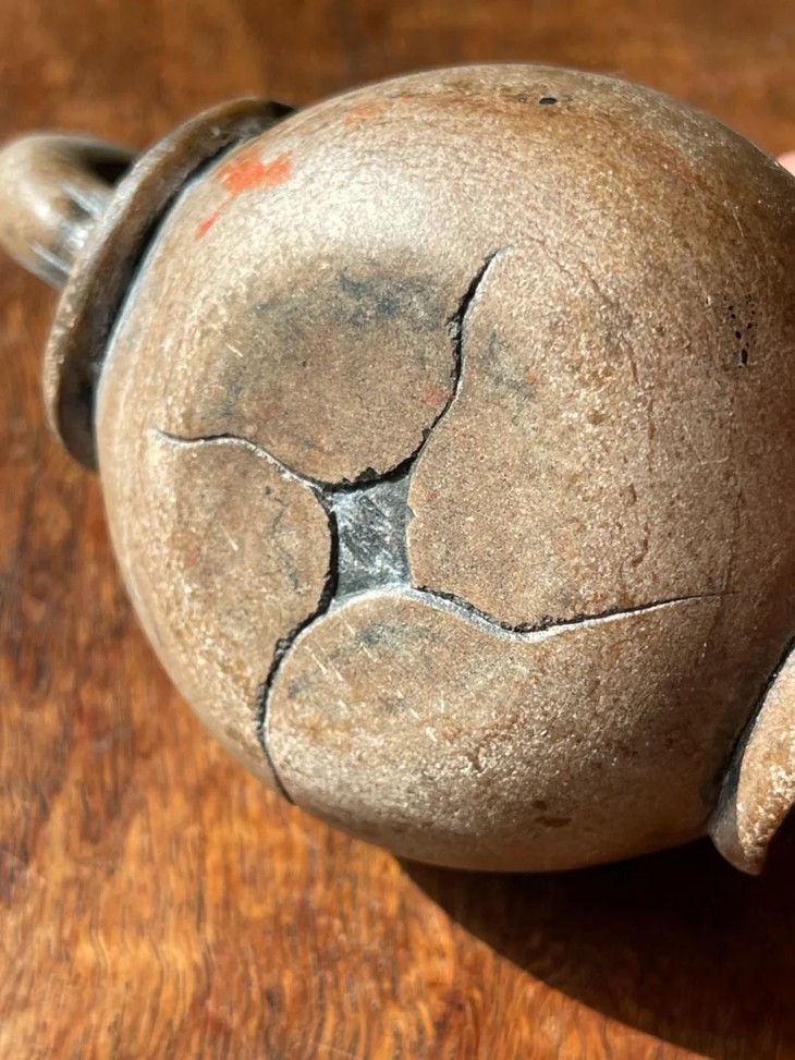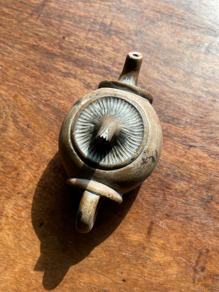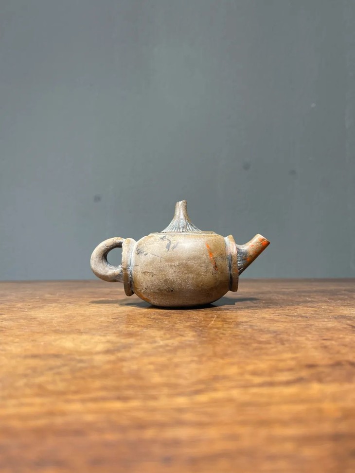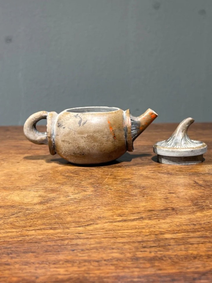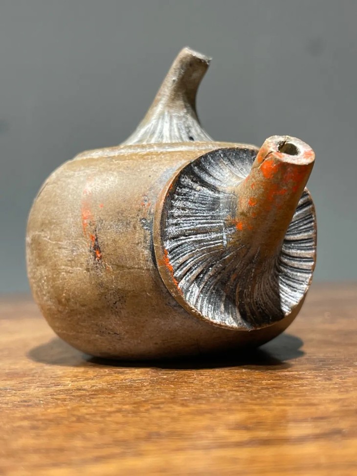 此低温陶蘑菇型茶壶,如图所示,壶流尾端磕碰后黏着一小块,表面稍磨损外,基本保存完好。