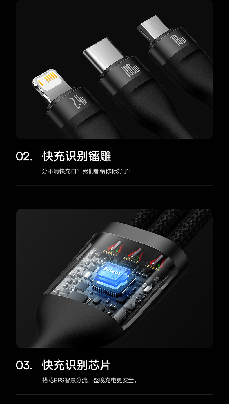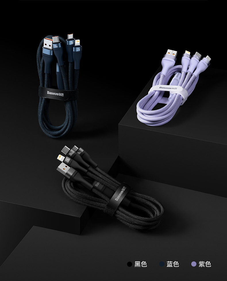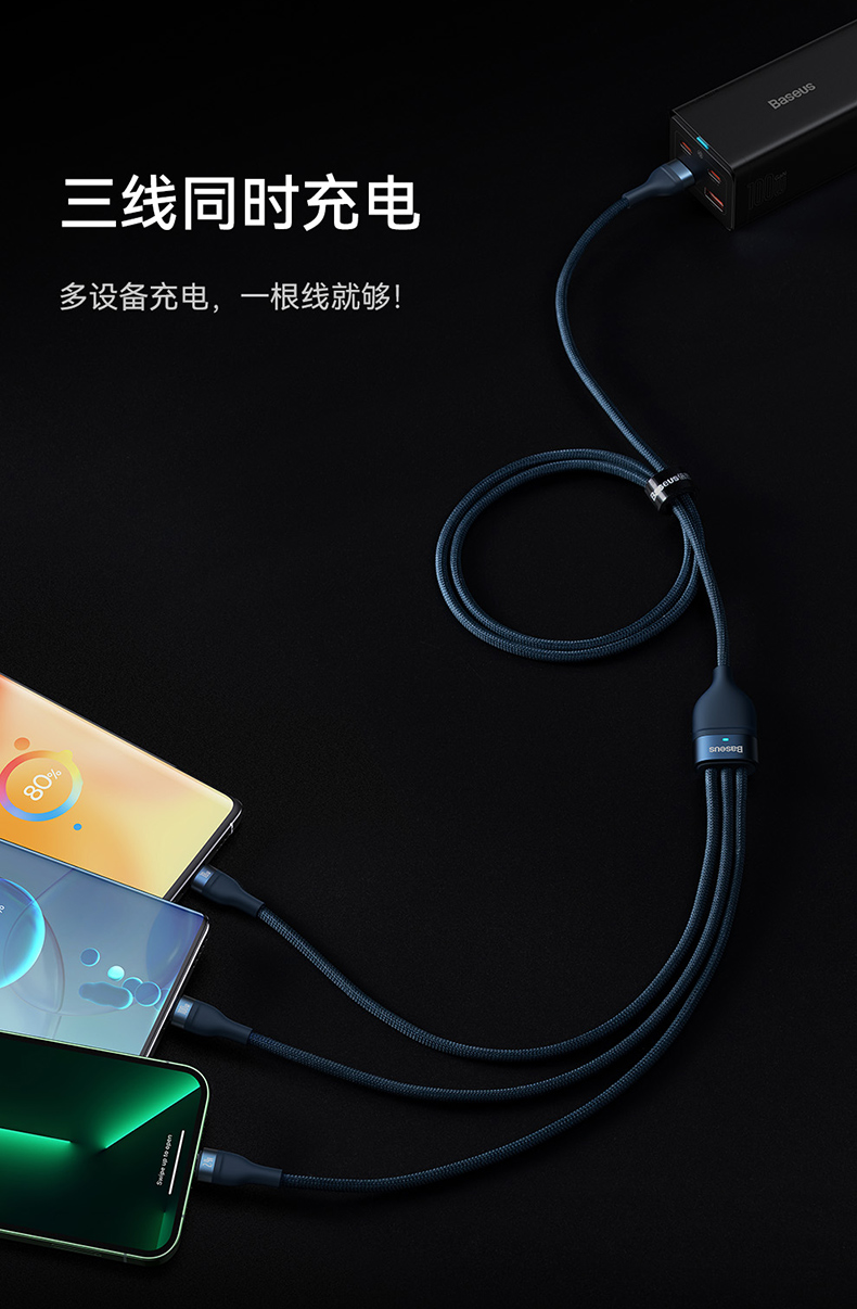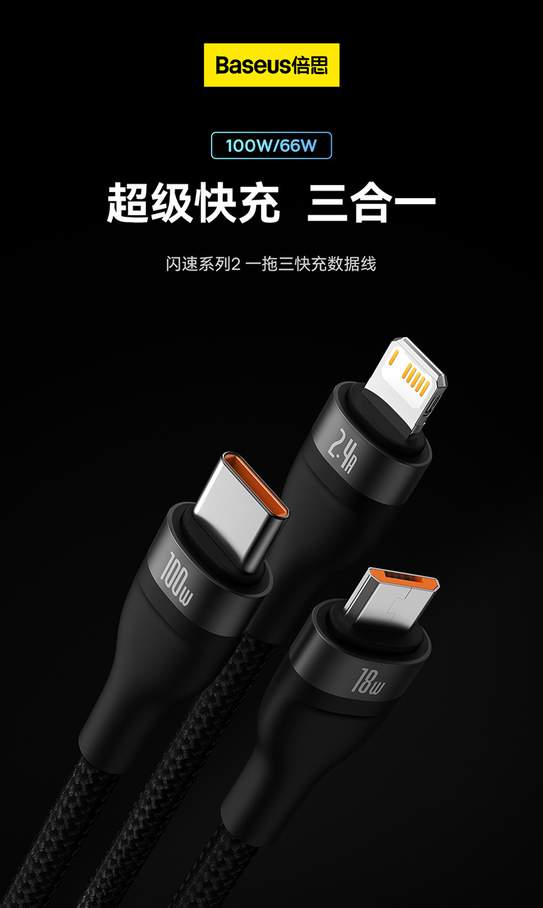 倍思 闪速系列2 一拖三快充数据线USB to M+L+C 100W 1.2m