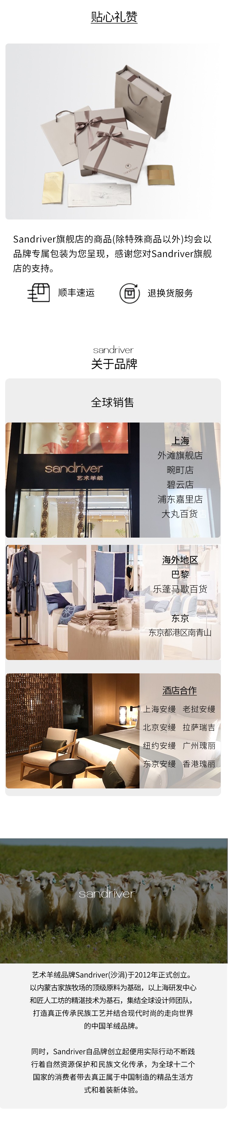 历年在巴黎时装周亮相,享誉世界的艺术羊绒品牌[Sandriver 沙涓]由羊绒布道者郭秀玲女士创立。阿拉善自有牧场纯种羔羊绒,日本国宝设计师小筱顺子,上海自有基地精工细作。承载羊绒情怀,坚持匠人品质。