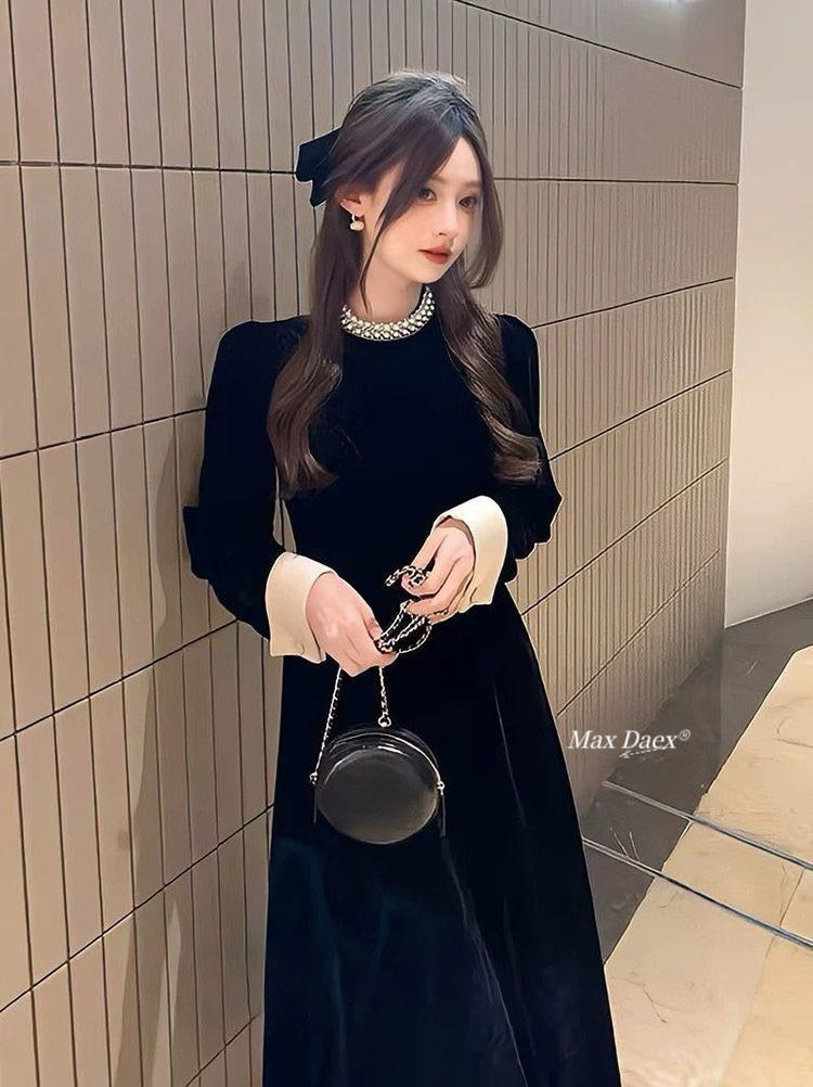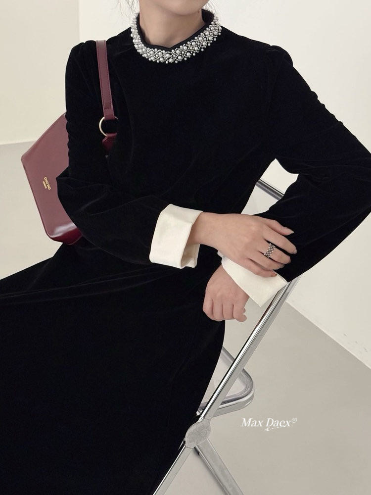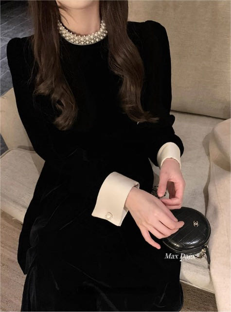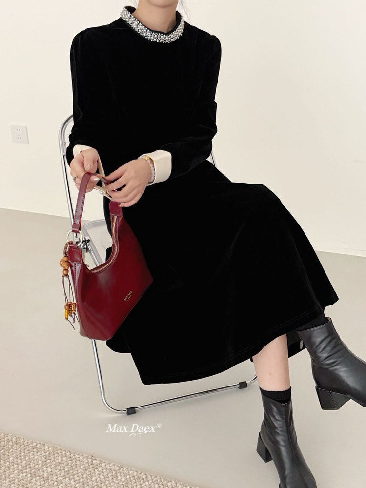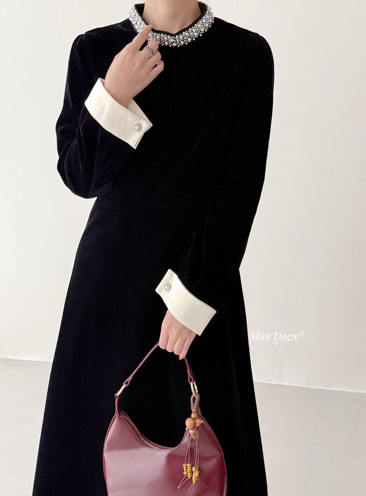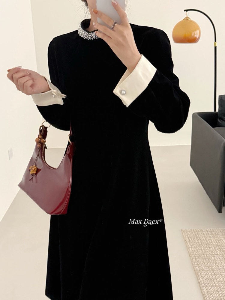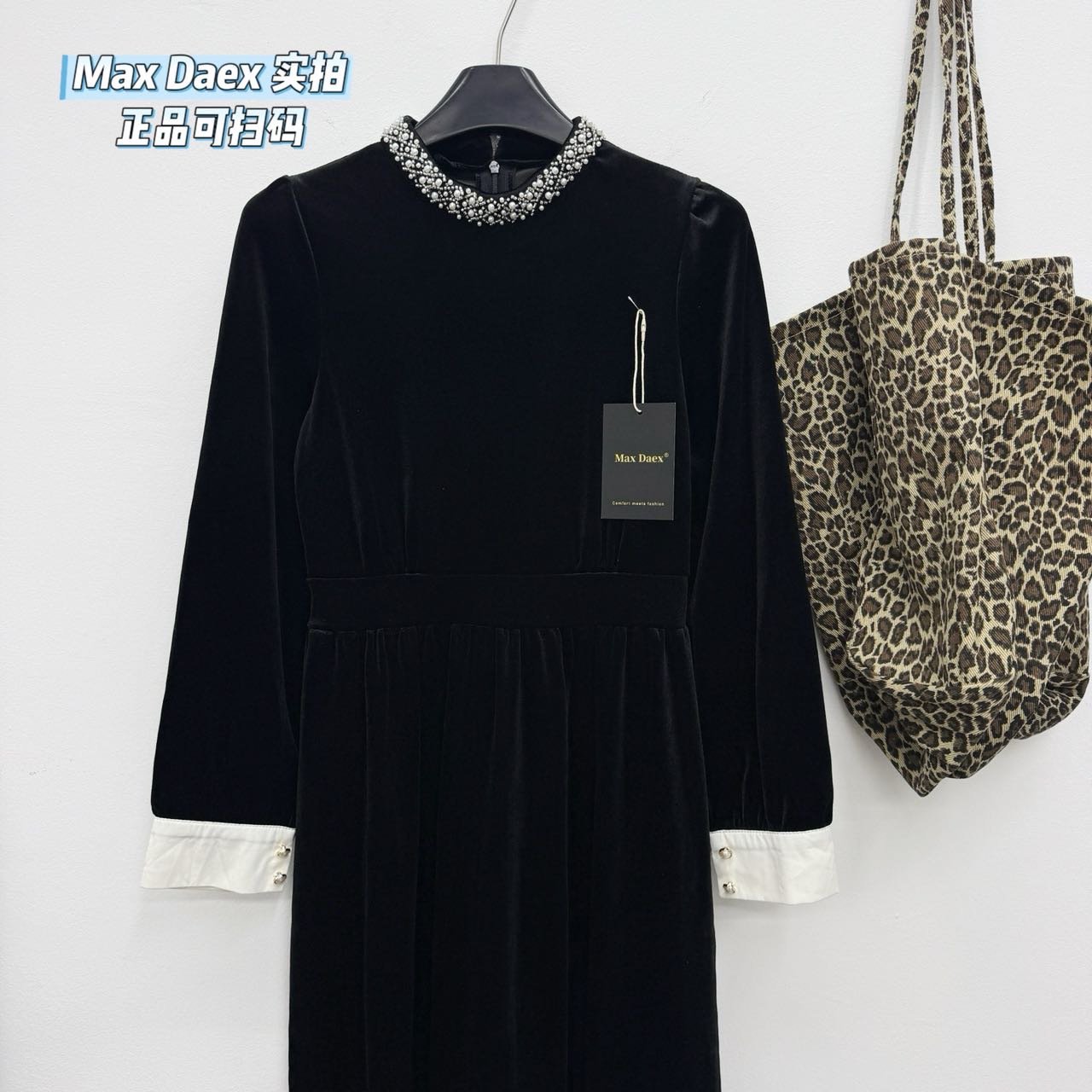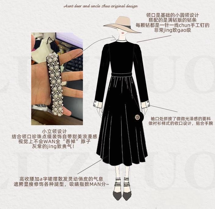 【Max Daex 法式优雅赫本风丝绒收腰连衣裙】满钻版钻条领口,绝美颈上星光!一针一线手工缝制!超重工!