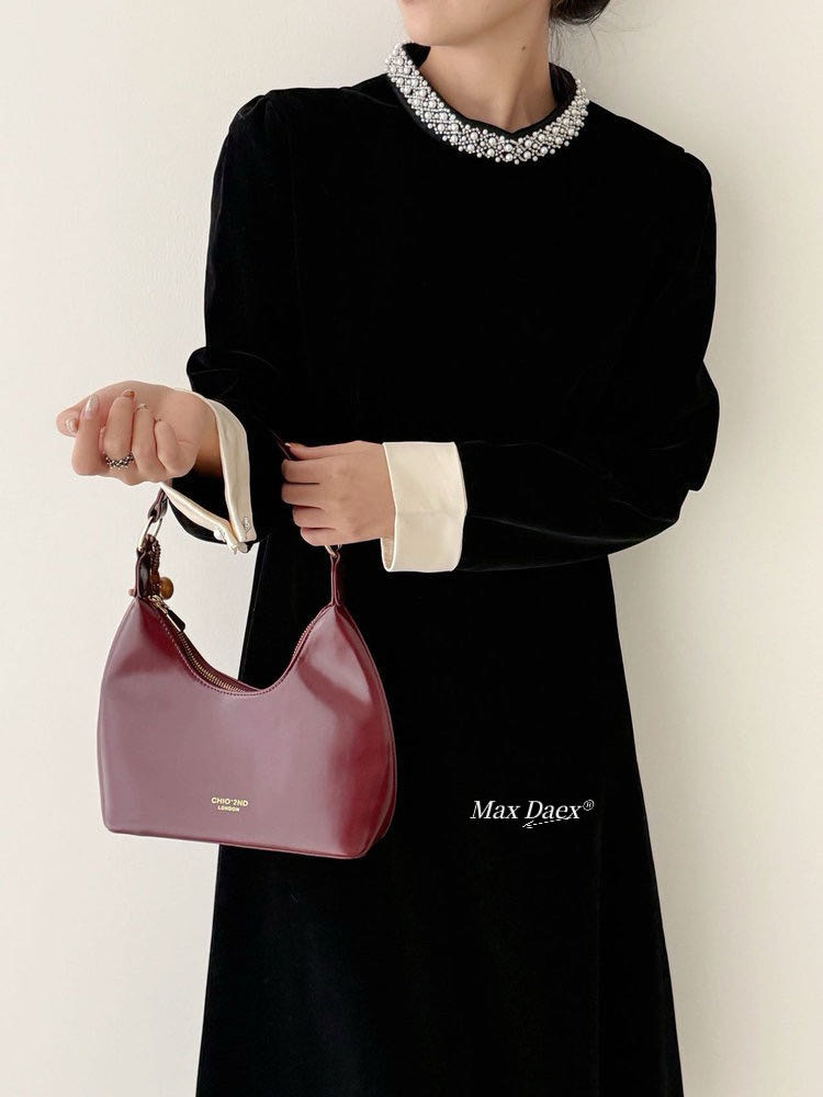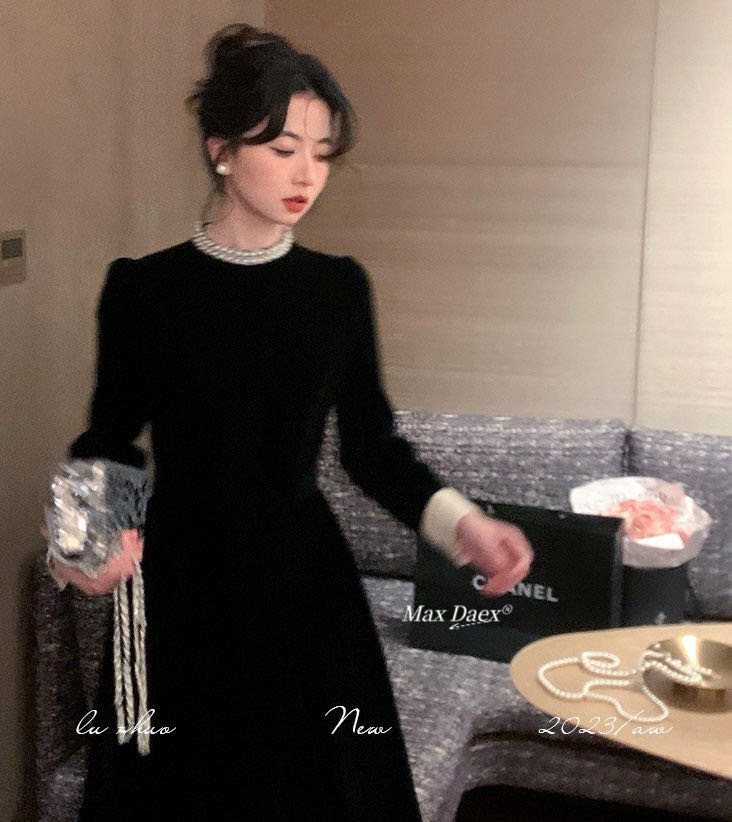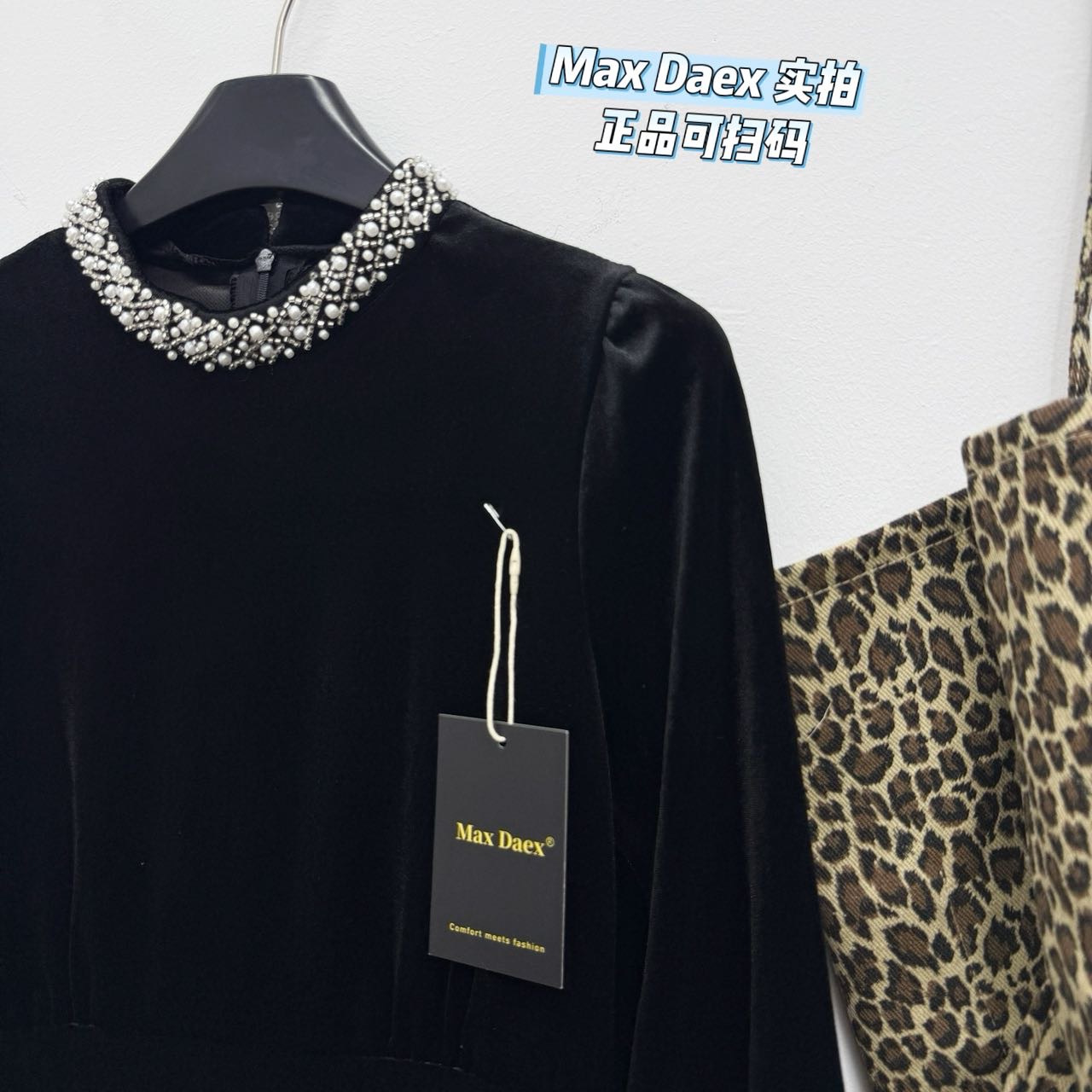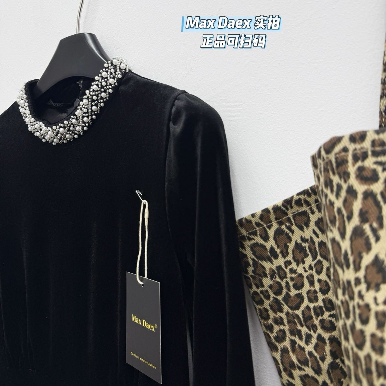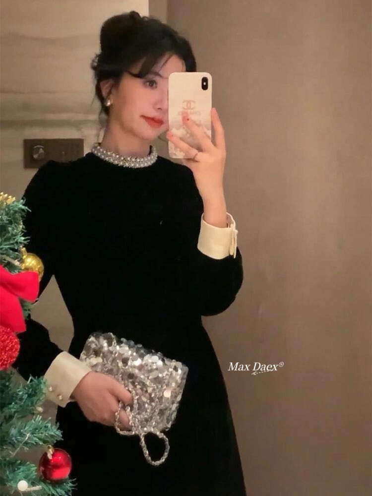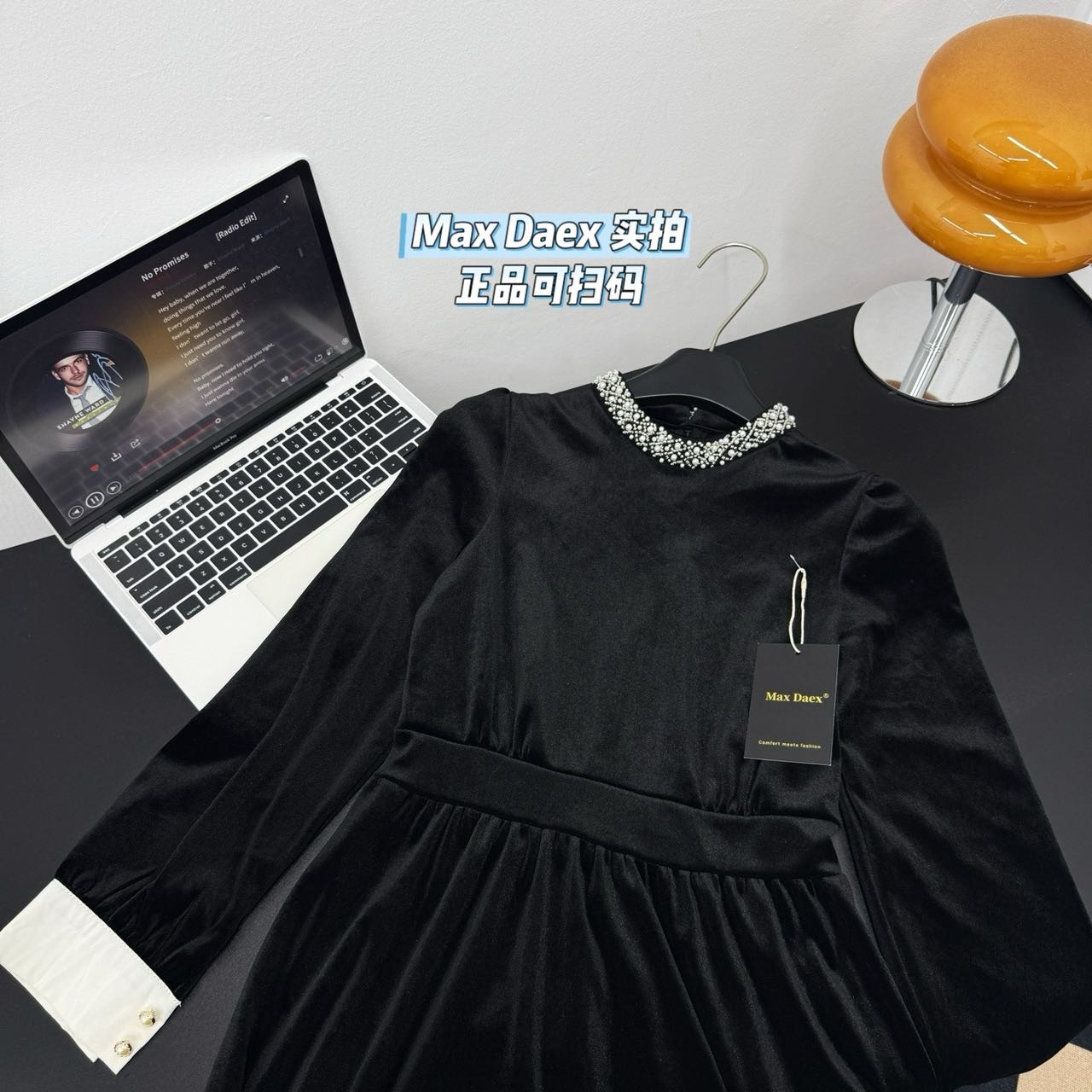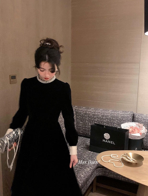 【Max Daex 法式优雅赫本风丝绒收腰连衣裙】满钻版钻条领口,绝美颈上星光!一针一线手工缝制!超重工!