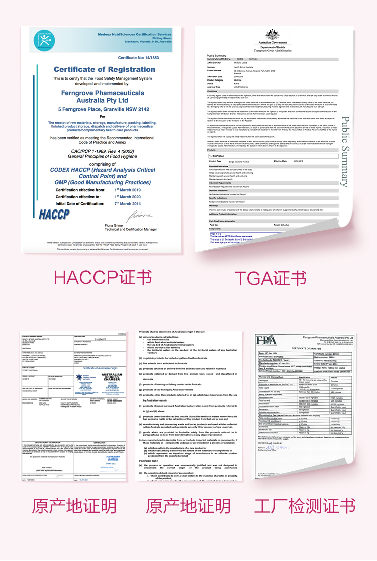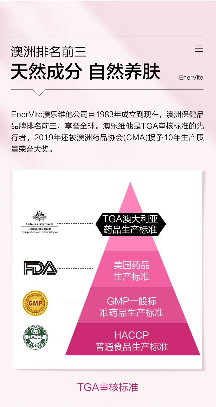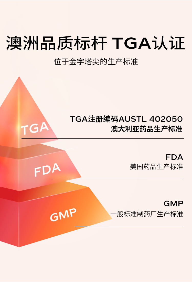 还有不得不提的是,这款产品是通过了澳洲药监局TGA审核的。TGA是世界上最严格的审核机制之一。如果说它处在要药监审核的金字塔顶端,那么欧盟认证和美国的FDA分别在金字塔顶尖第二第三阶梯的位置。原料都是纯天然的,对人体非常安全。